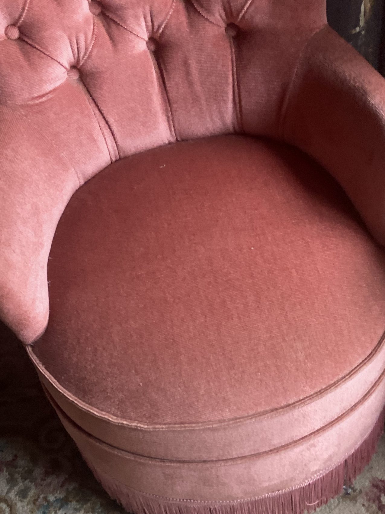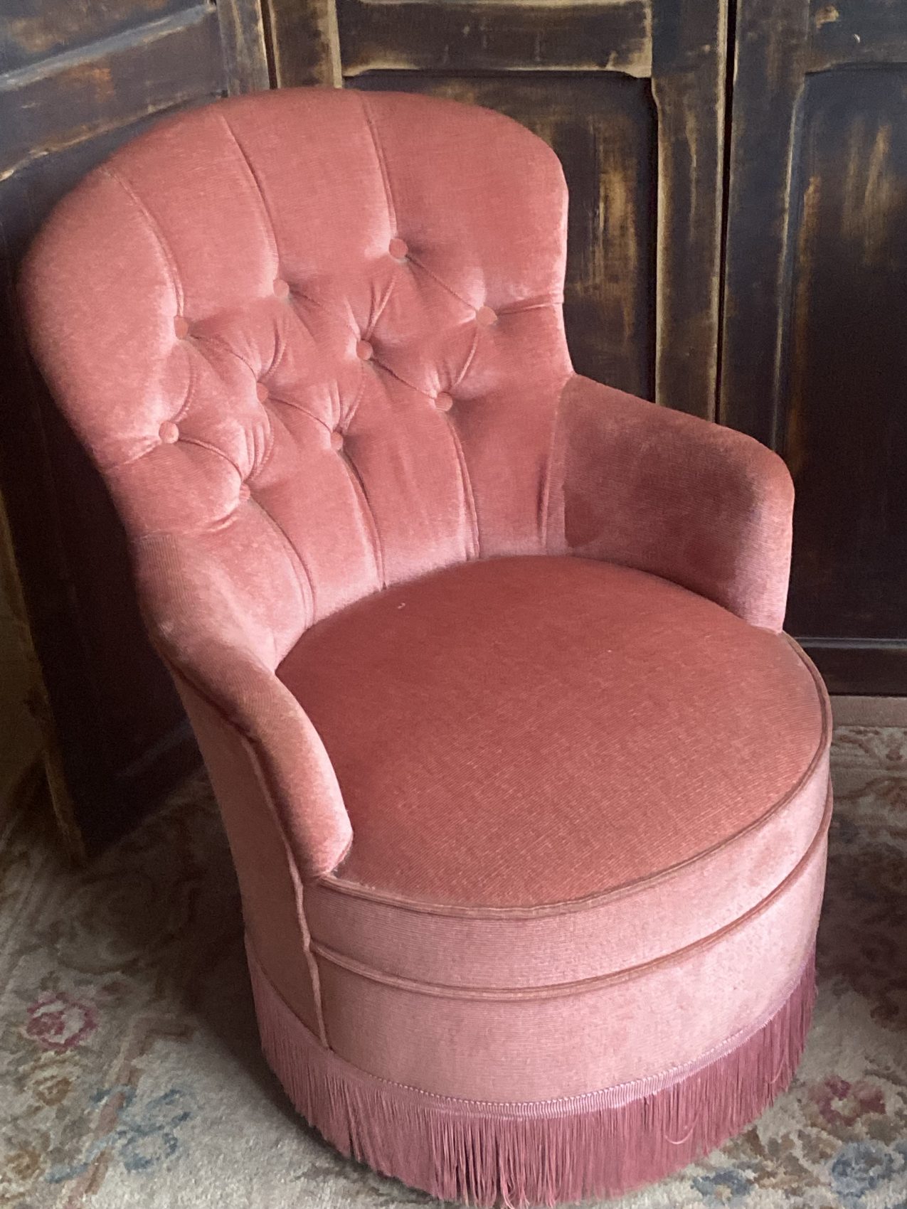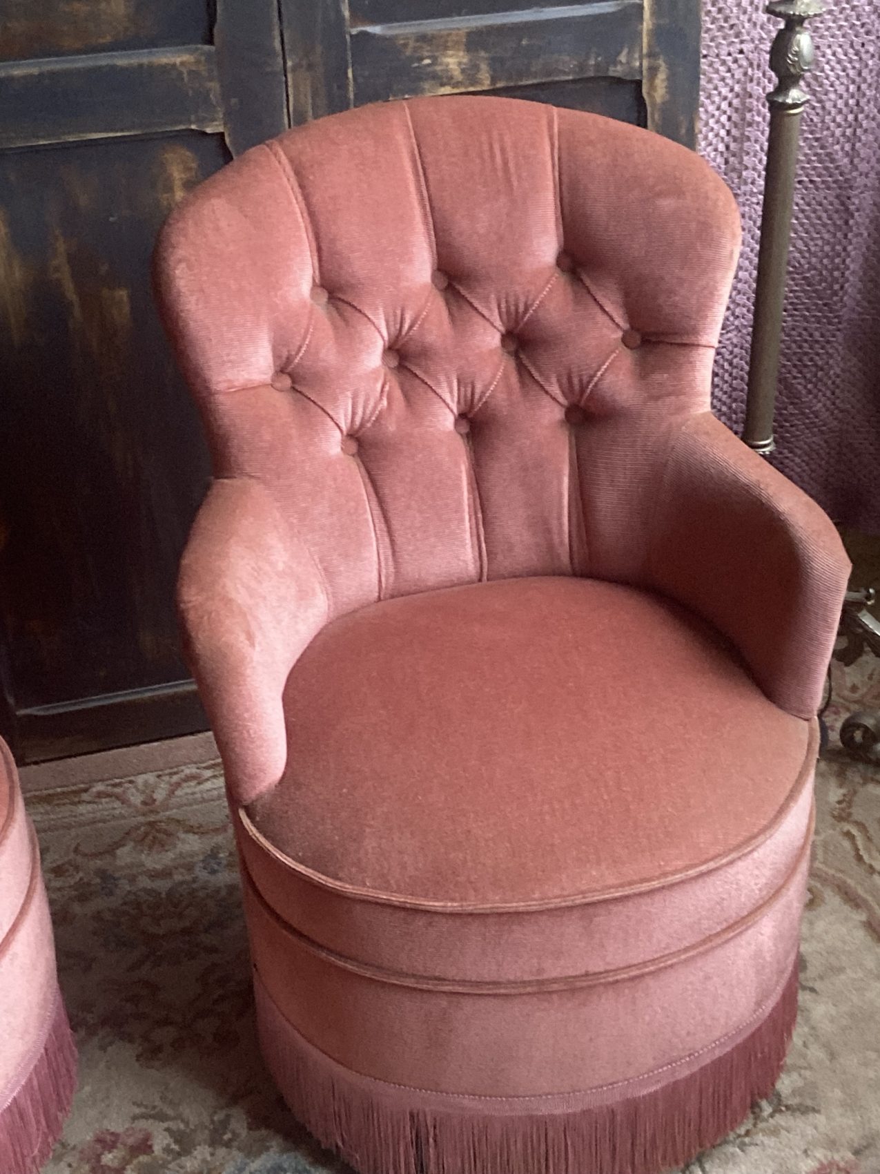 Paire de petits fauteuils crapauds capitonnés vintage en velours vieux rose – Années 60