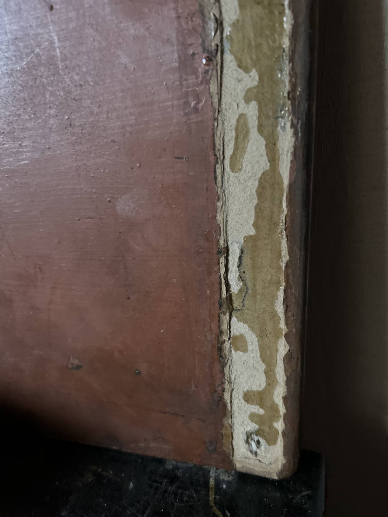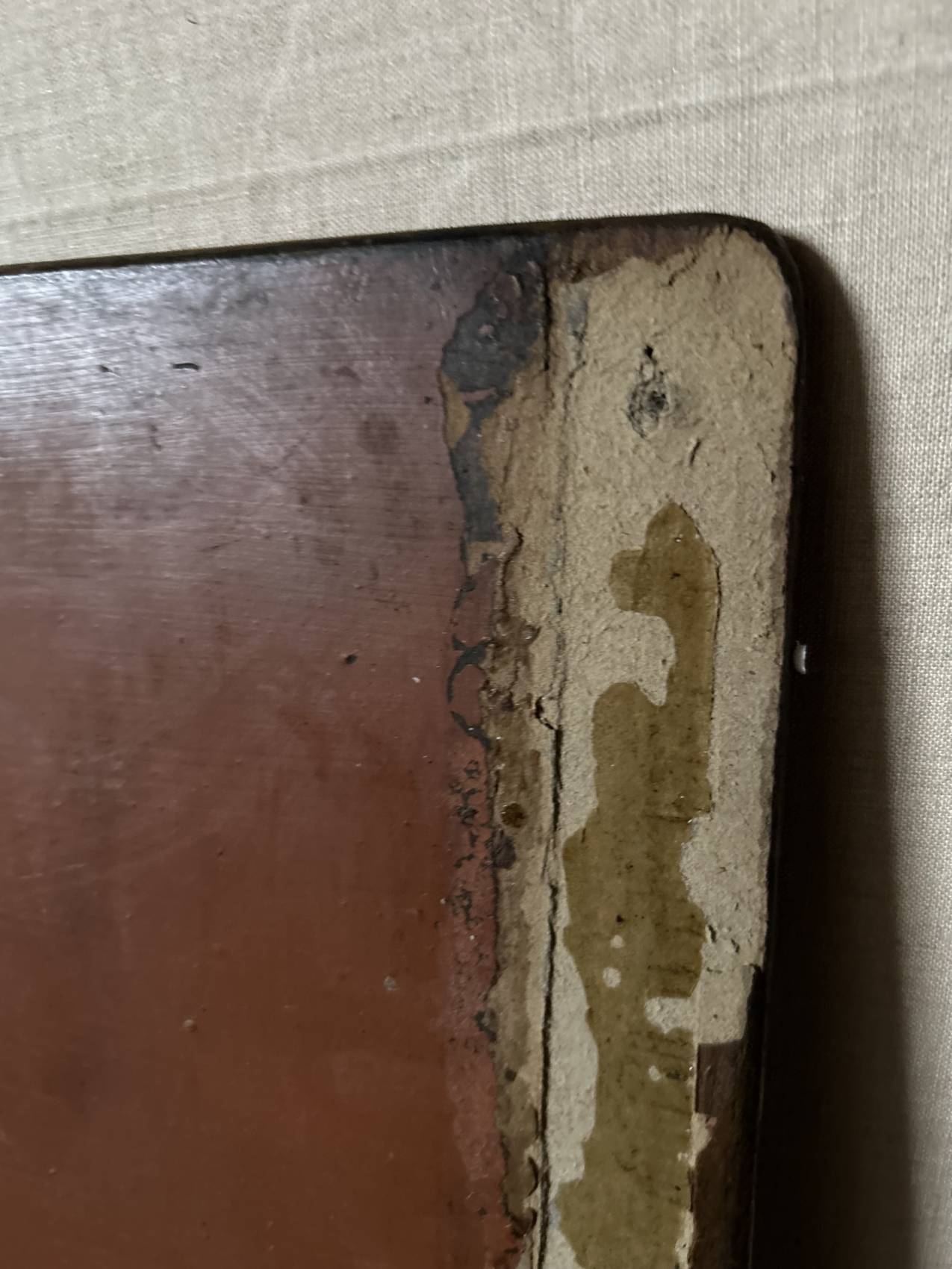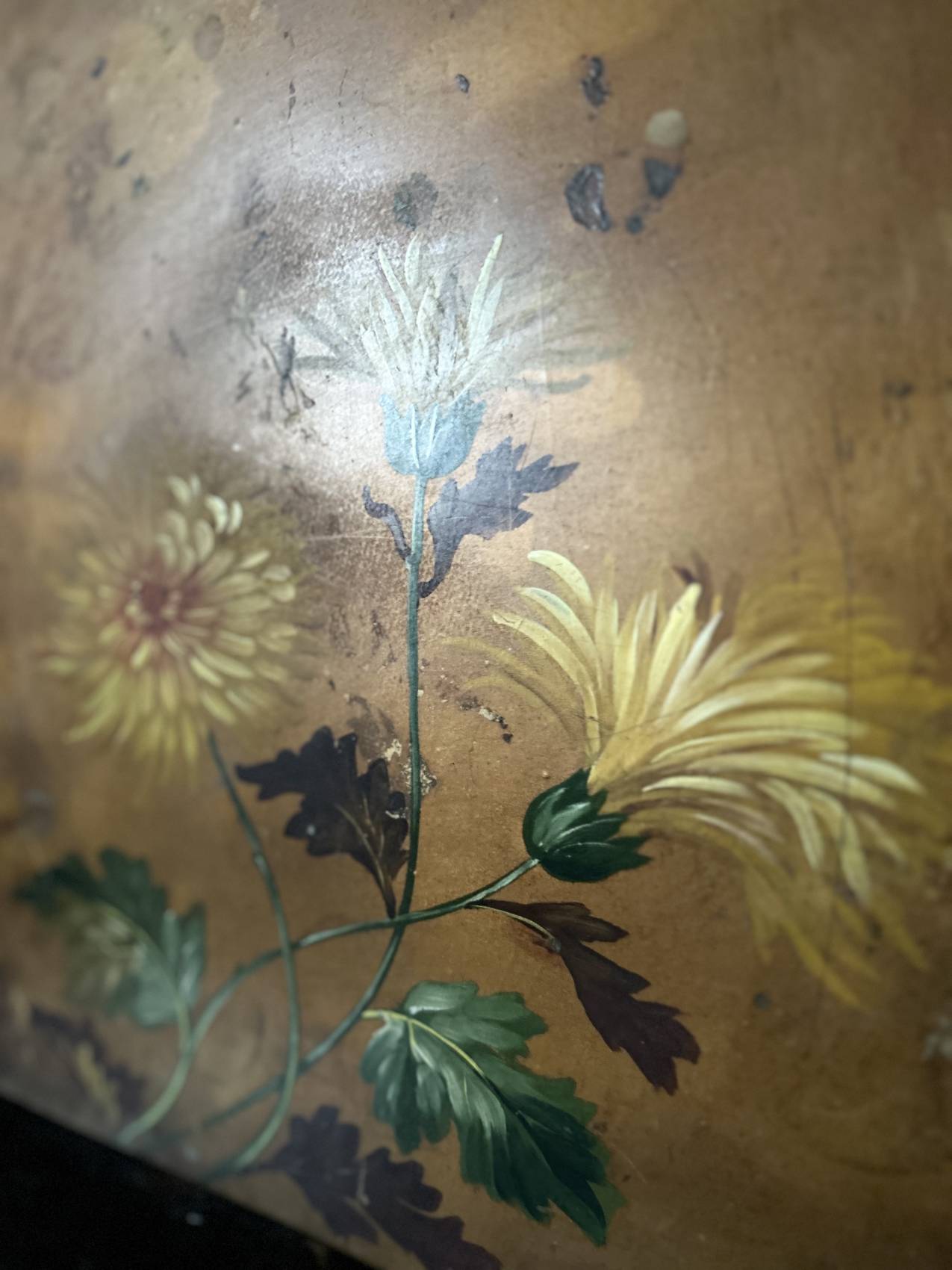 Ce panneau décoratif en bois, daté autour de 1900, dévoile un décor floral peint à la main, délicat, un brin romantique. Les couleurs ont doucement traversé le siècle. La patine est légère. Les traces du temps sont là. Juste ce qu’il faut.