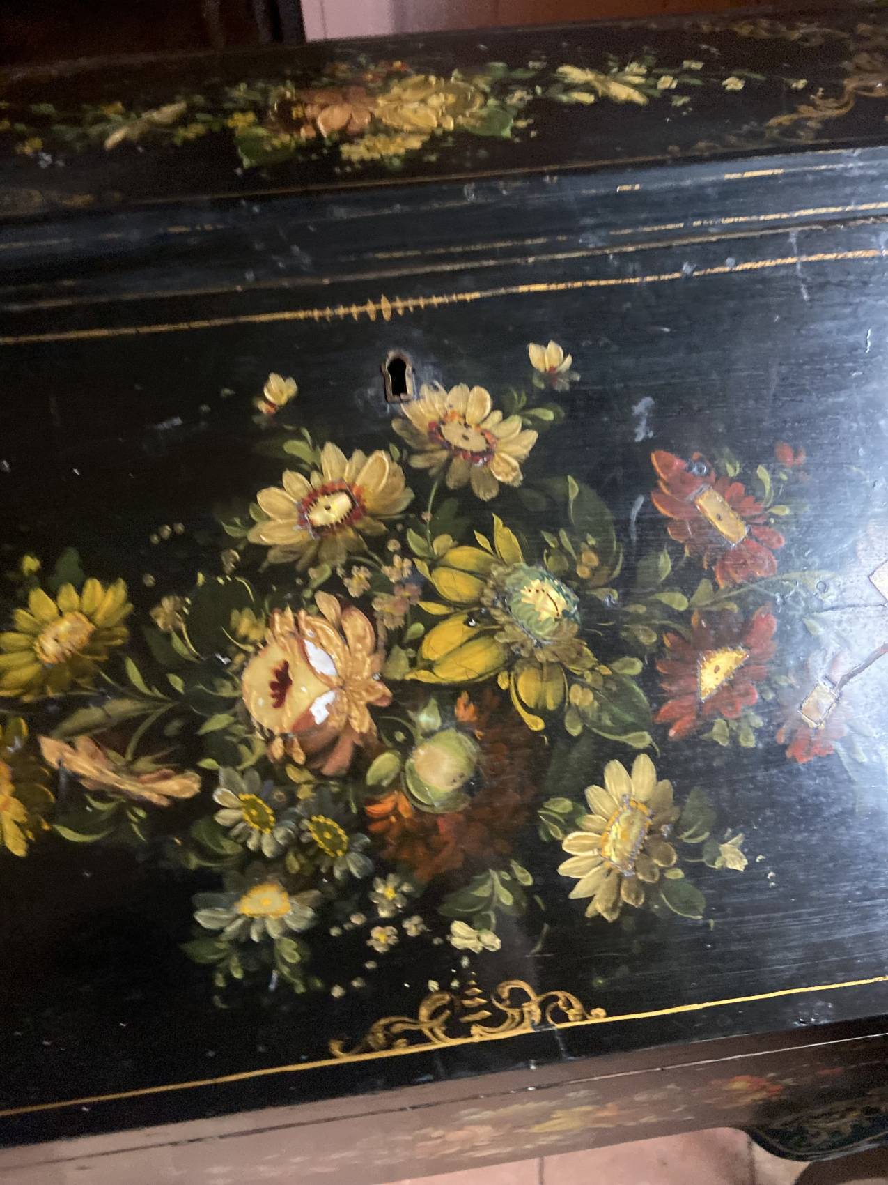 Les motifs floraux, emblèmes du style, sont réalisés en marqueterie ou peints à la main, offrant un contraste élégant avec le fond du bois.