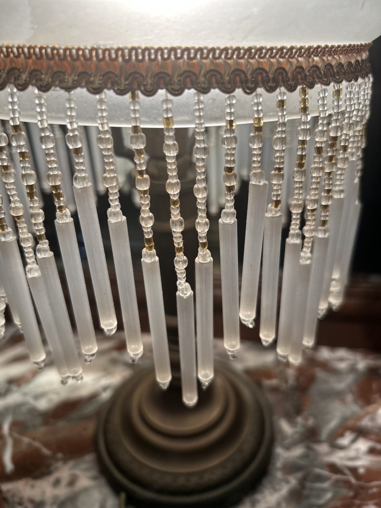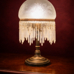 Le bas de l’abat-jour est orné de perles en verre formant une frange élégante.