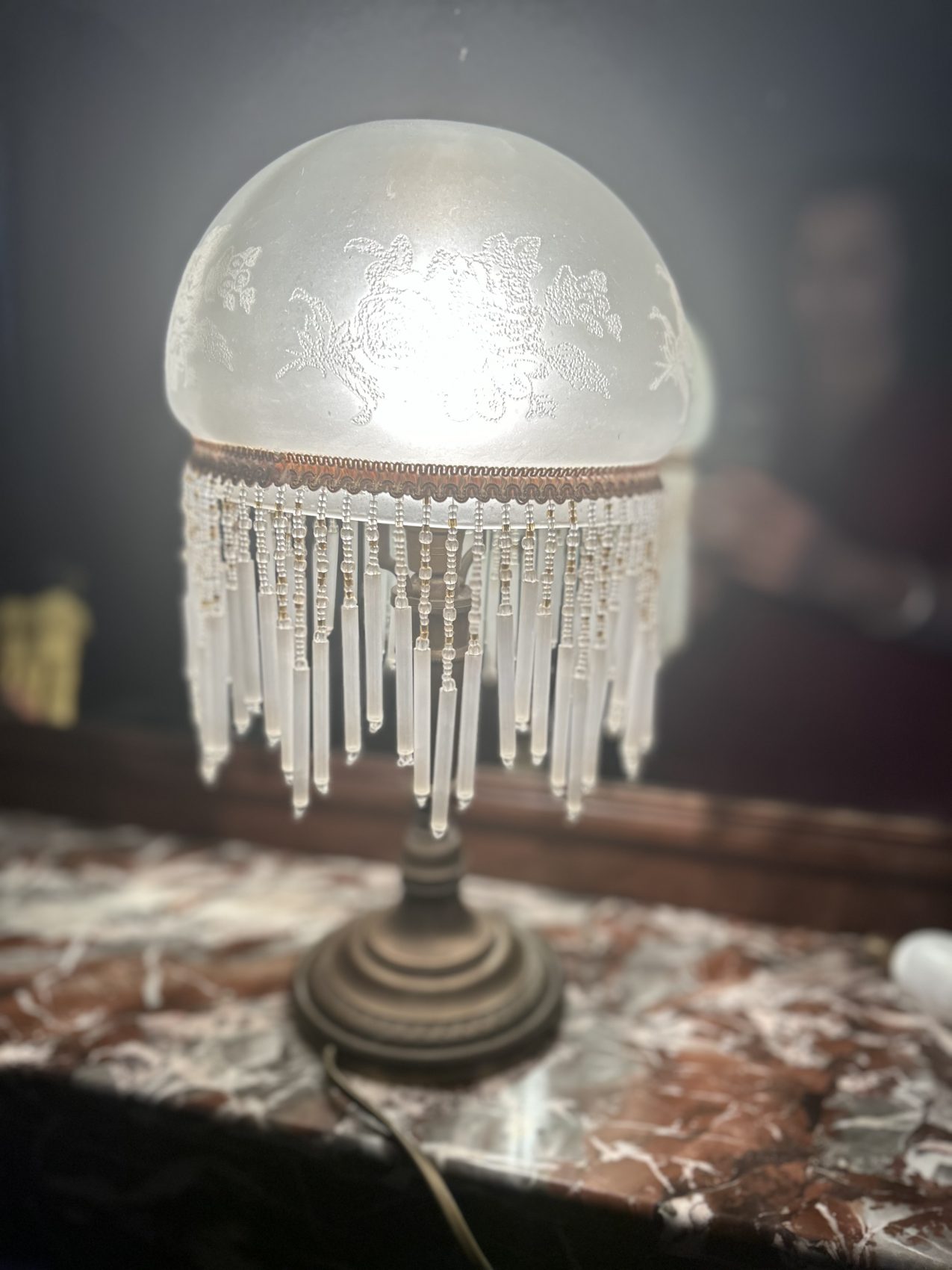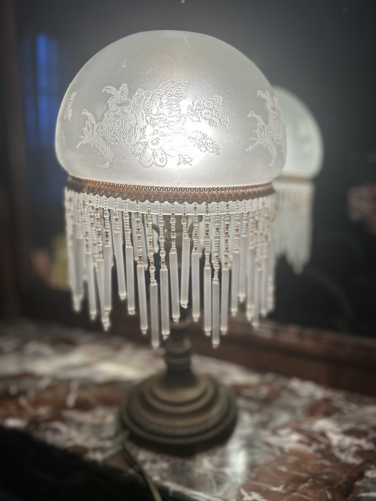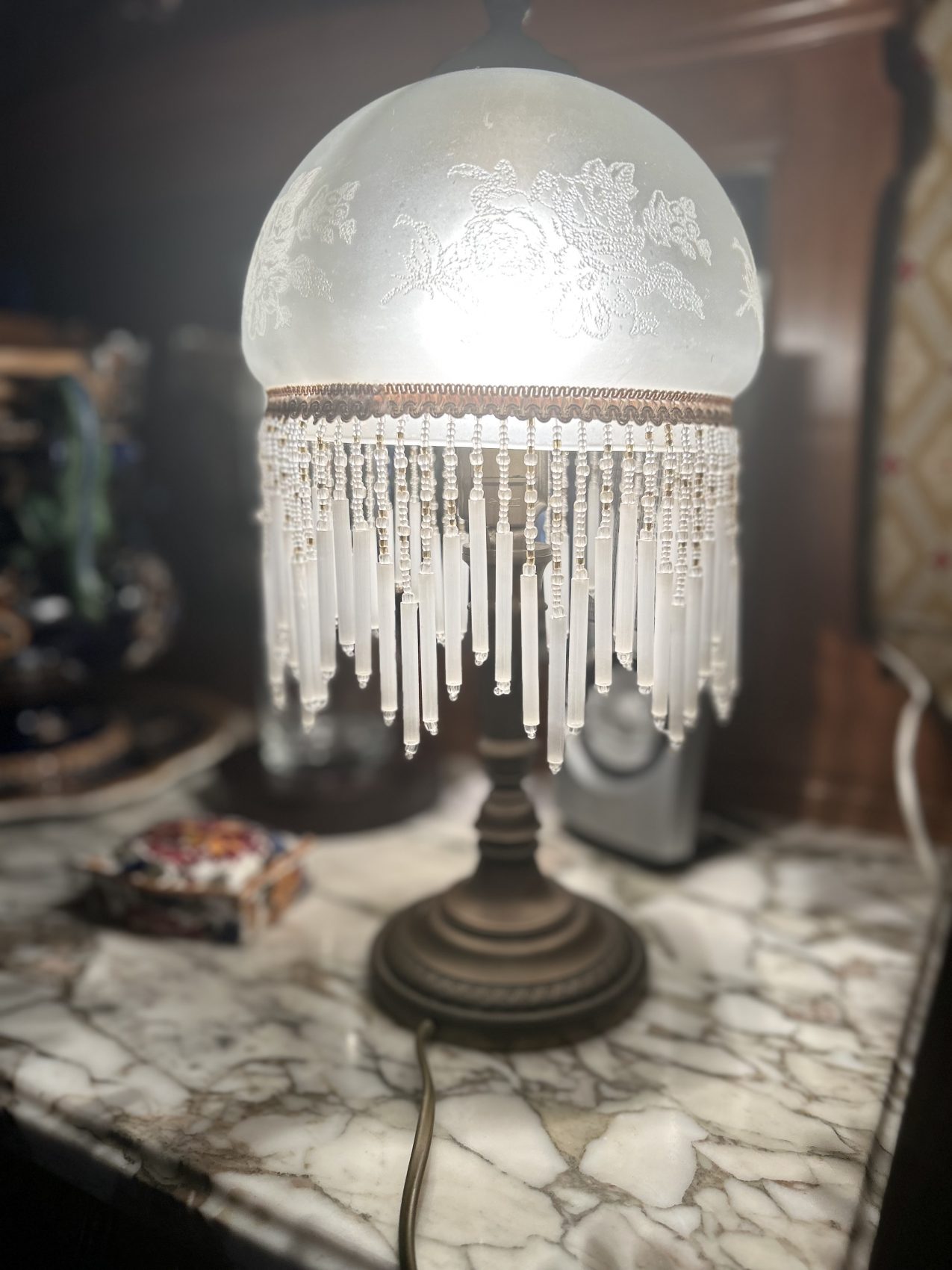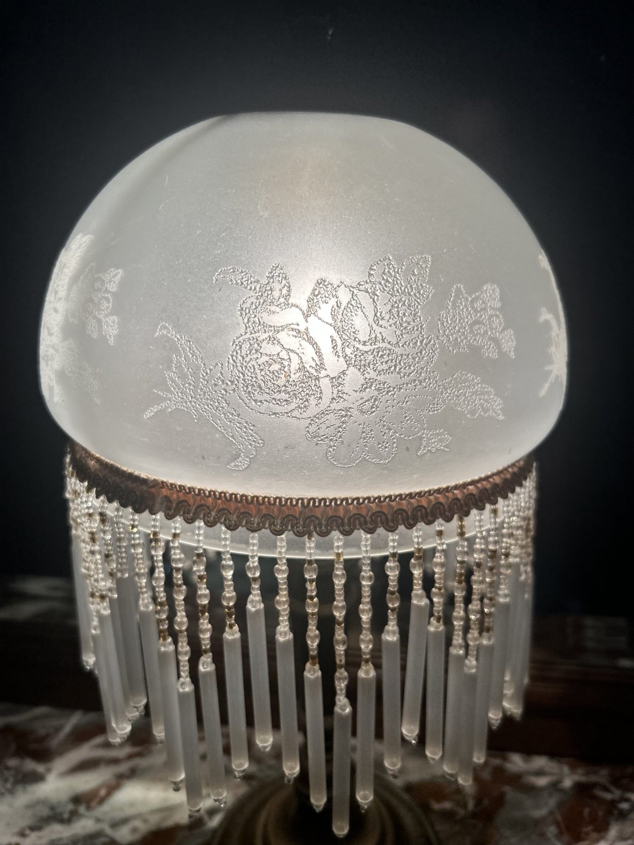 Petite lampe charleston ancienne en verre et perles- blanche à fleurs gravés