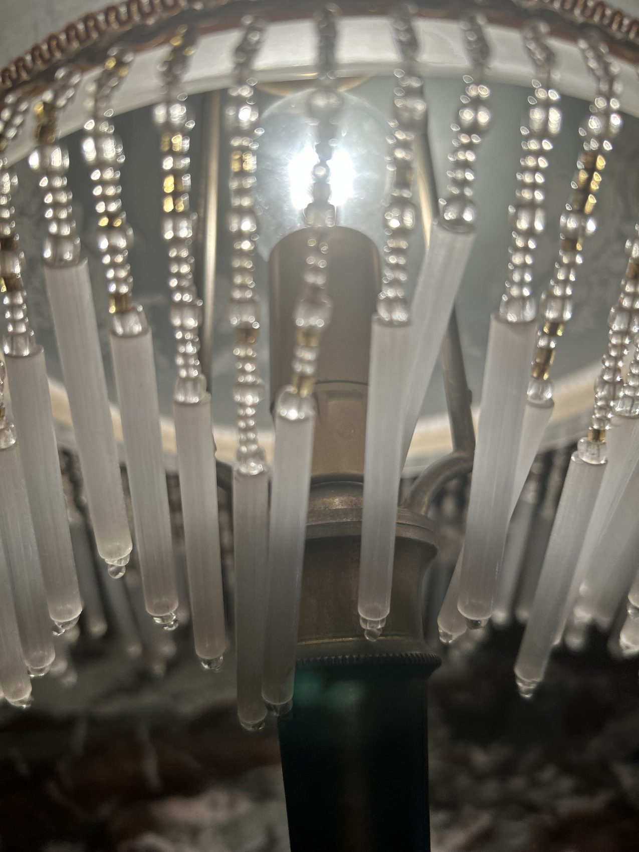 Pour son style ancien authentique avec son abat-jour en verre et perles on l’a choisi aussi pour sa lumière douce et reposante