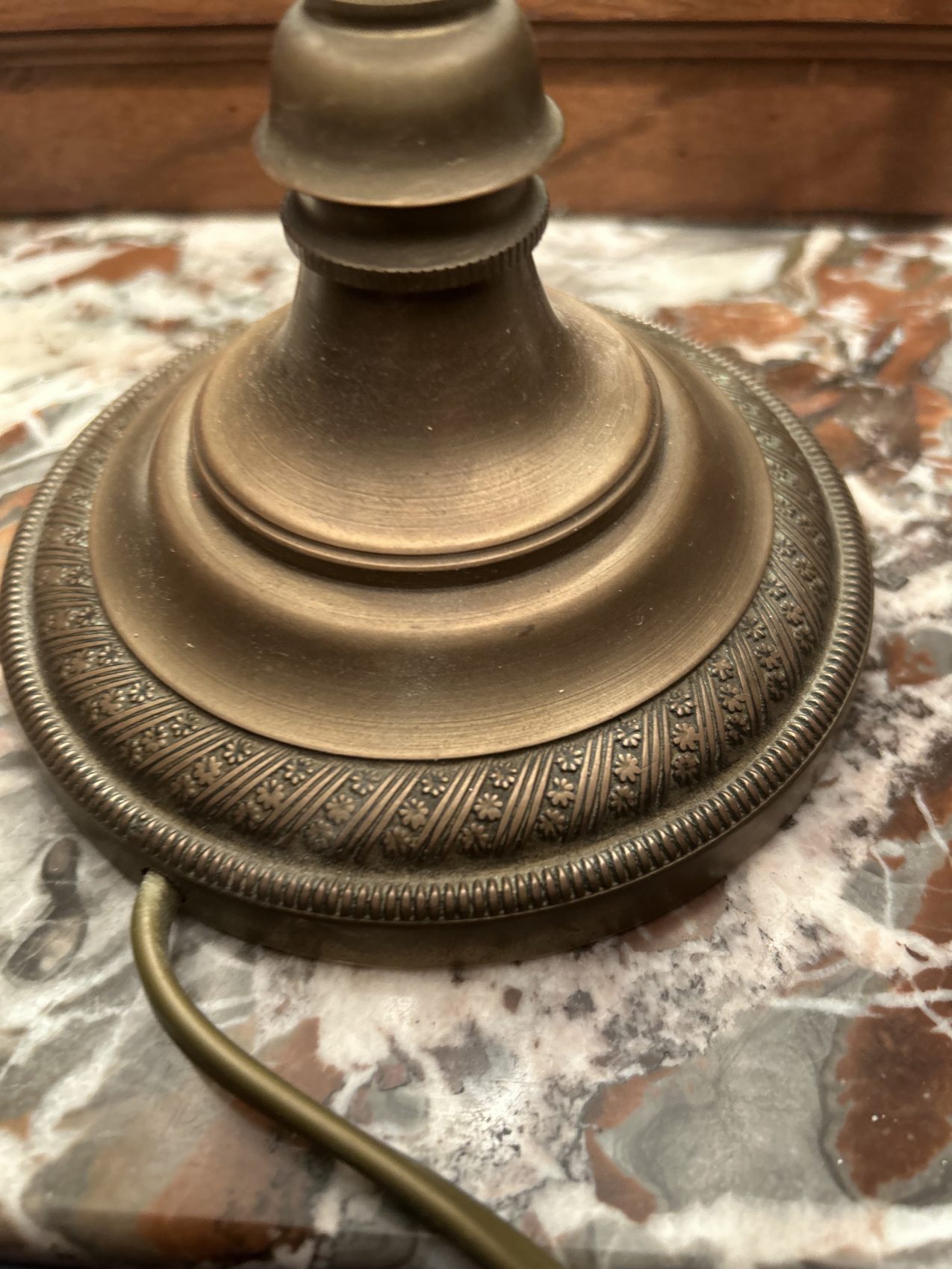 Le pied de cette lampe est en laiton, il est dans son jus et peut être re nettoyé si vous préférez l’avoir plus brillant, il est préférable de mettre une ampoule à led ou de faible puissance sur cette lampe.