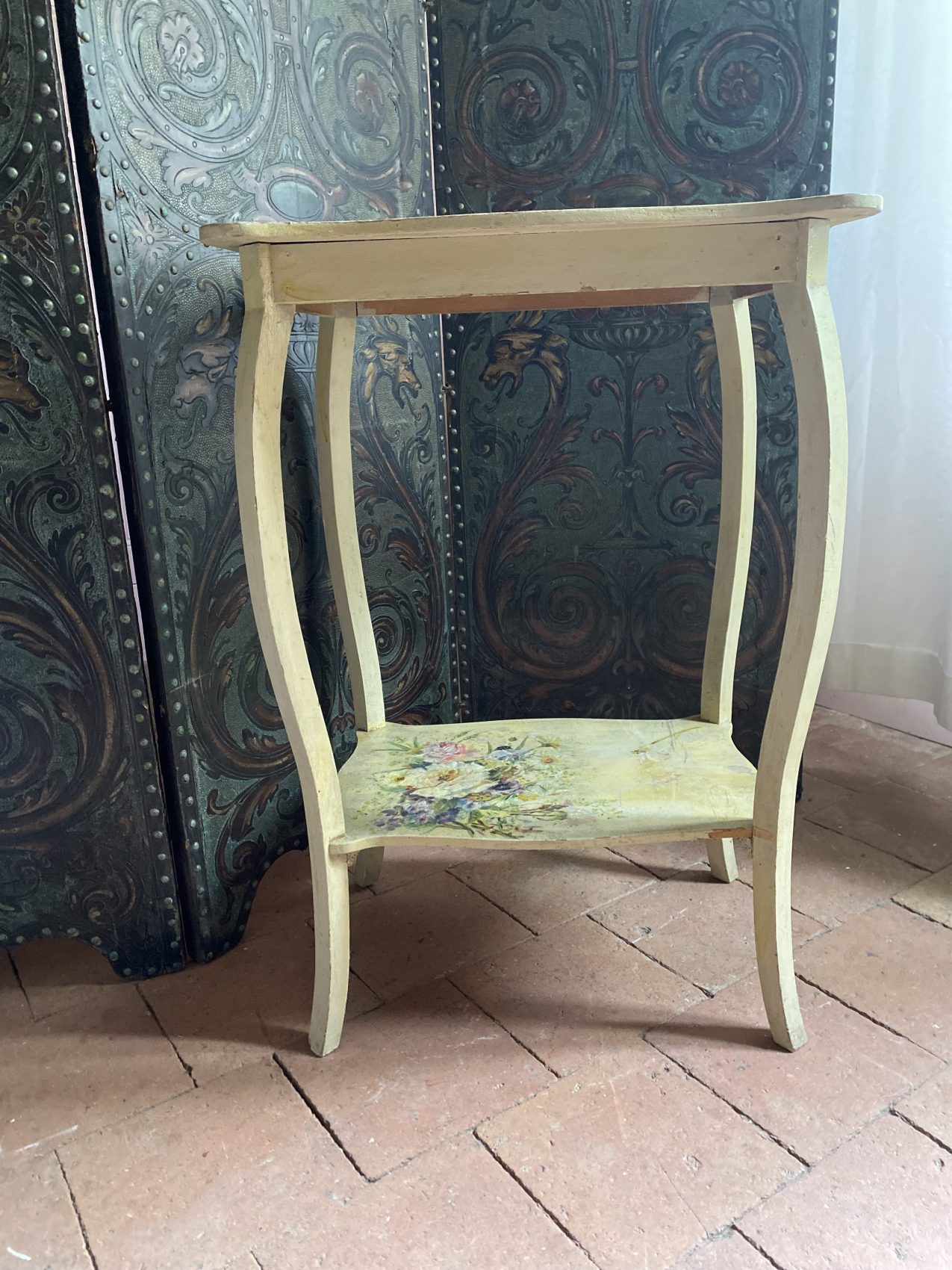 Piétement en bois cintré, patine crème d’origine.