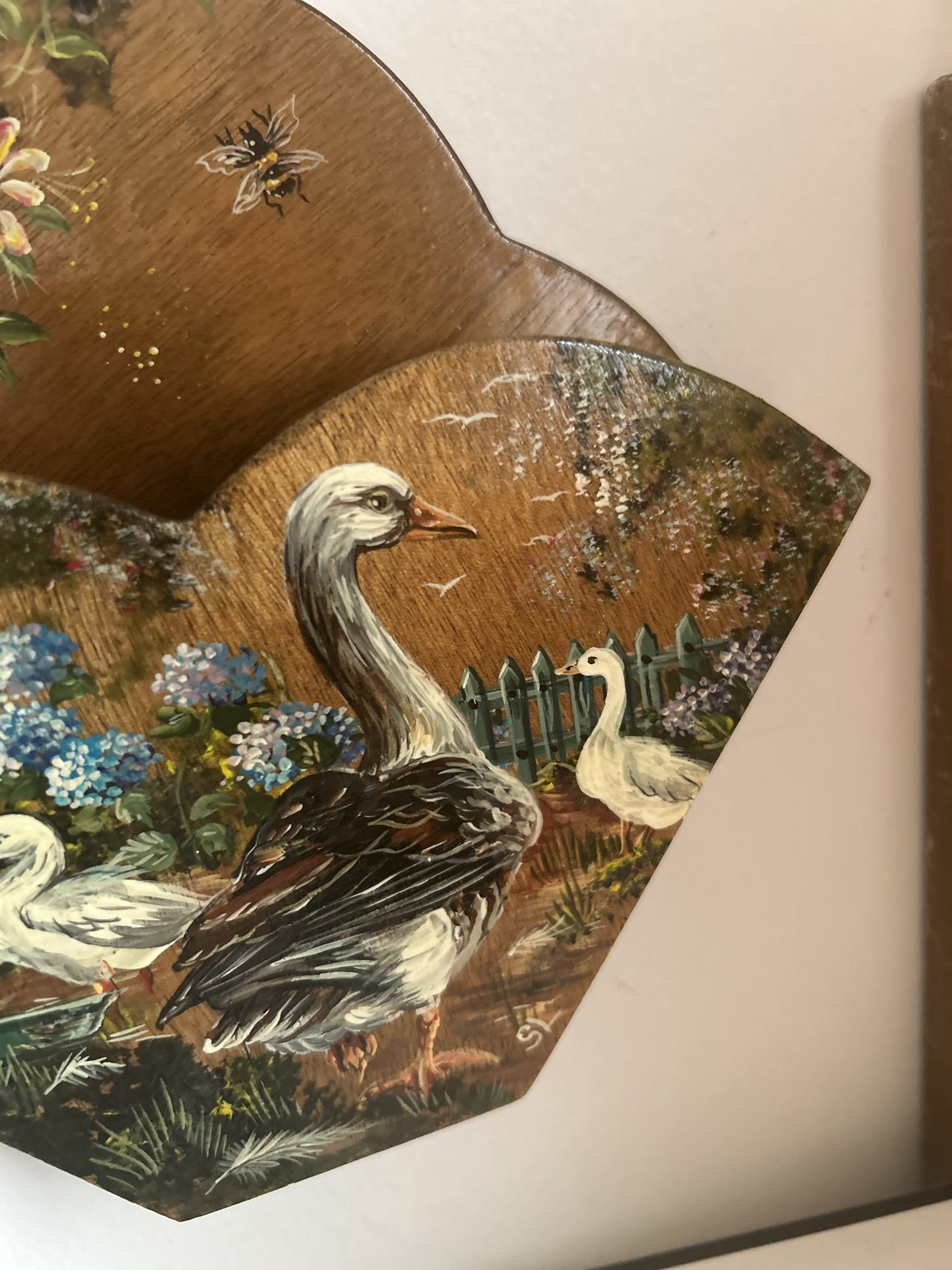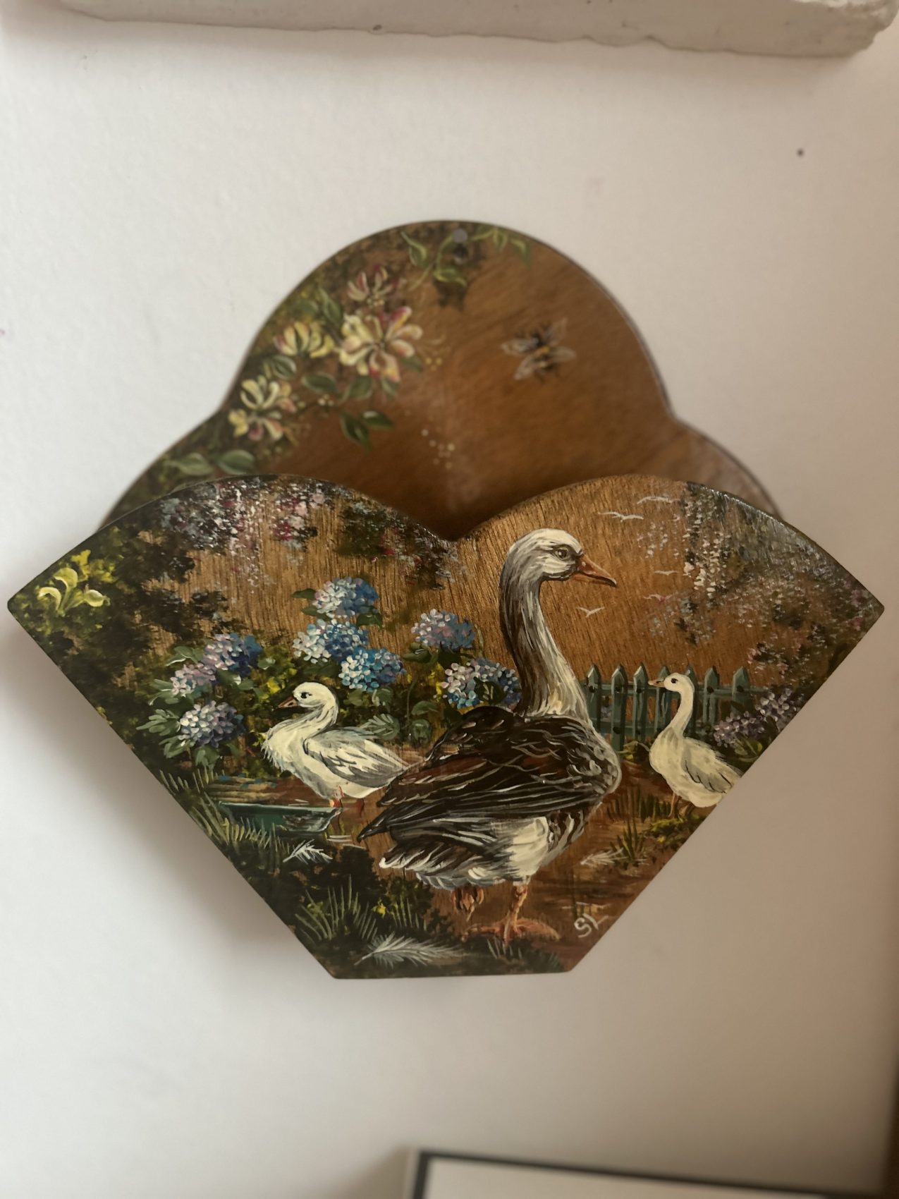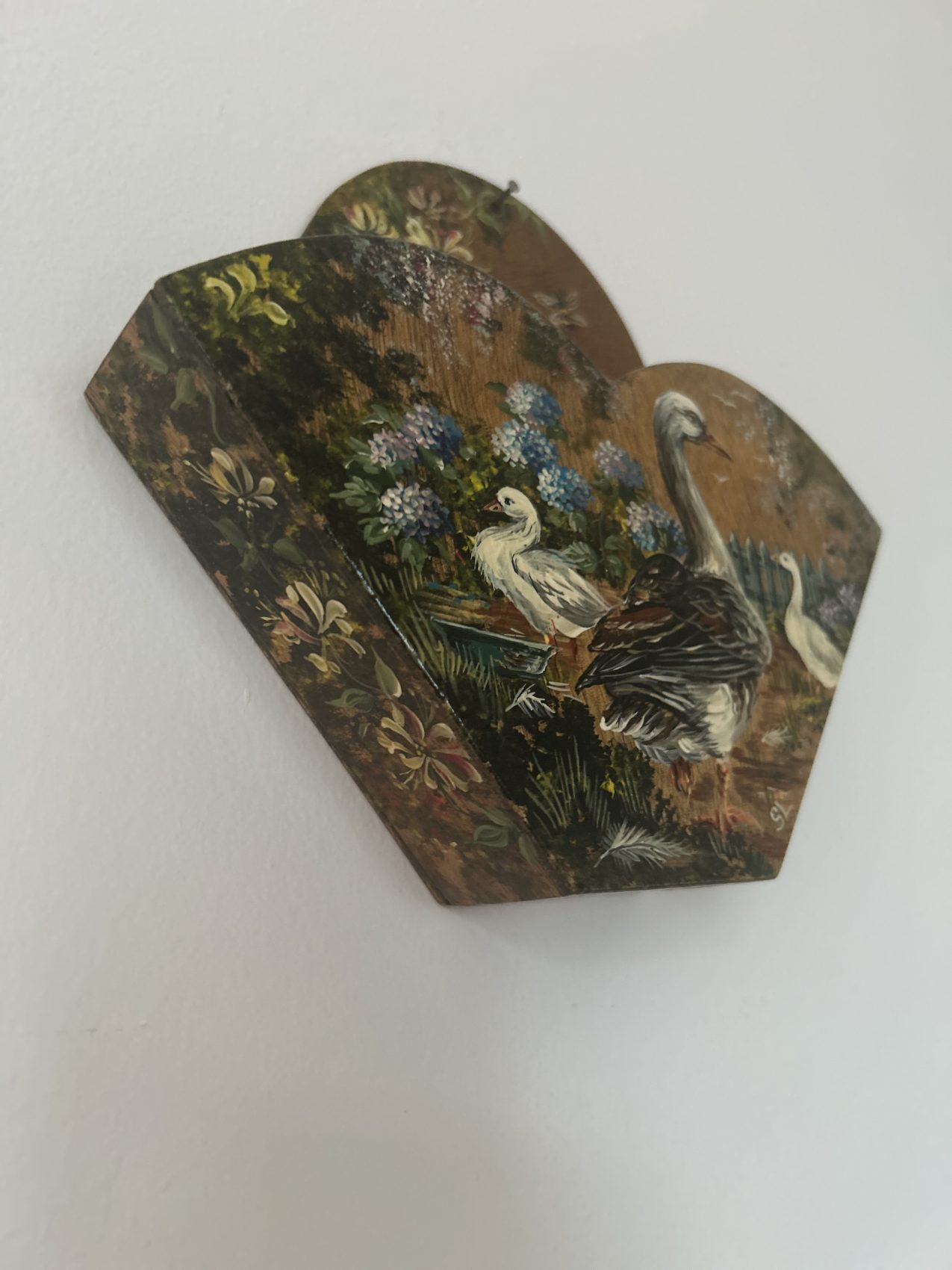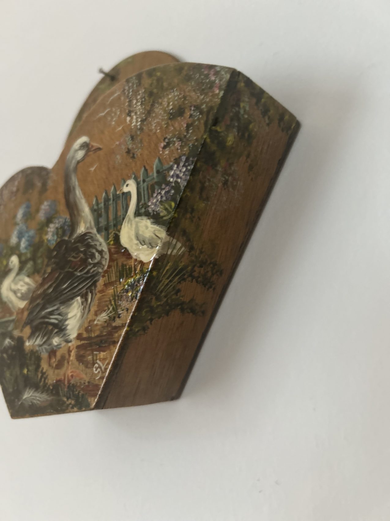 Porte courrier ancien en bois peint – Époque 1900 – Motifs d’ Oies de la ferme