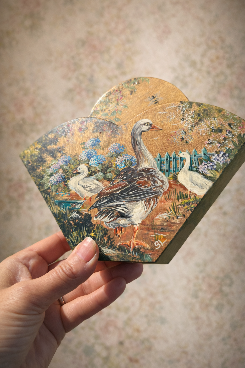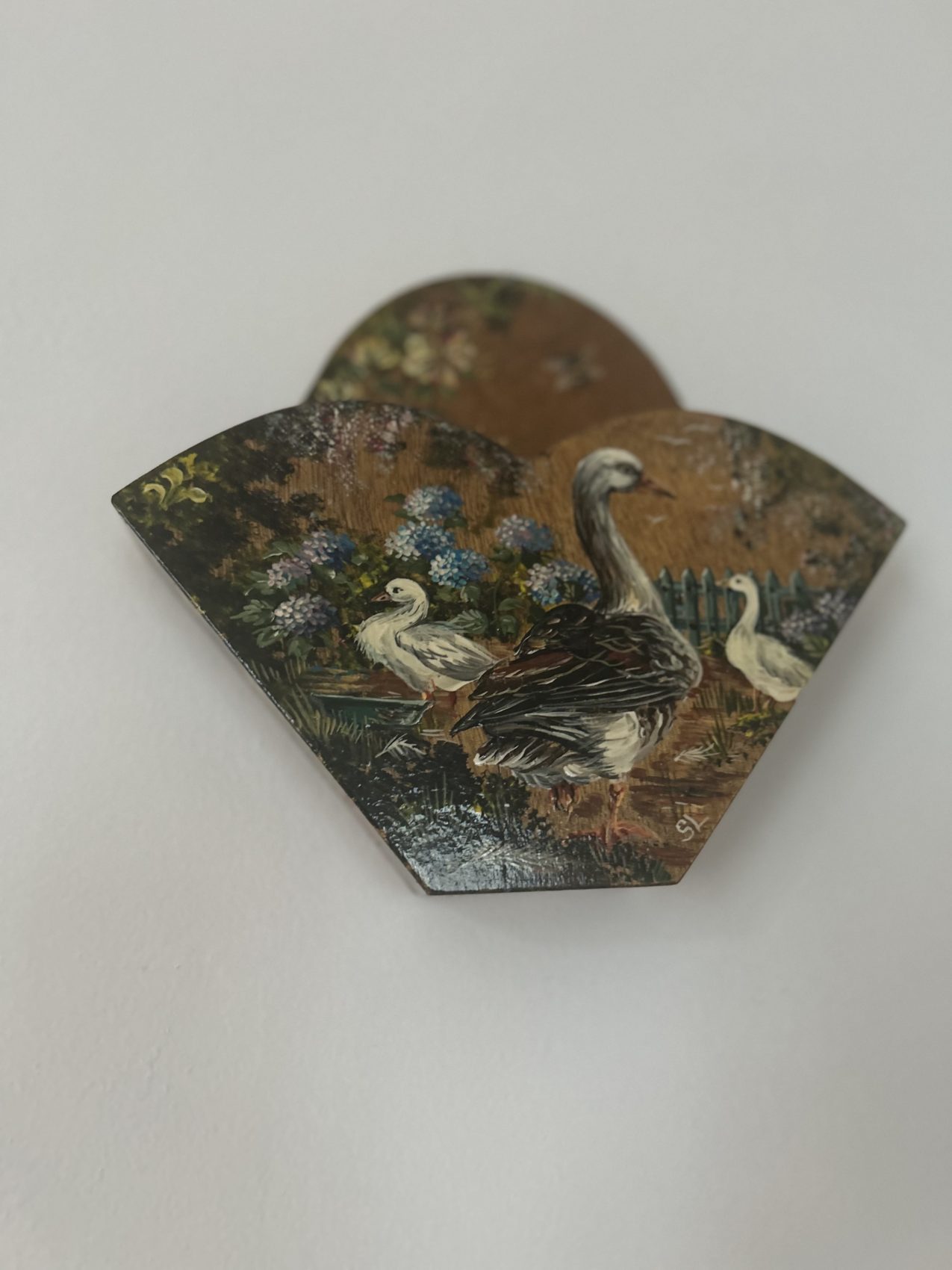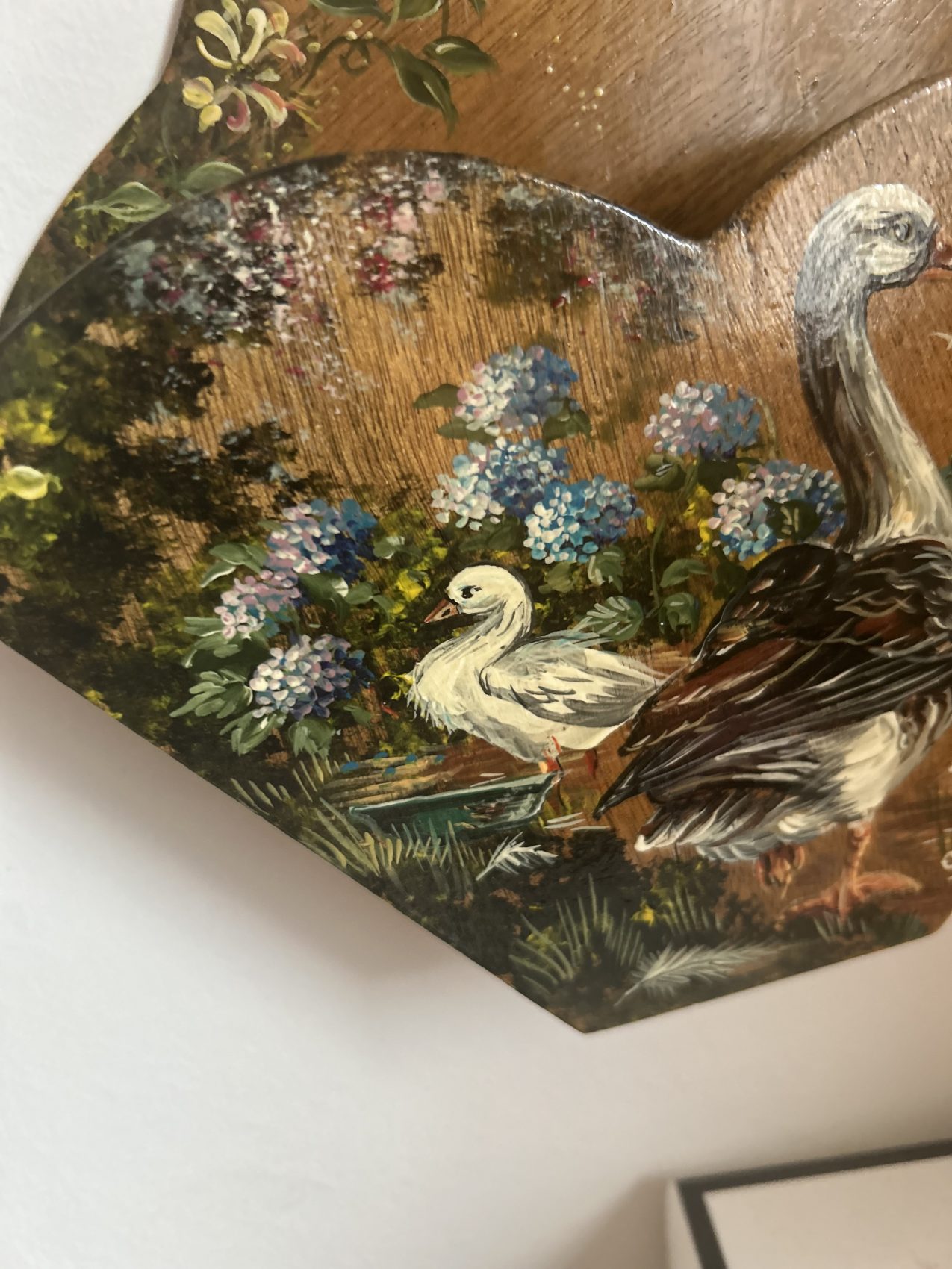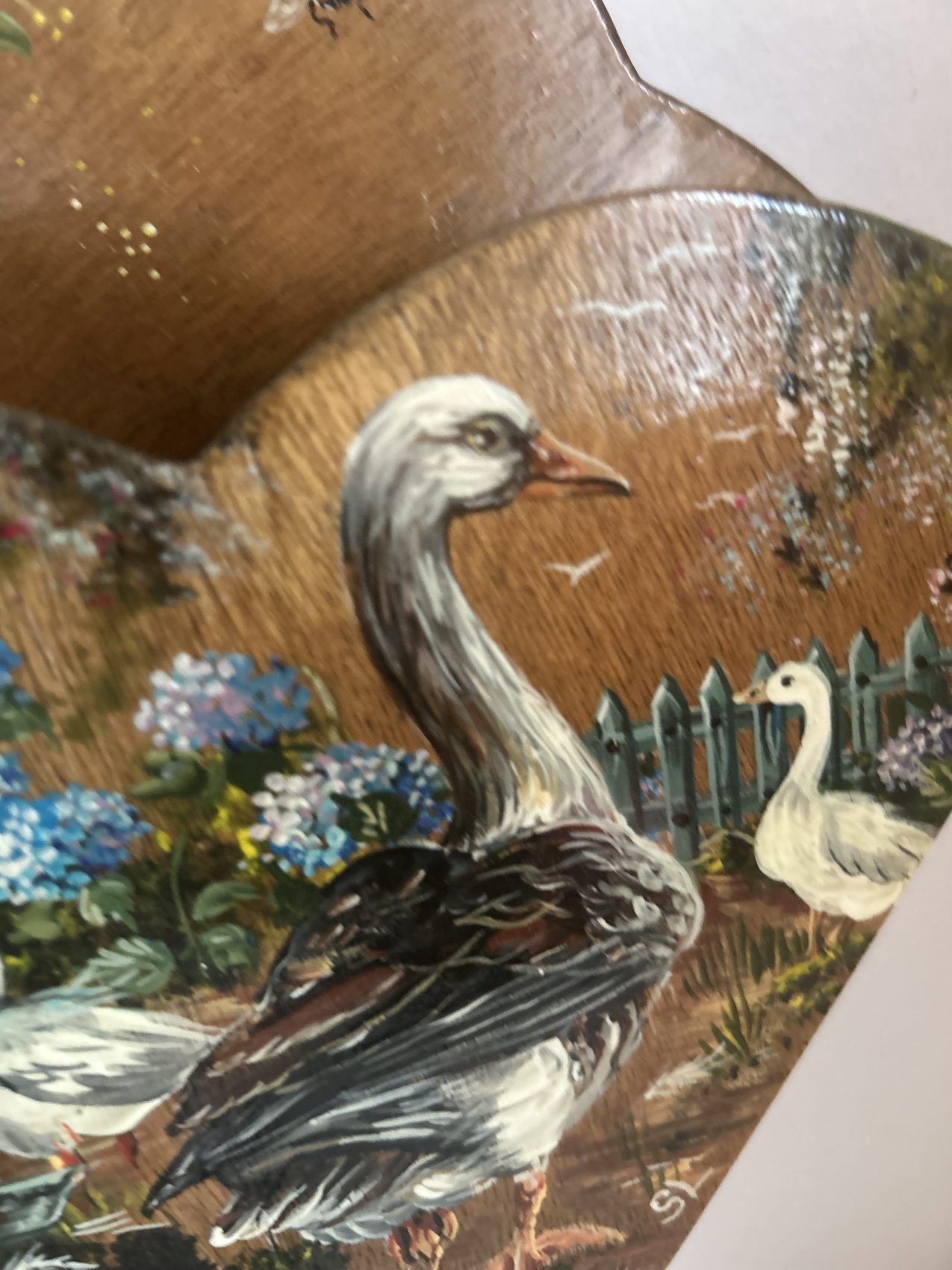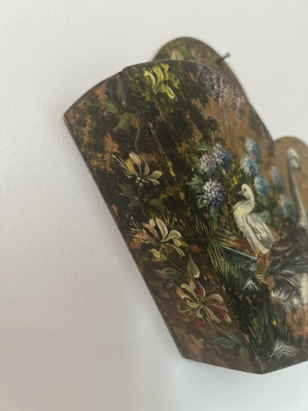 Porte courrier ancien en bois peint – Époque 1900 – Motifs d’ Oies de la ferme