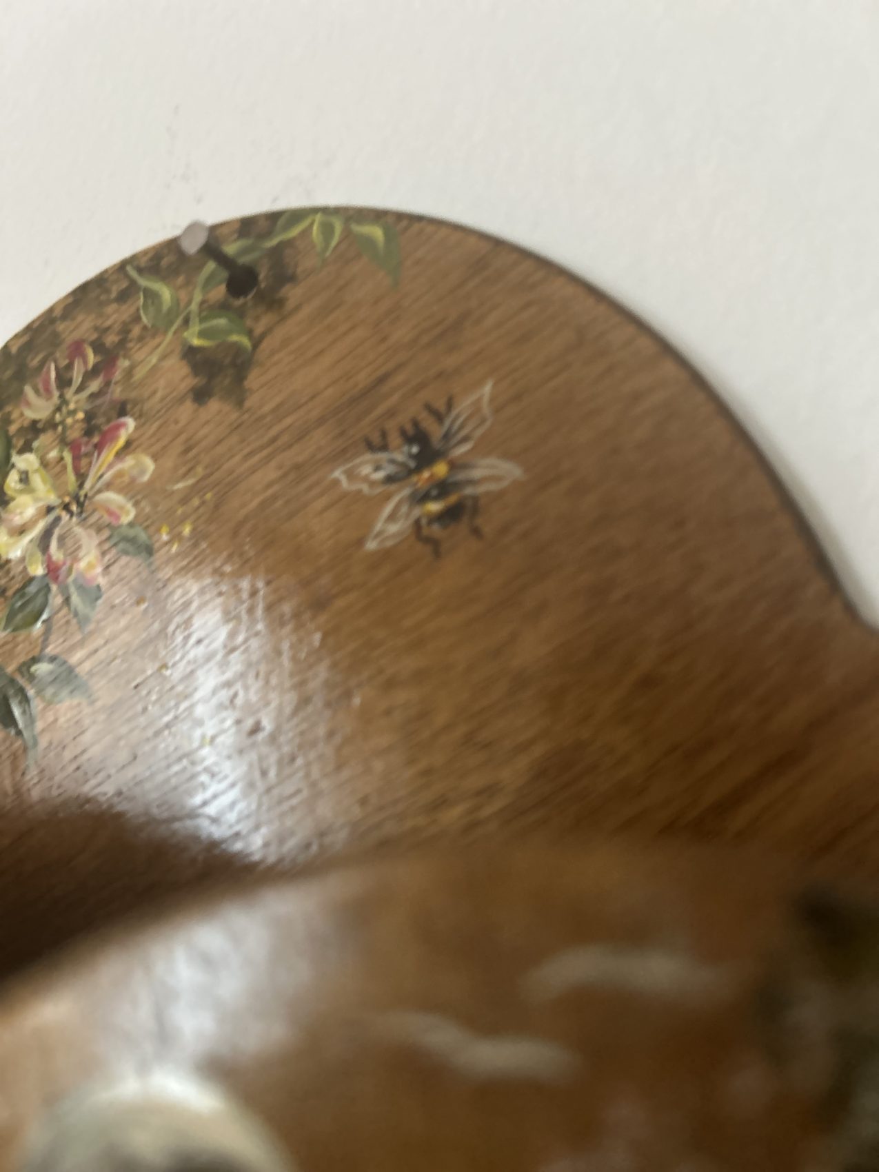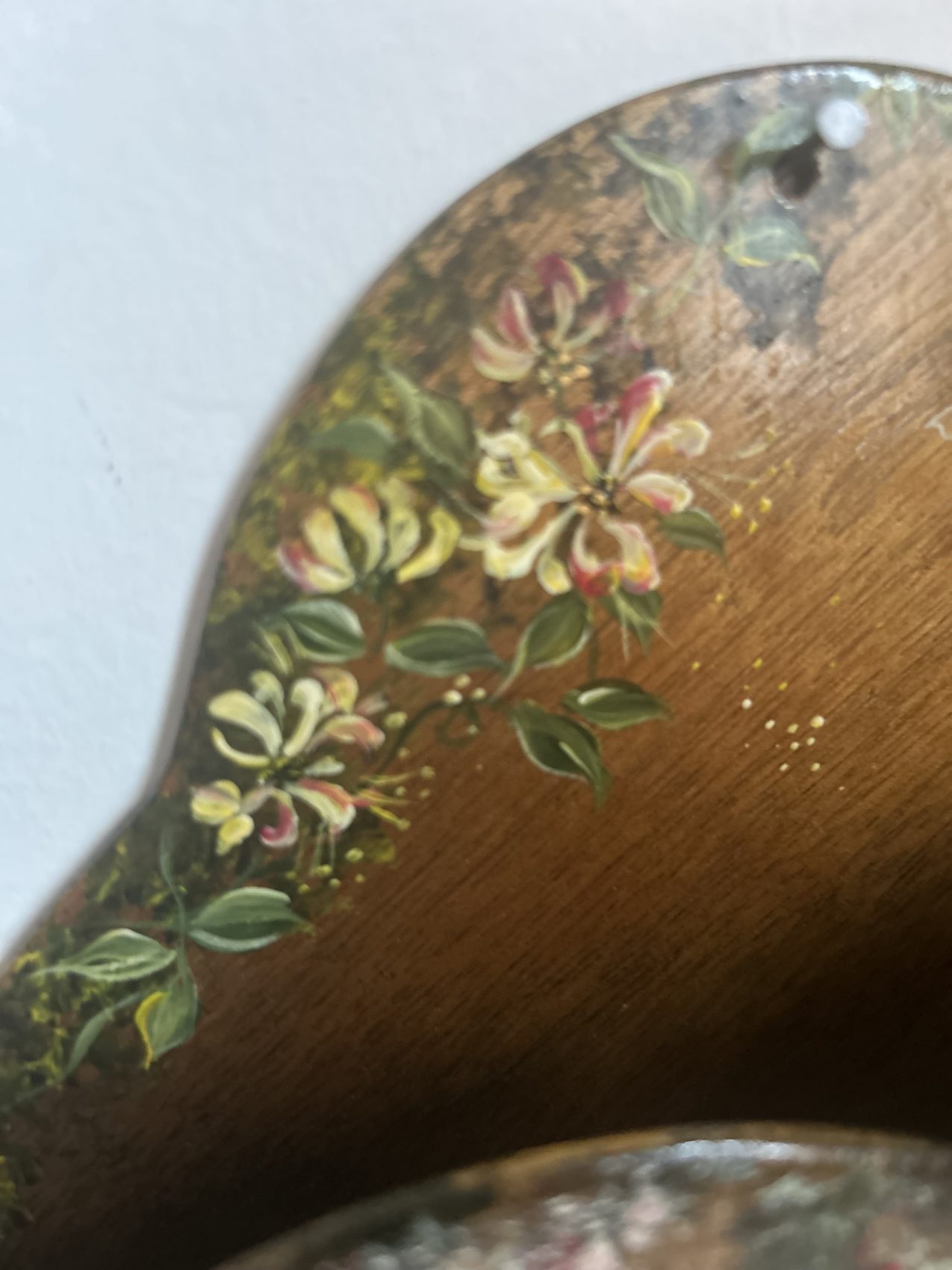 Réalisé en bois et décoré de motifs de doigts peints, ce type de porte courrier murale trouvait naturellement sa place dans une cuisine, une entrée ou un office, servant à accueillir le courrier, les papiers importants ou les petits mots du quotidien, bien avant l’apparition des meubles standardisés et impersonnels.