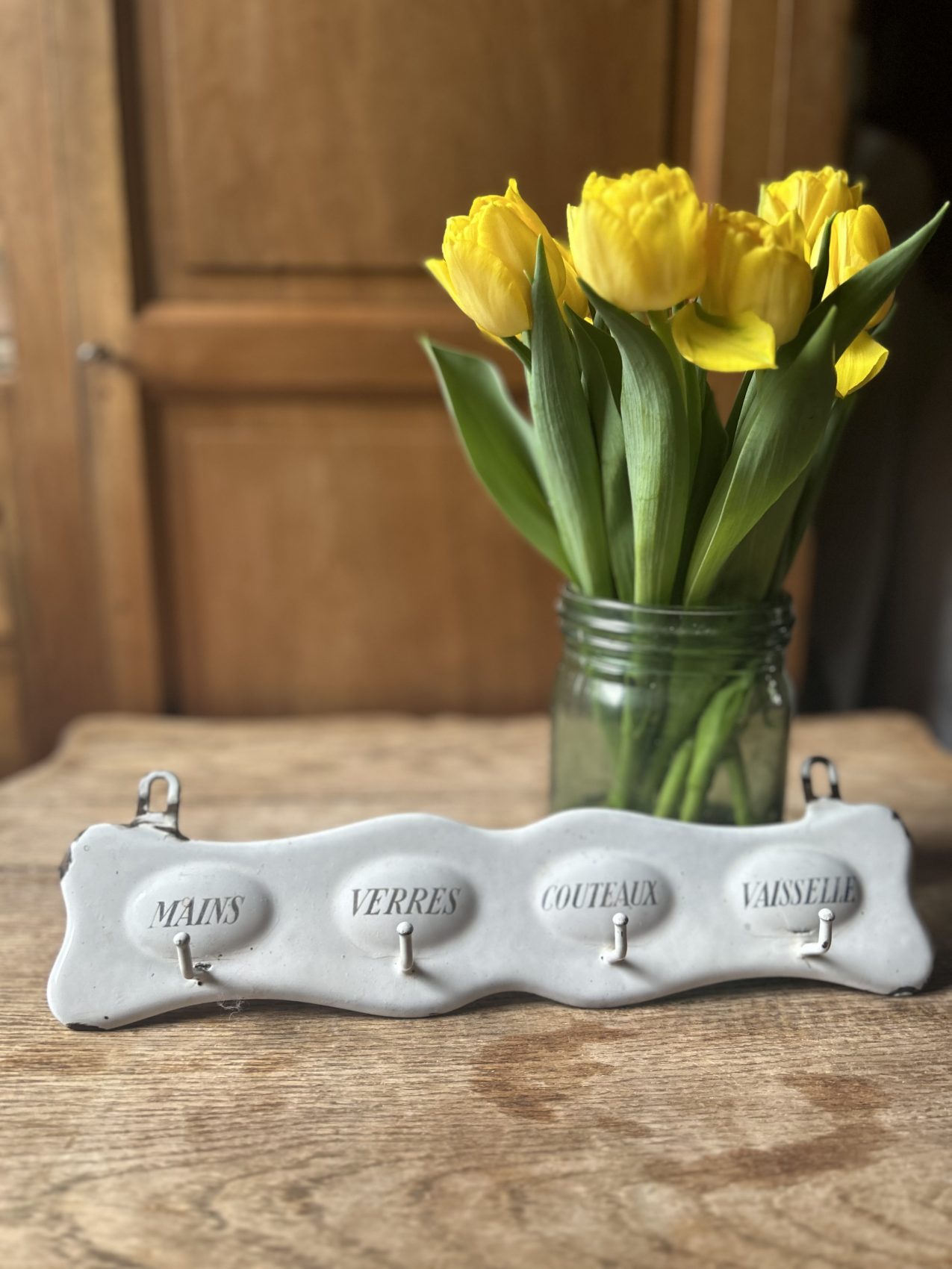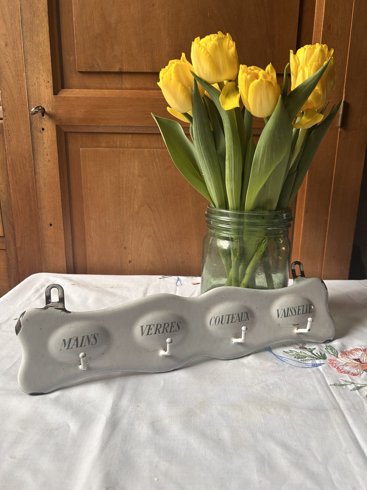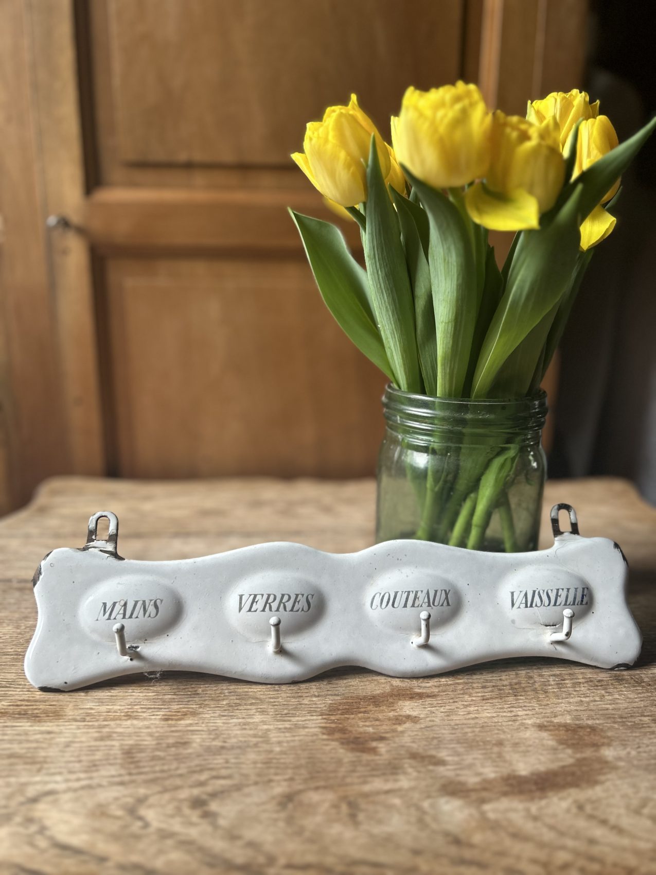 Ce porte-torchon ancien en tôle peinte, datant de la première partie du XXe siècle, a traversé le temps avec élégance. Il présente quelques légères traces d’usage… et c’est précisément ce qui lui donne tout son caractère.