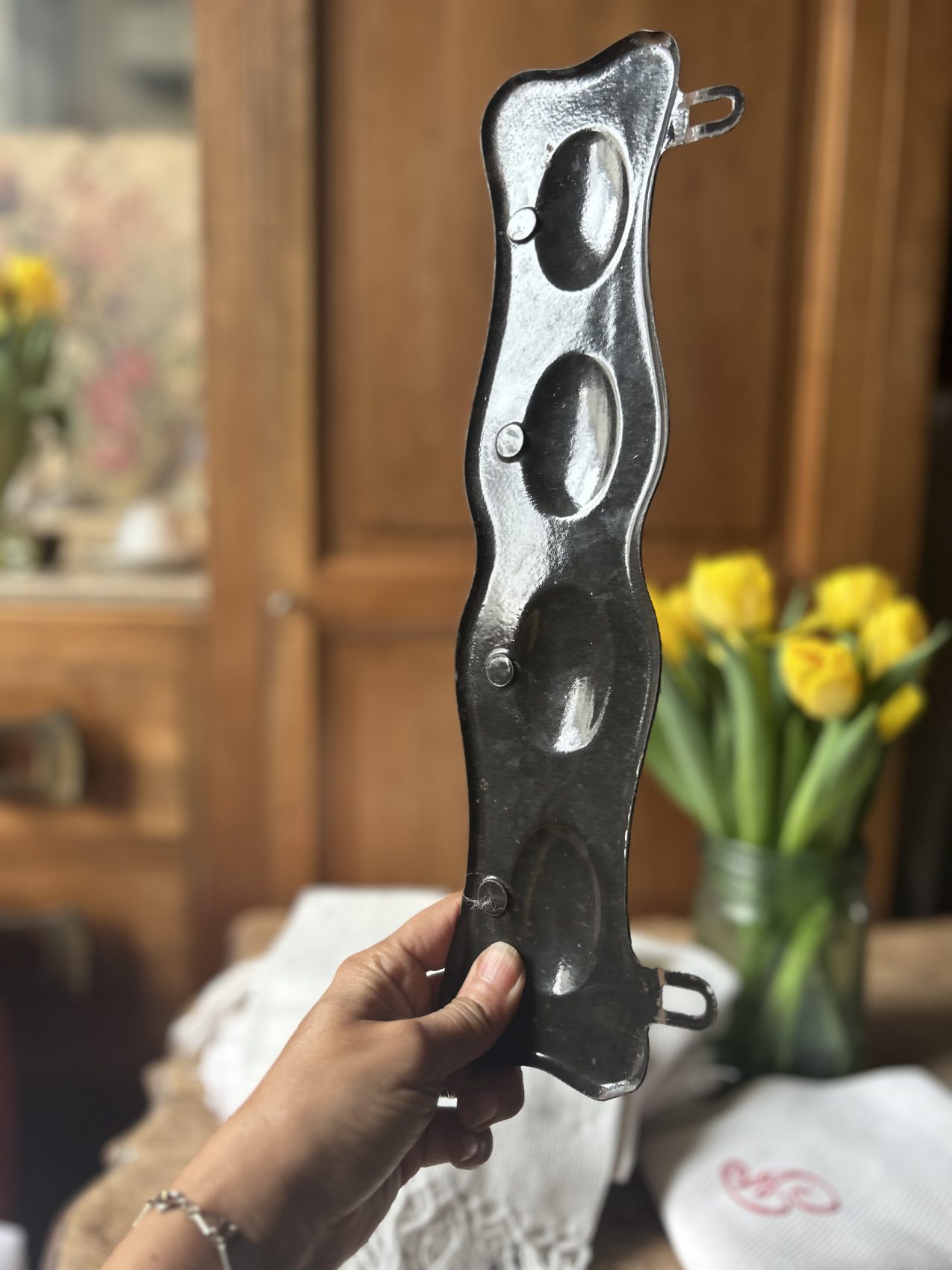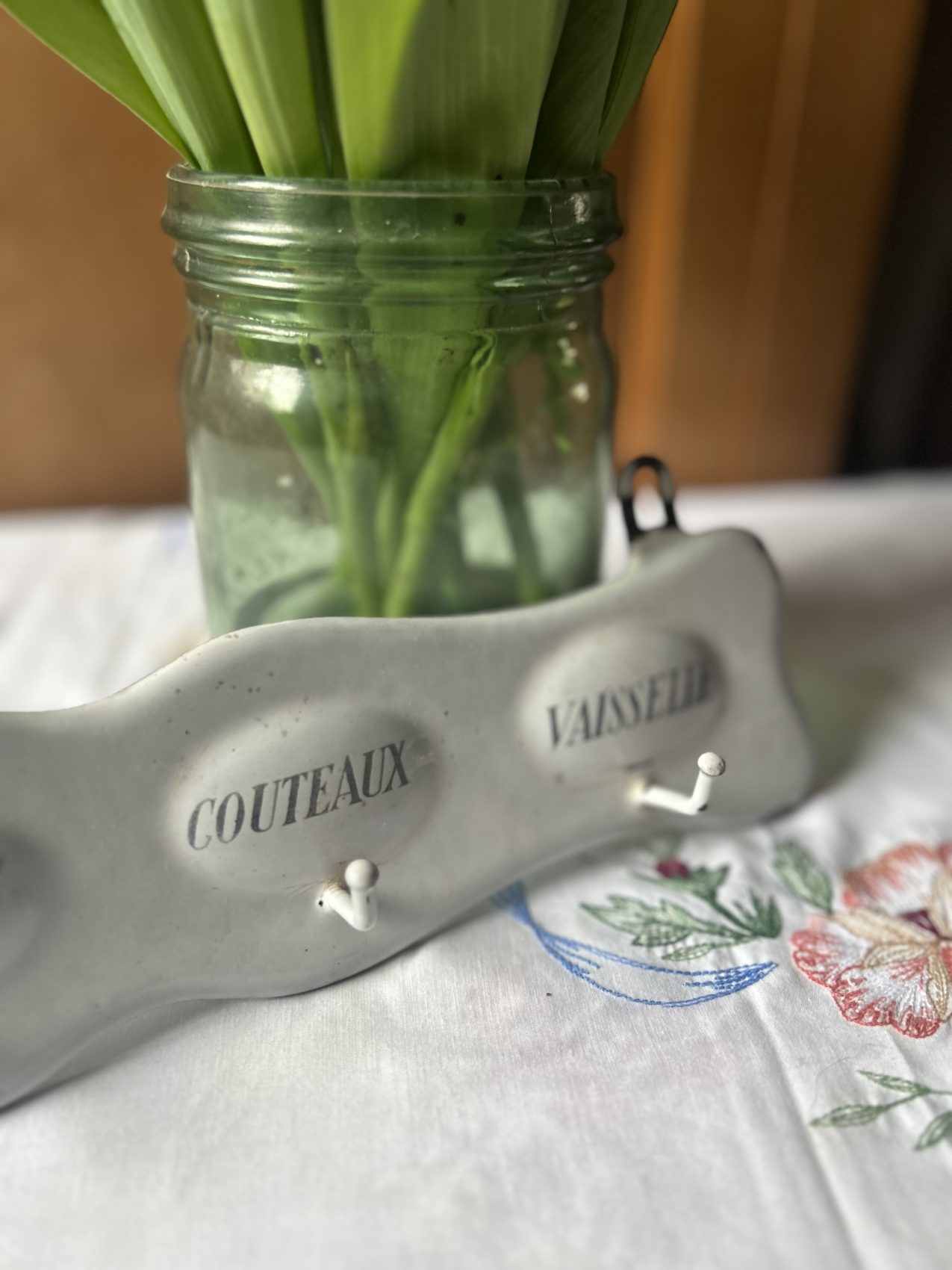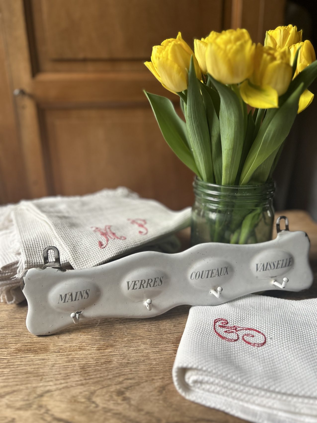 Ce porte-torchon ancien en tôle peinte, datant de la première partie du XXe siècle, a traversé le temps avec élégance. Il présente quelques légères traces d’usage… et c’est précisément ce qui lui donne tout son caractère.