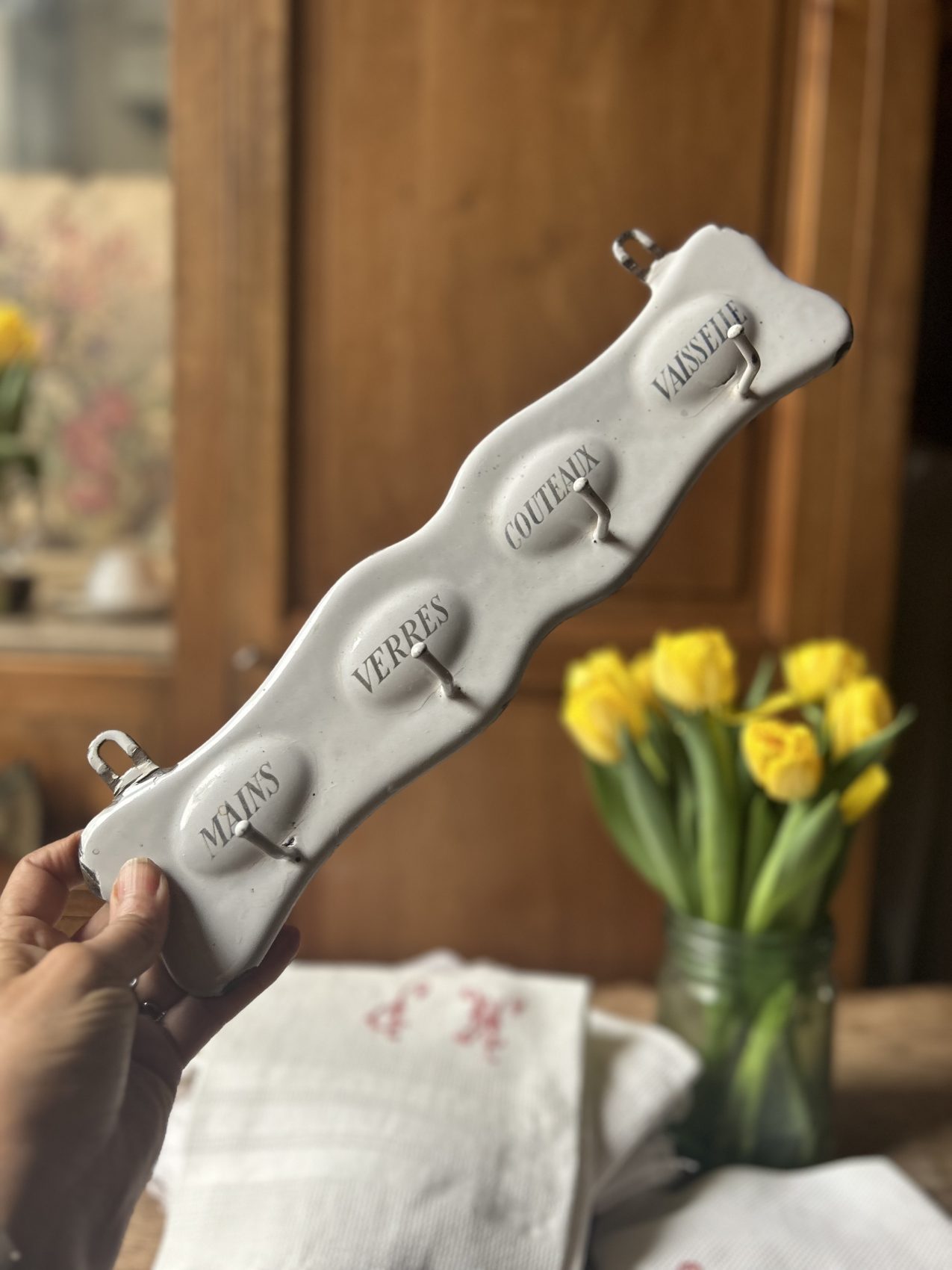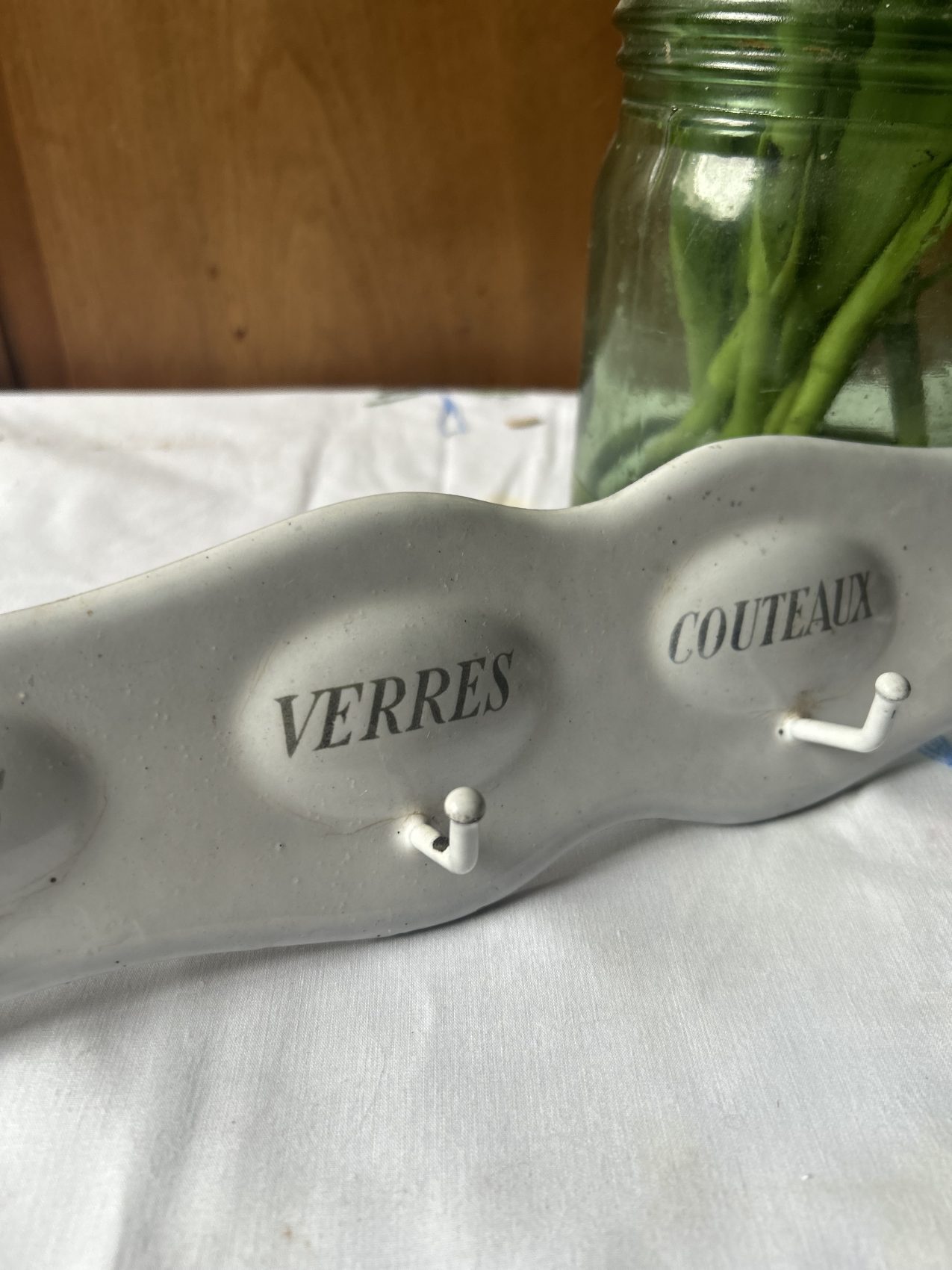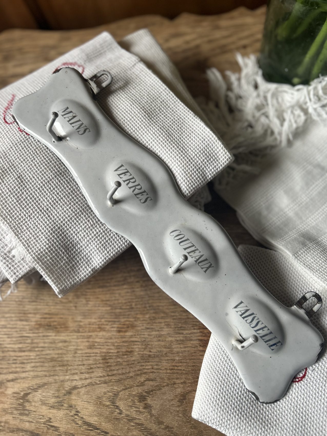 Le porte-torchon en tôle peinte est typique des accessoires muraux du début du XXe siècle.