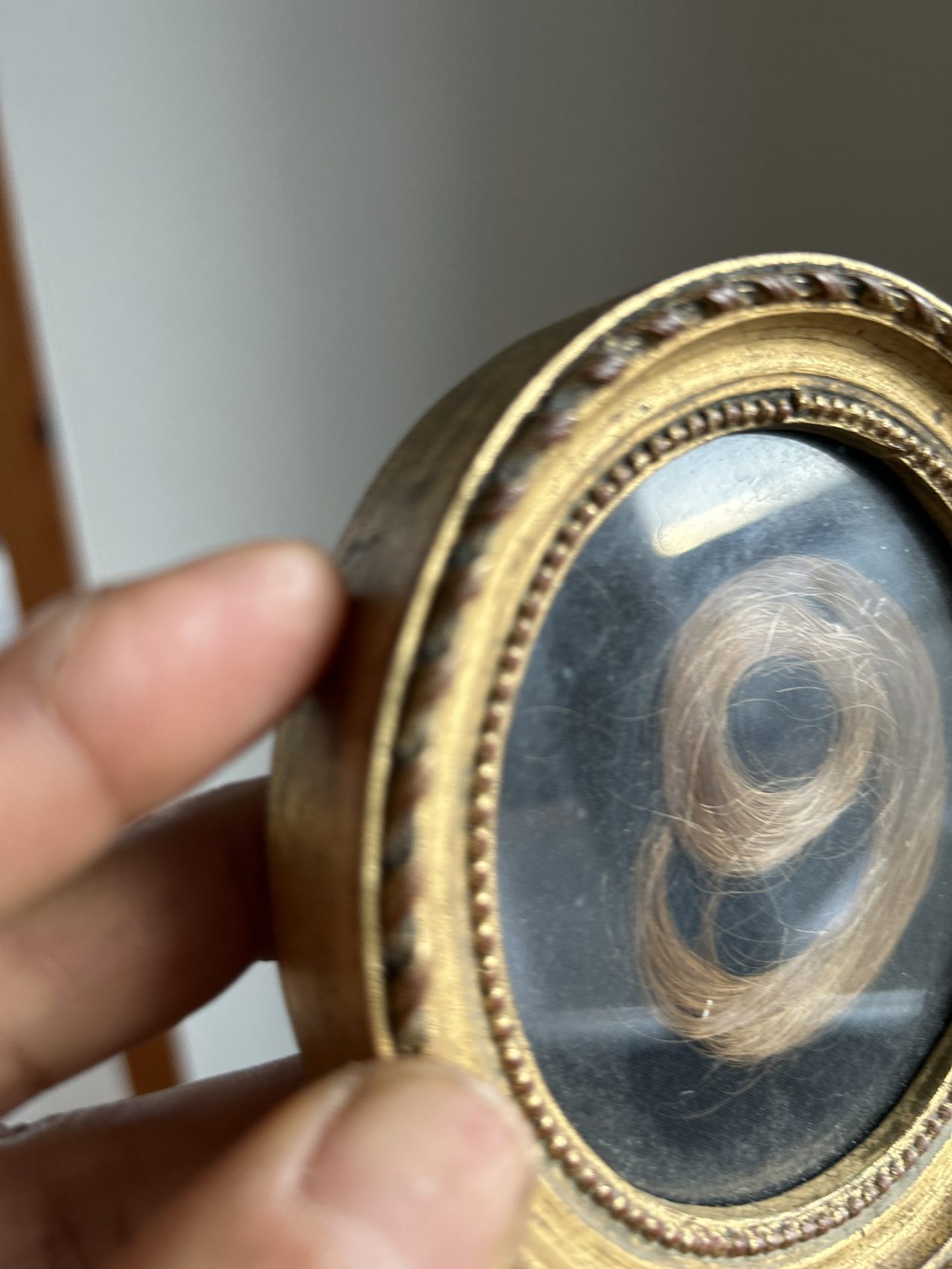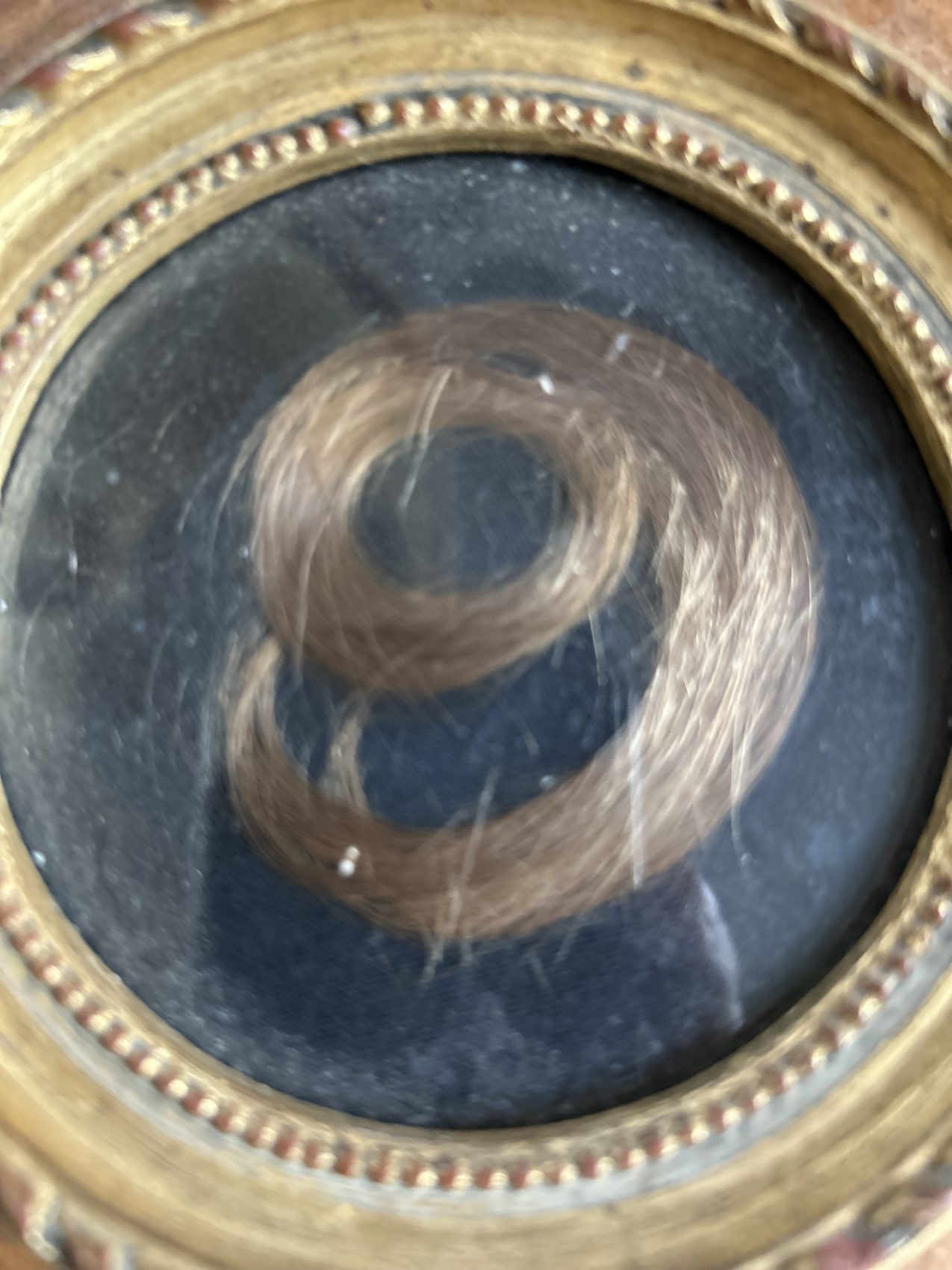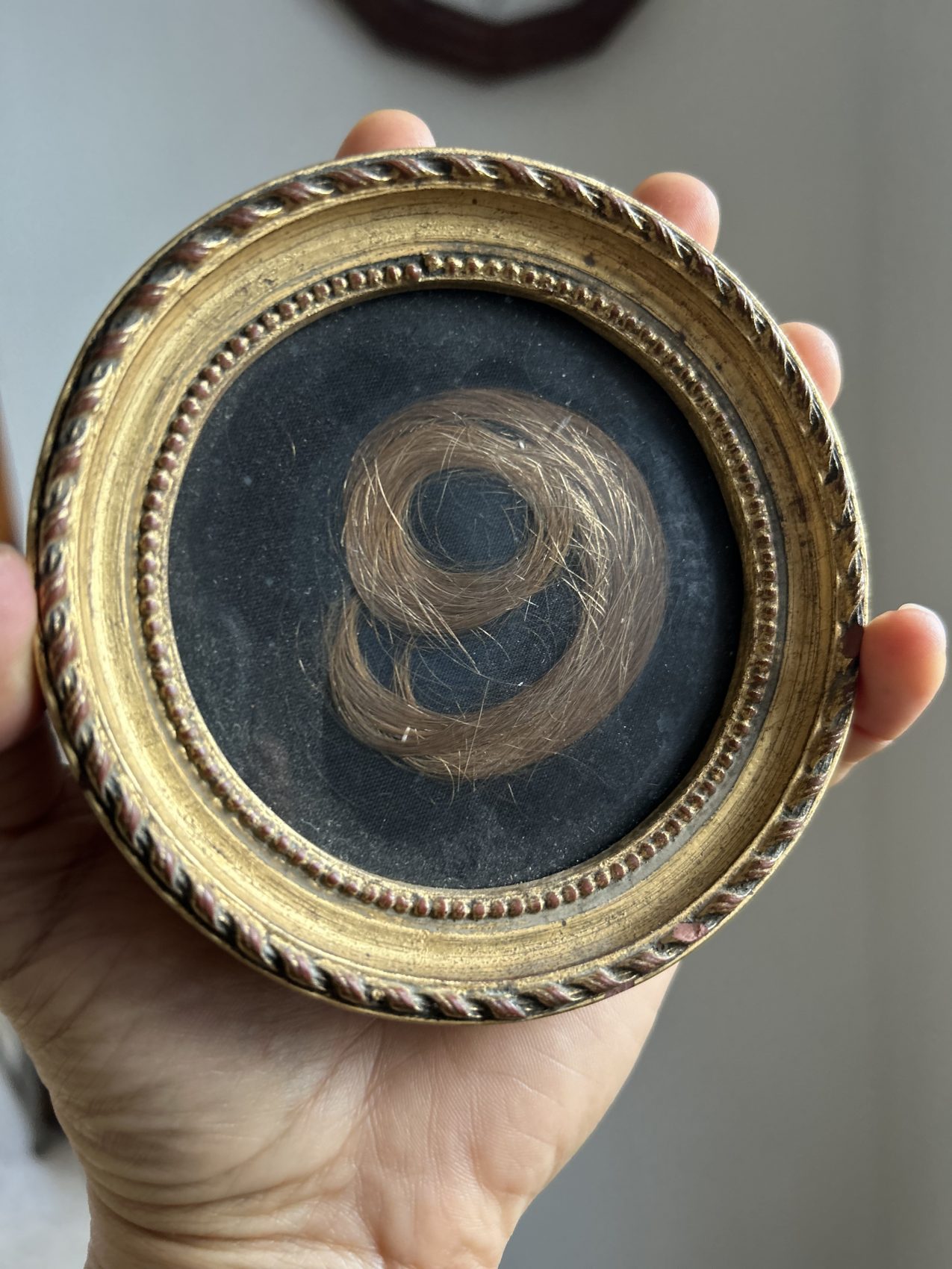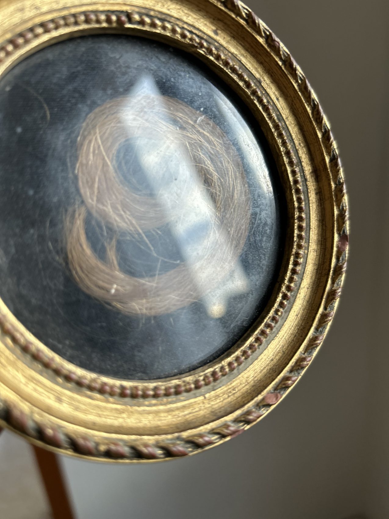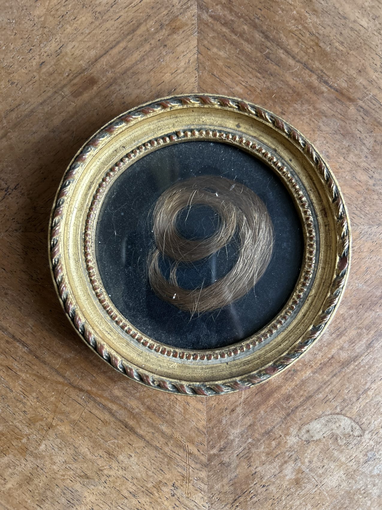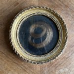 Ici, les cheveux sont délicatement disposés pour former un chiffre 9, protégé sous verre, dans un cadre rond doré à la patine douce et cohérente avec son âge. Le fond sombre met en valeur la composition et renforce la dimension graphique de l’ensemble.