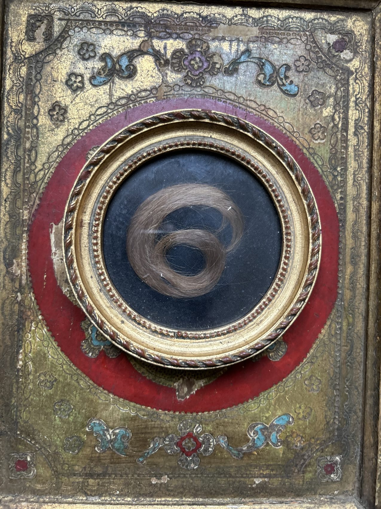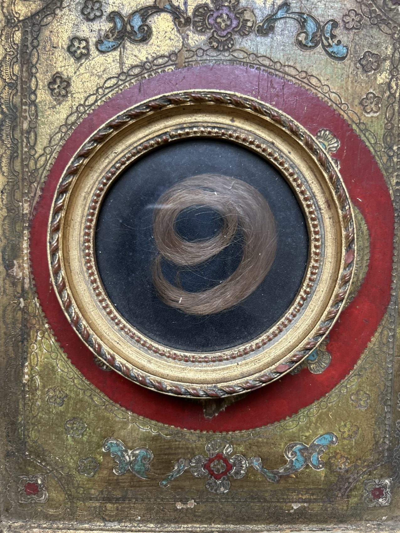 Ce petit cadre ancien est ce que l’on appelle un reliquaire de cheveux, un objet de mémoire très répandu à la fin du XIXe siècle et au tout début du XXe siècle.