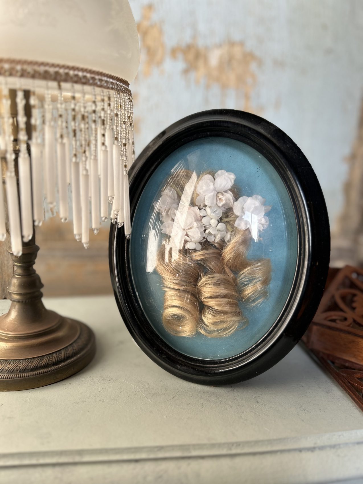 Ce reliquaire capillaire ancien est un travail artisanal de la fin du XIXe – tout début du XXe siècle, composé de véritables cheveux soigneusement roulés et mis en scène sous verre, accompagnés de délicates fleurs décoratives.