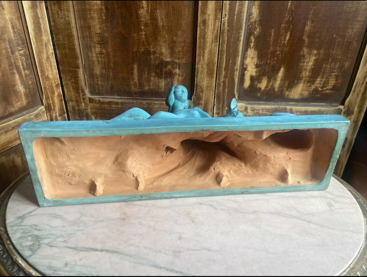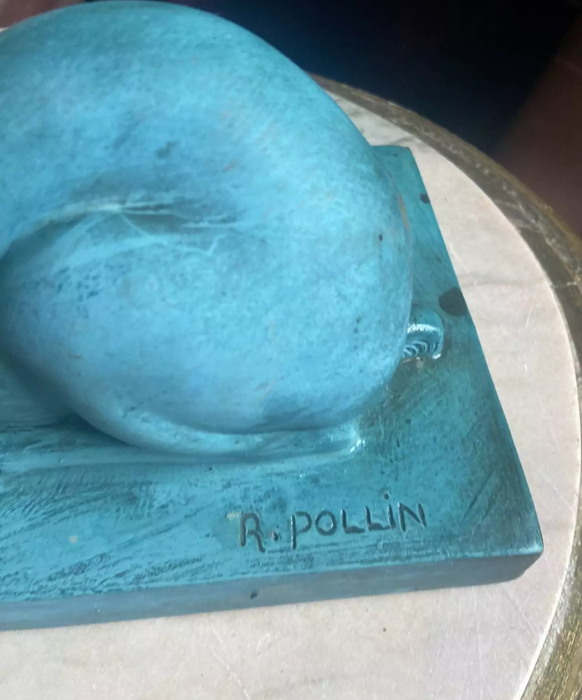 La pièce est signée R. Polin, réalisée en terre cuite patinée turquoise, une teinte qui donne une profondeur subtile à la lumière.