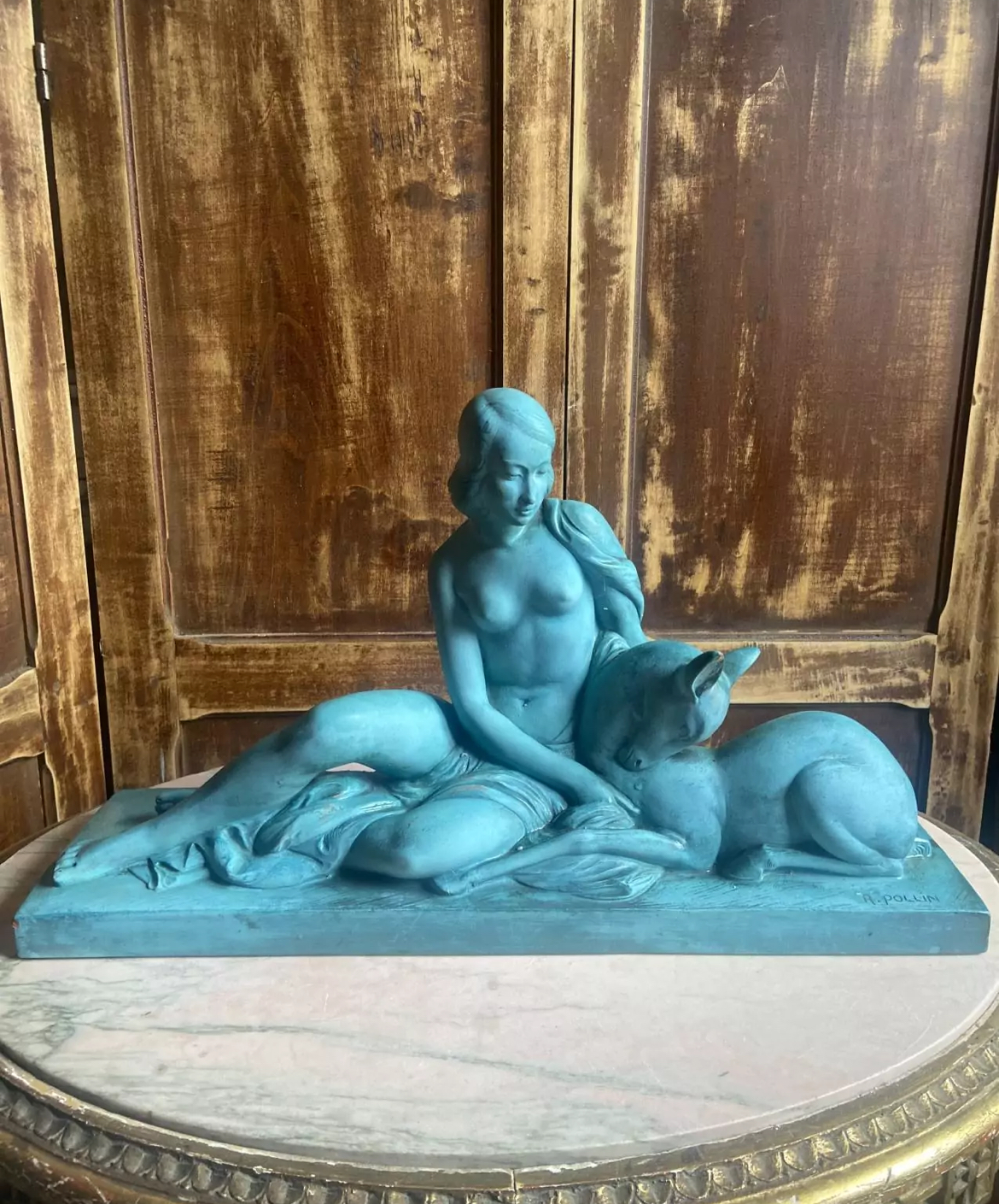 Sculpture Epoque Art Déco signée R. Polin – Diane chasseresse Terre cuite patinée turquoise
