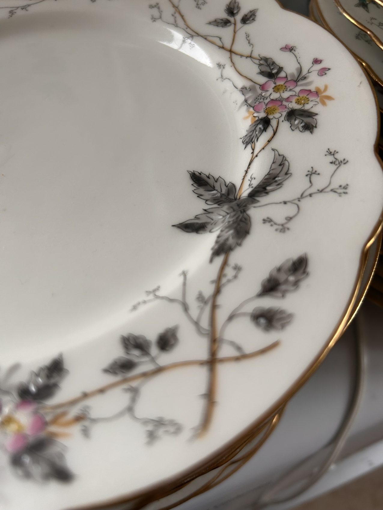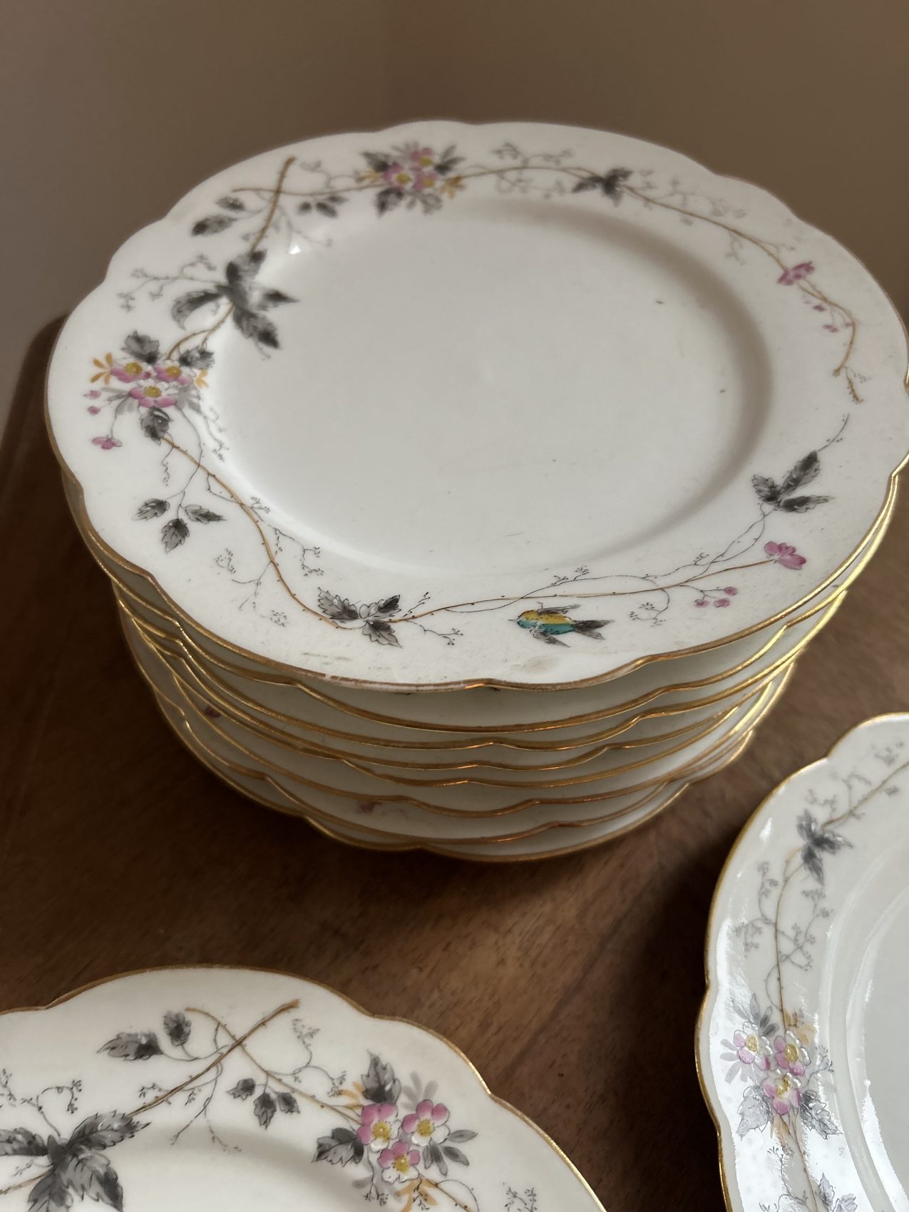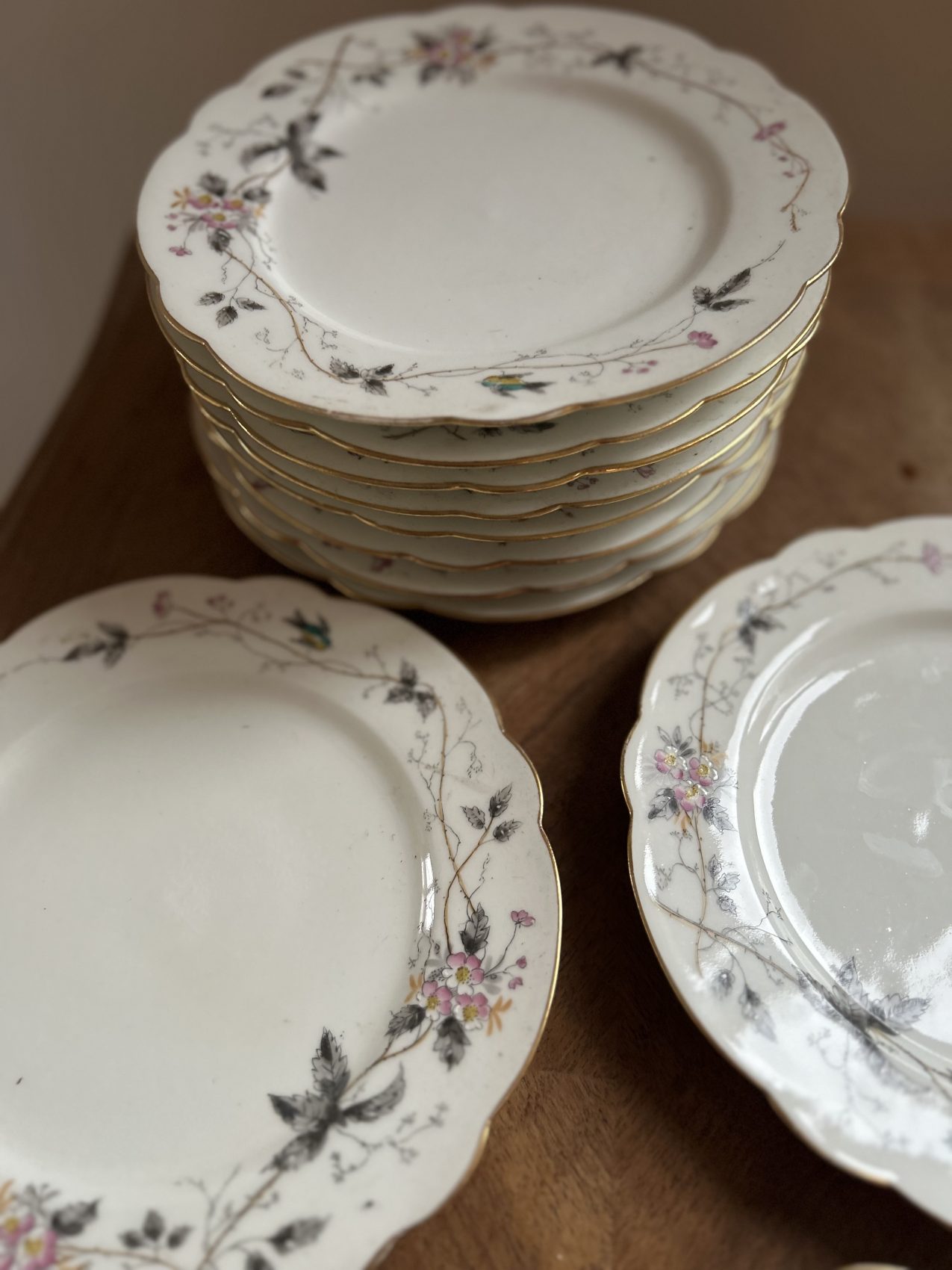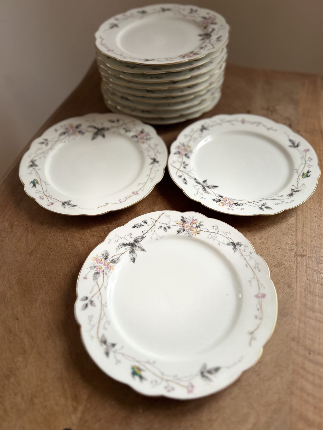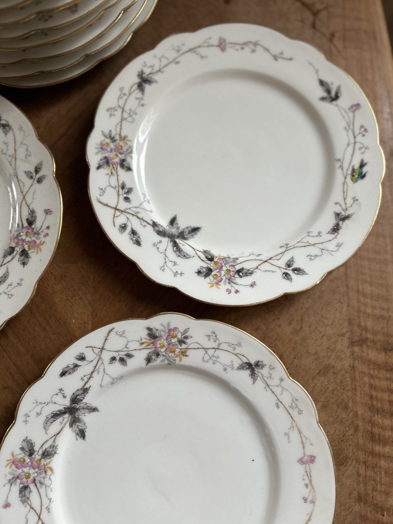 Voici une superbe série de 12 assiettes plates en porcelaine française, datant du tout début du XXe siècle.