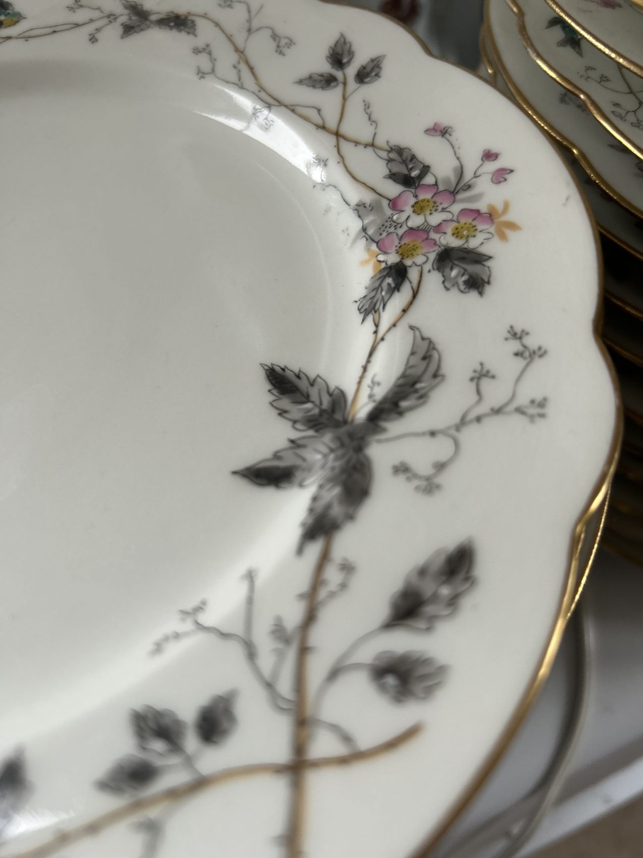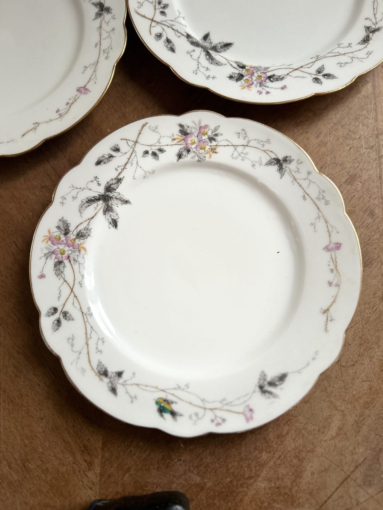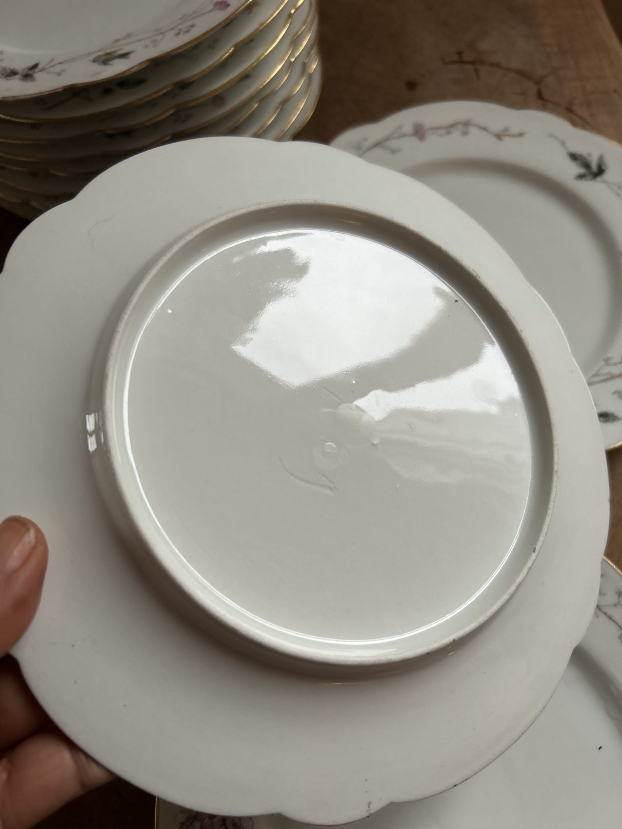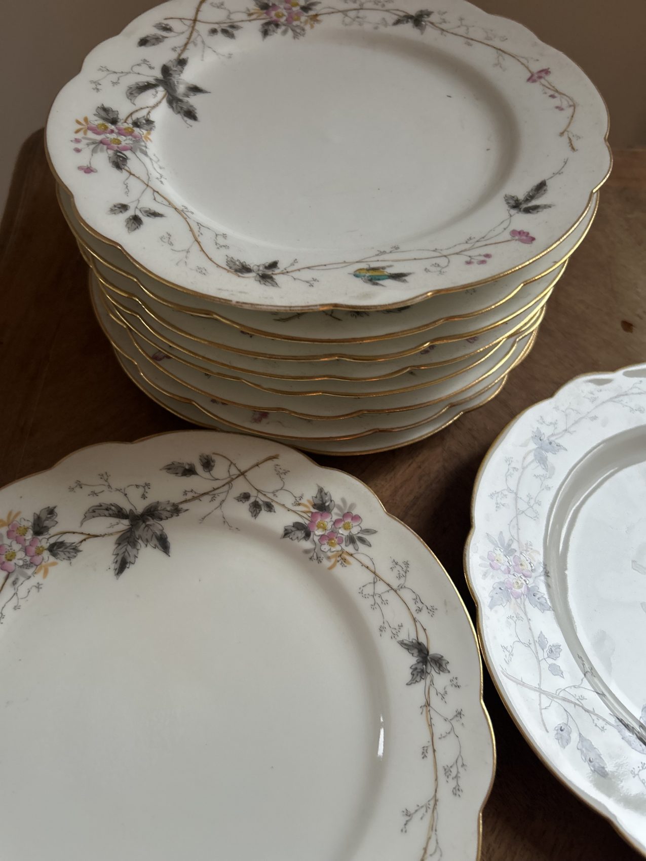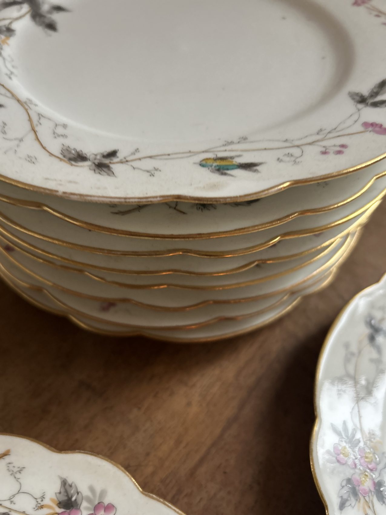 Voici une superbe série de 12 assiettes plates en porcelaine française, datant du tout début du XXe siècle.