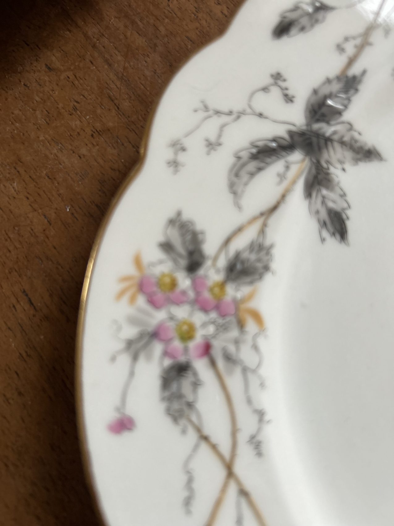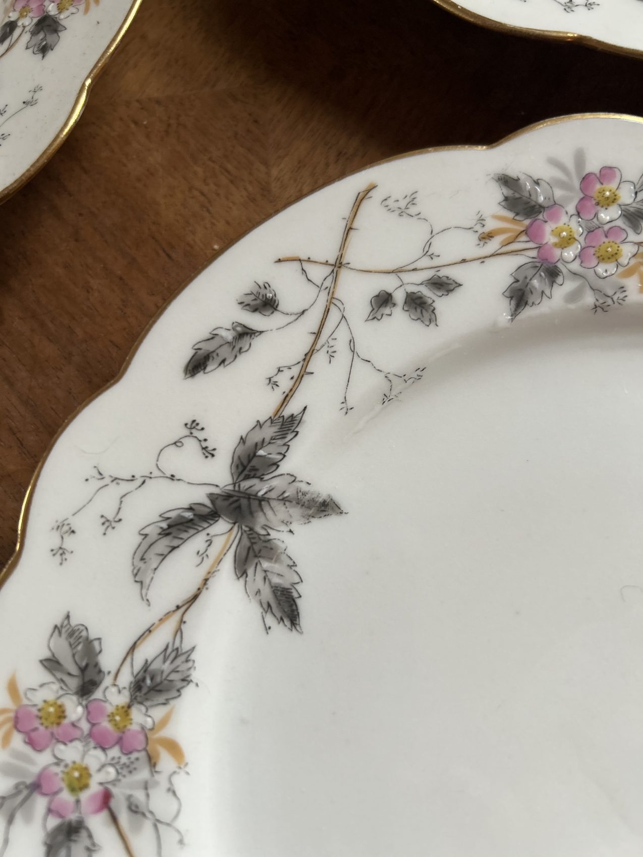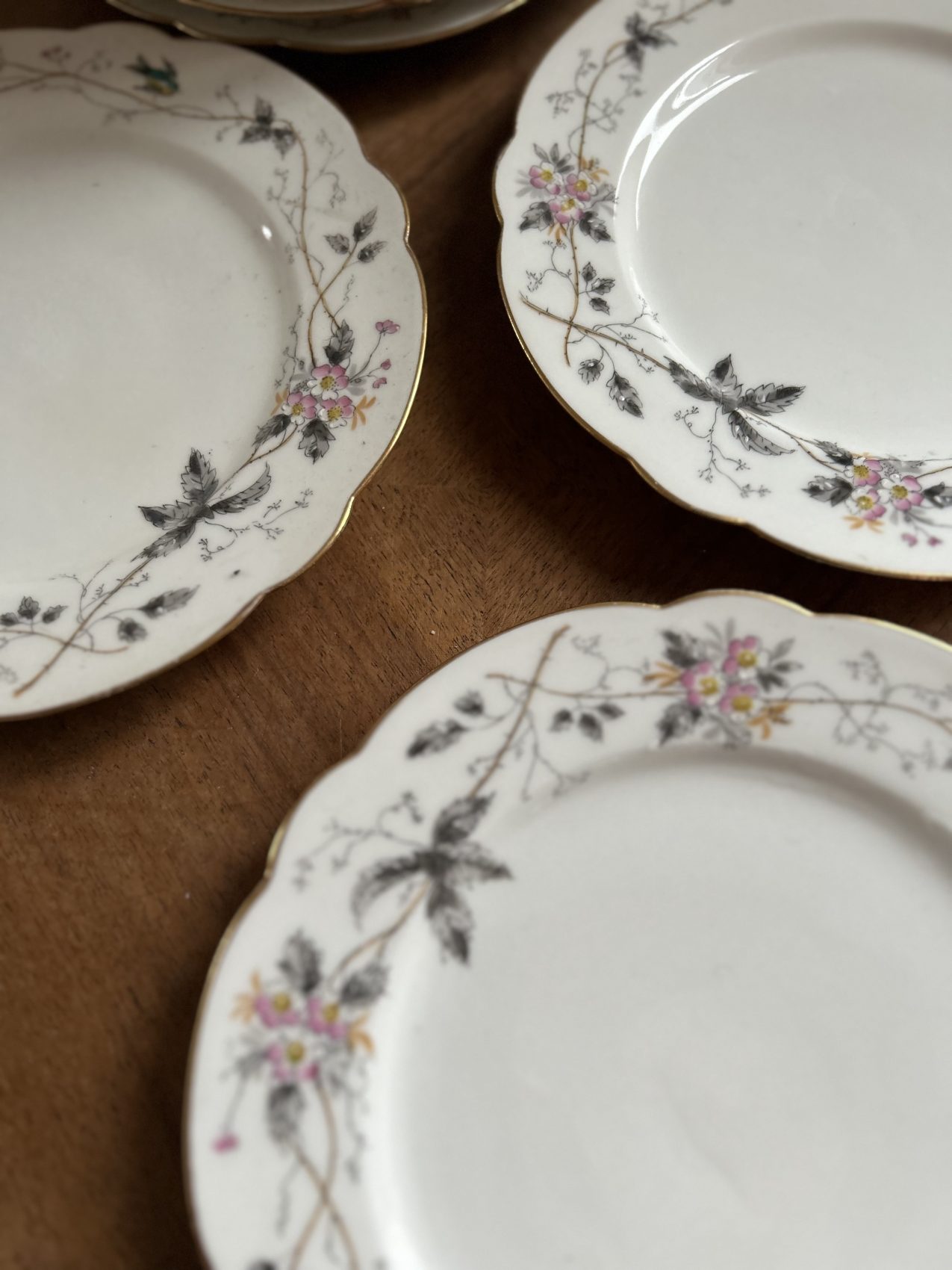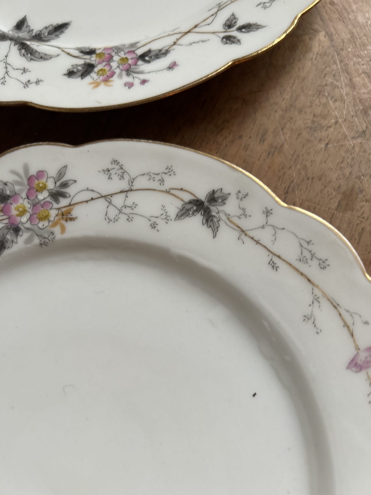 Leur format est parfait pour des desserts généreux ou de jolies entrées.Le bord entourné apporte du relief, tandis que le décor bucolique de fleurs, de feuilles et de feuillages donne à l’ensemble une poésie très champêtre.Le tout est sublimé par un élégant liseré or, encore bien présent, qui souligne la finesse de ces pièces anciennes.