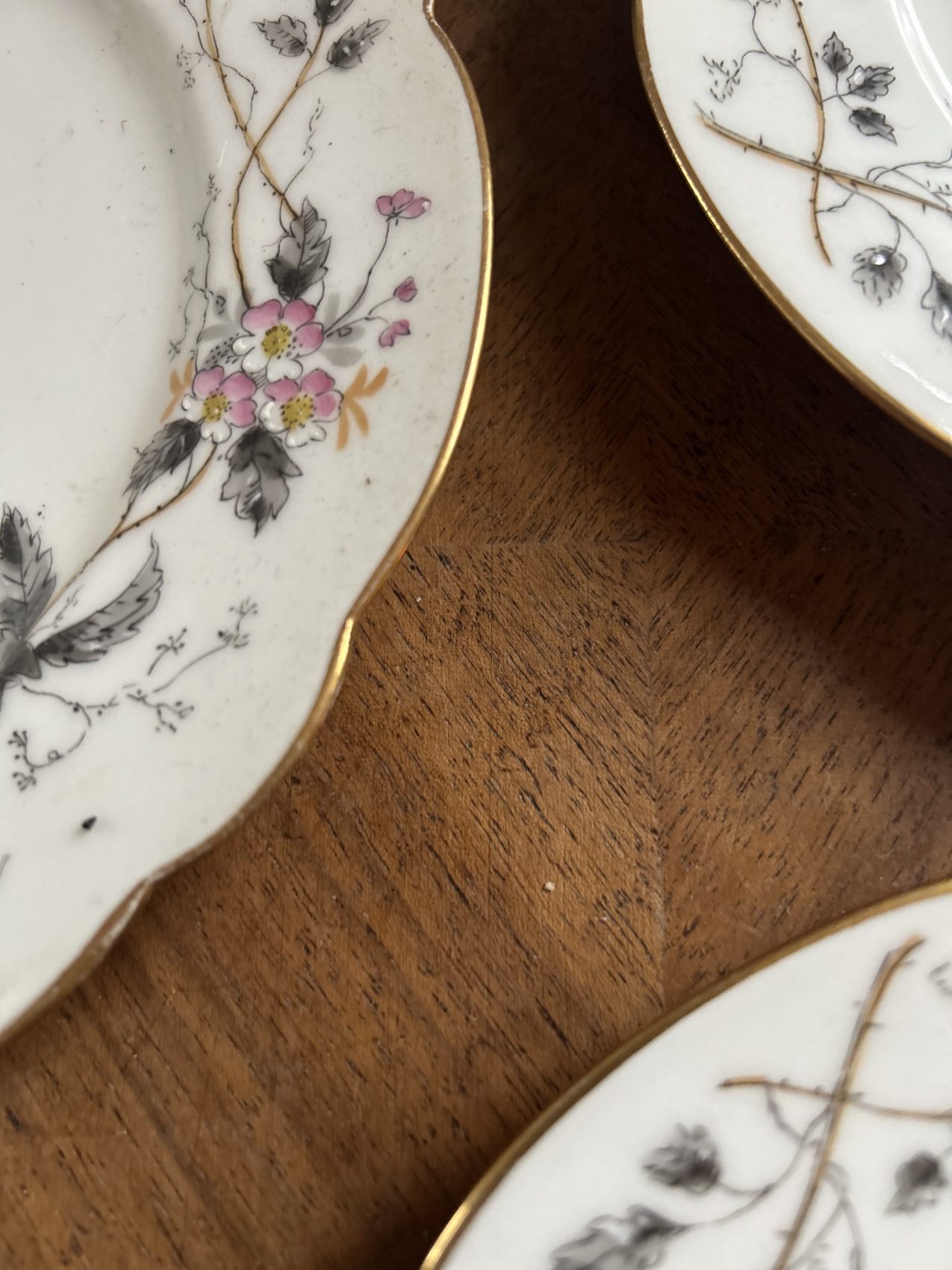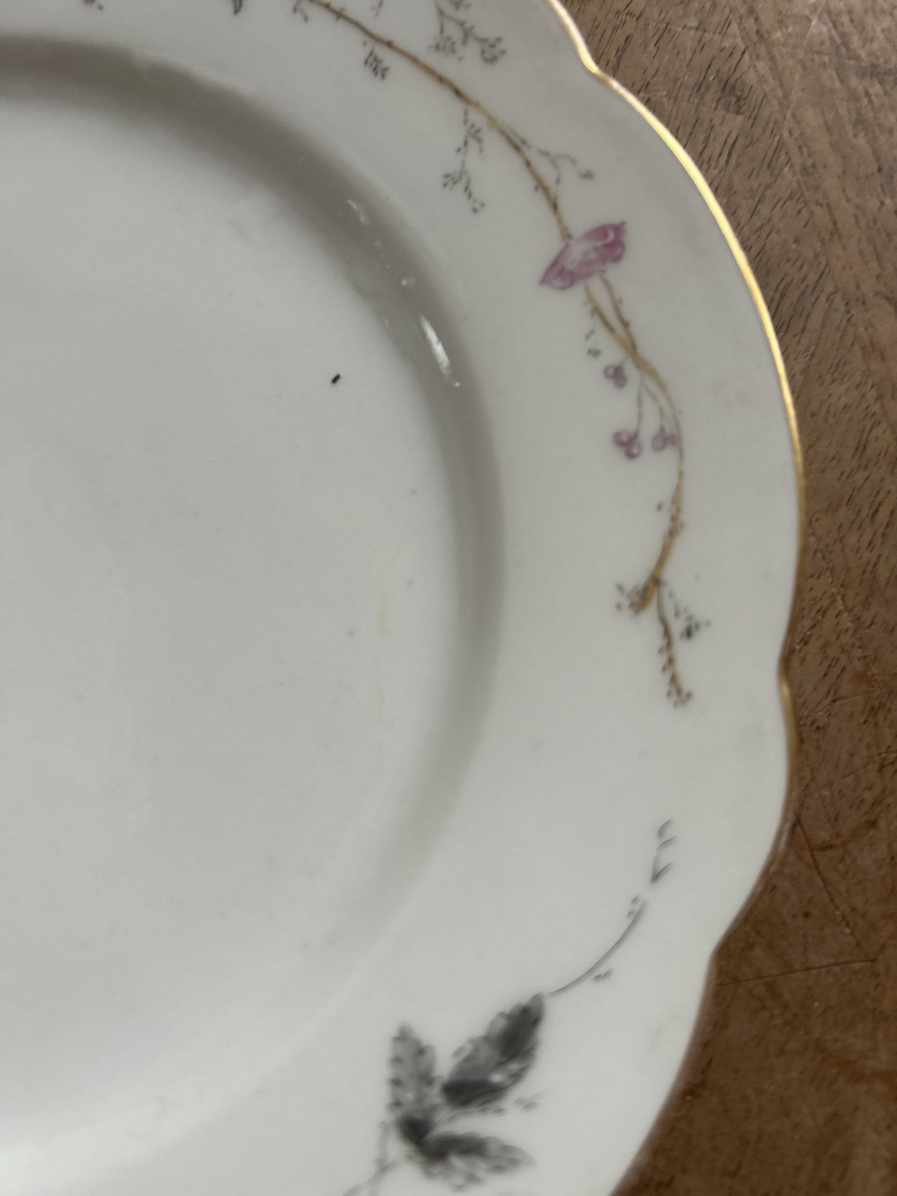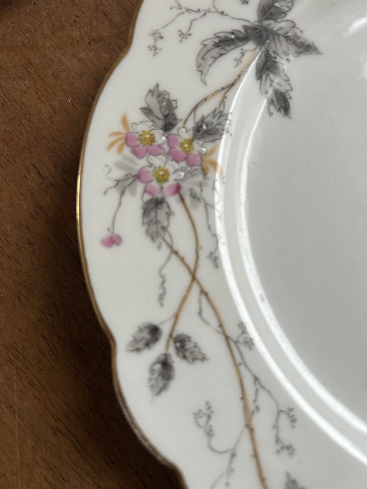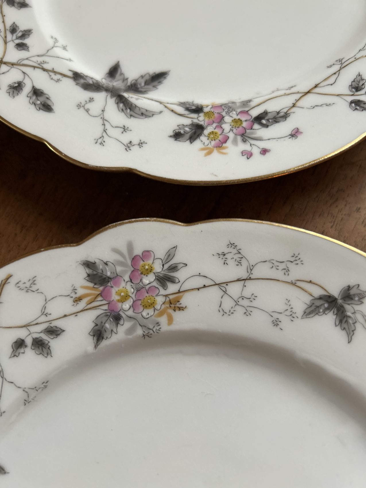 Leur format est parfait pour des desserts généreux ou de jolies entrées.Le bord entourné apporte du relief, tandis que le décor bucolique de fleurs, de feuilles et de feuillages donne à l’ensemble une poésie très champêtre.Le tout est sublimé par un élégant liseré or, encore bien présent, qui souligne la finesse de ces pièces anciennes.