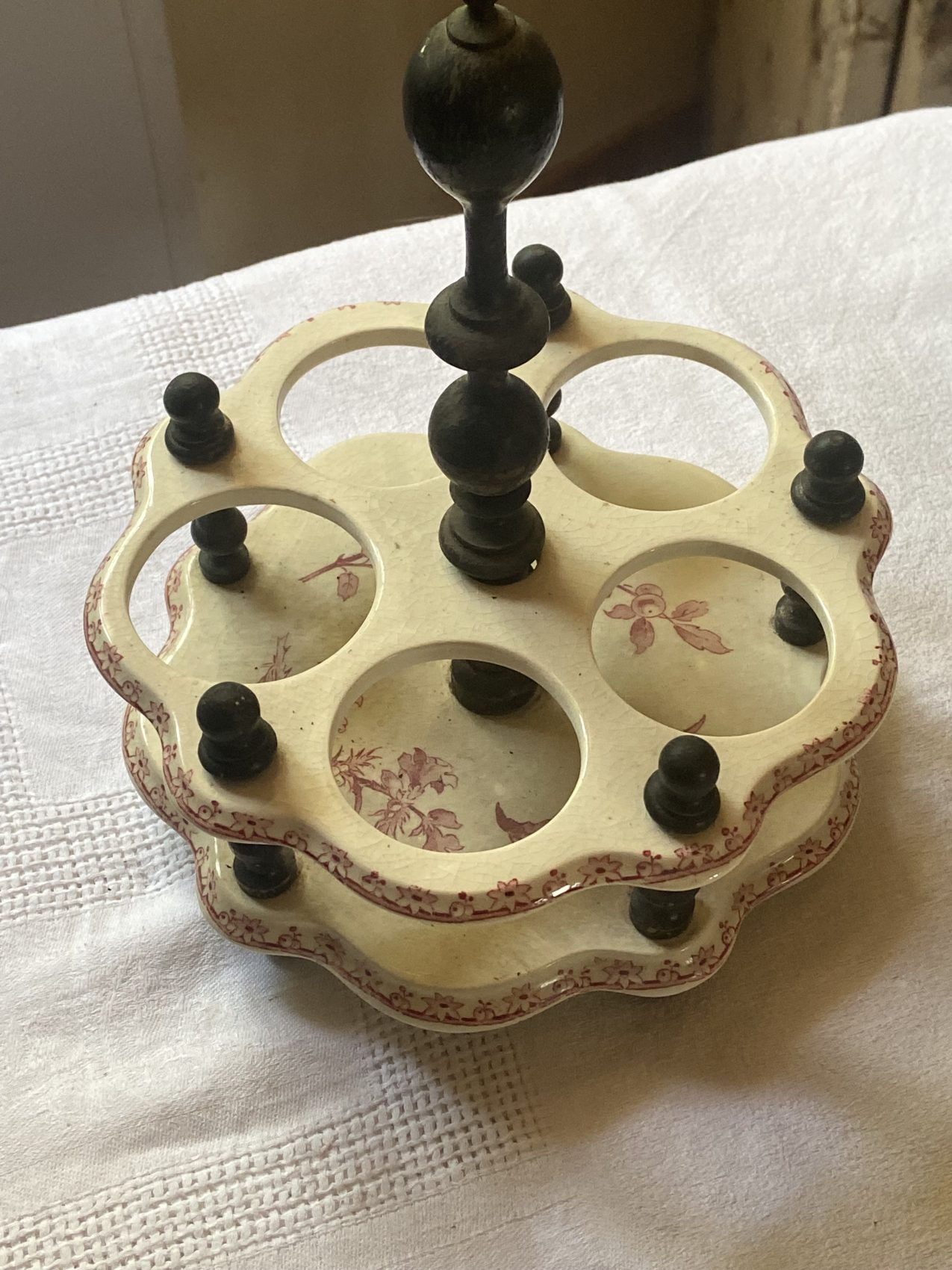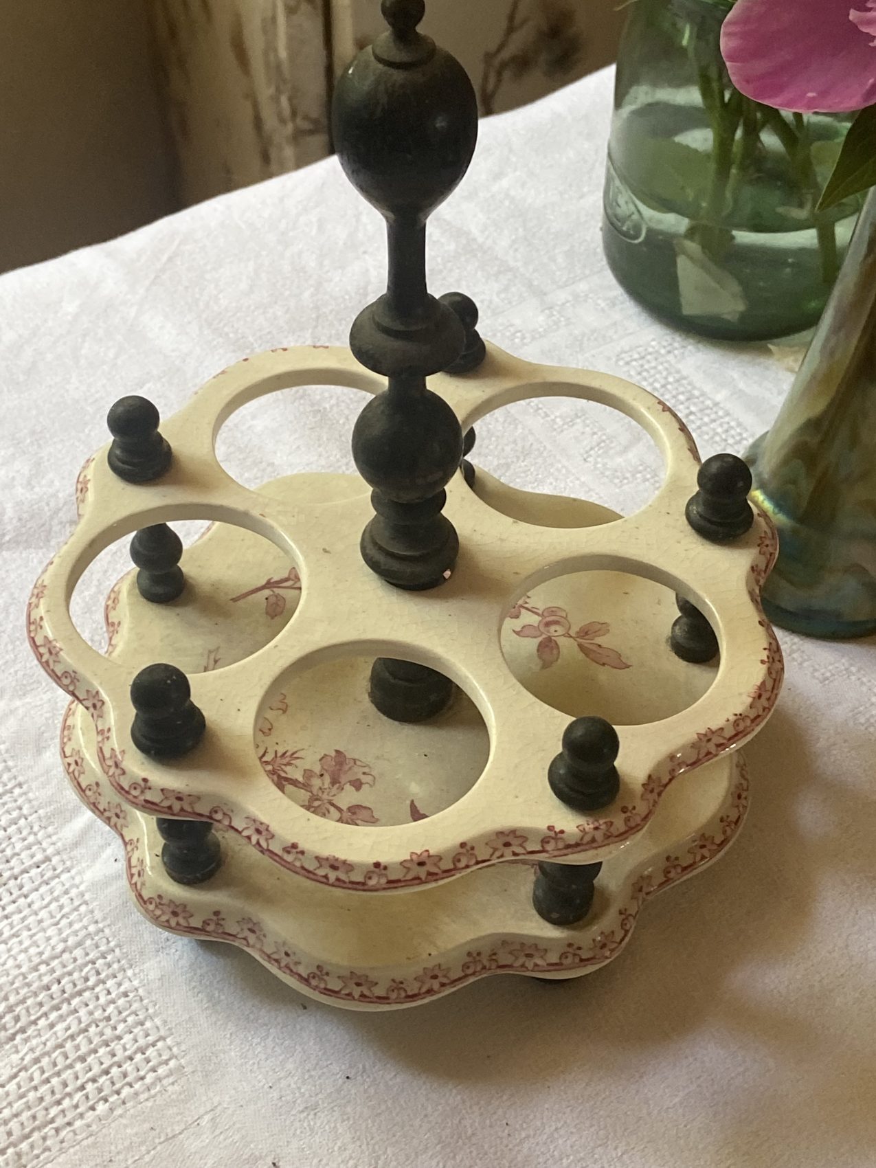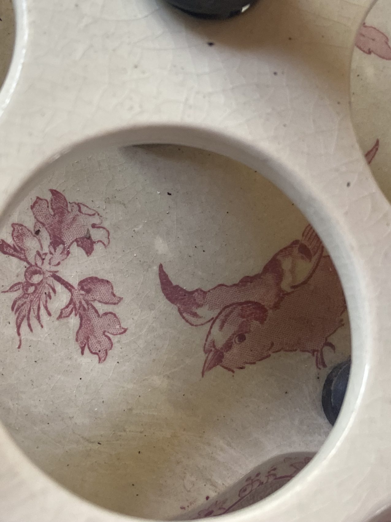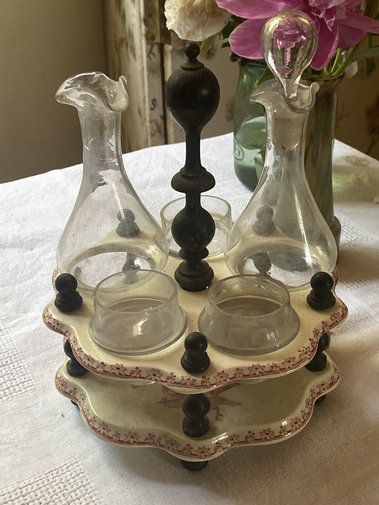 Complet , teinte rose tendre, motif floral délicat, craquelure fine qui raconte son âge. Le plateau double rang offre un jeu de niveaux charmant. Pièce décorative, mais aussi fonctionnelle : du salon à la cuisine, il tourne, il sert, il intrigue.