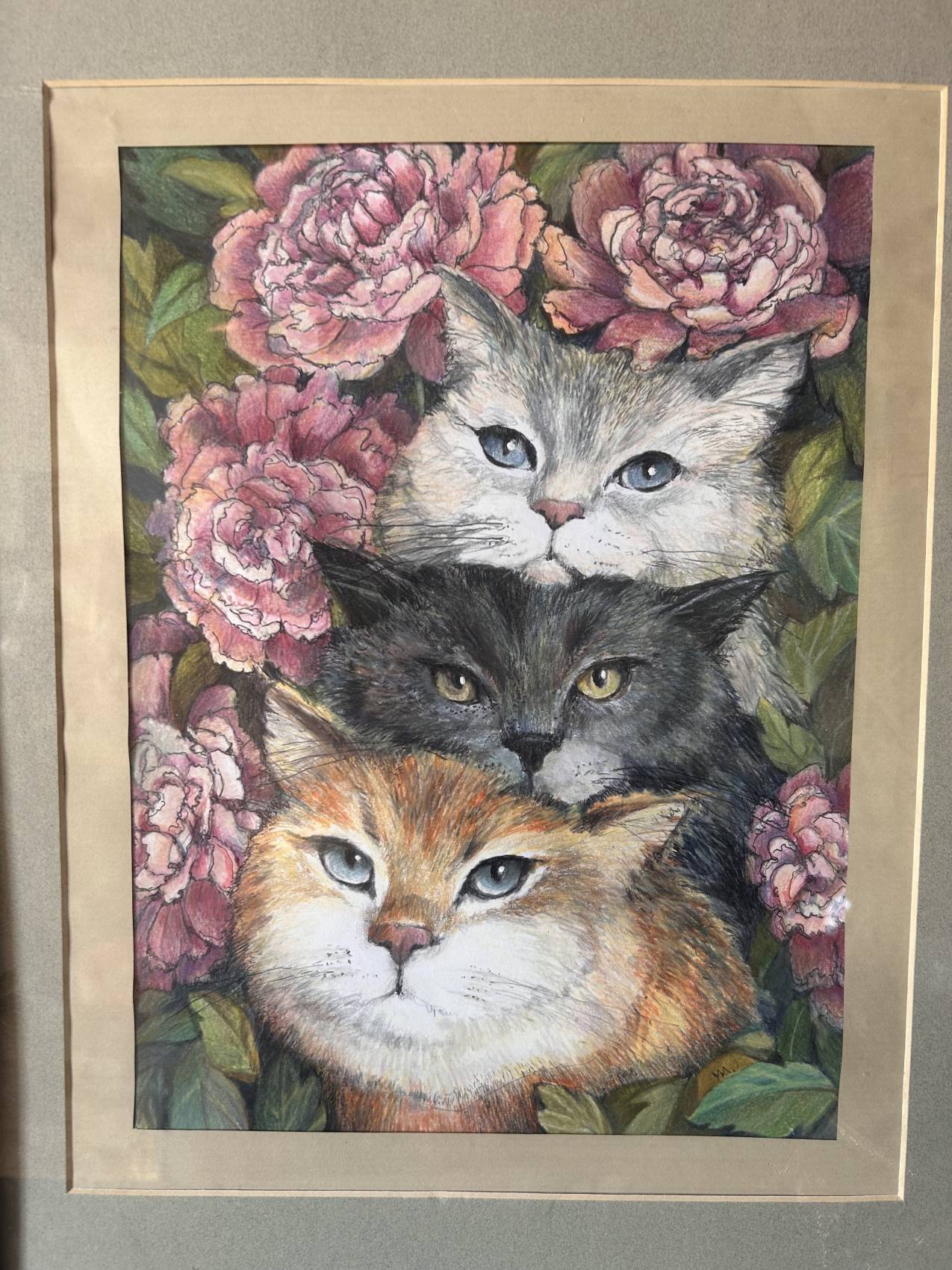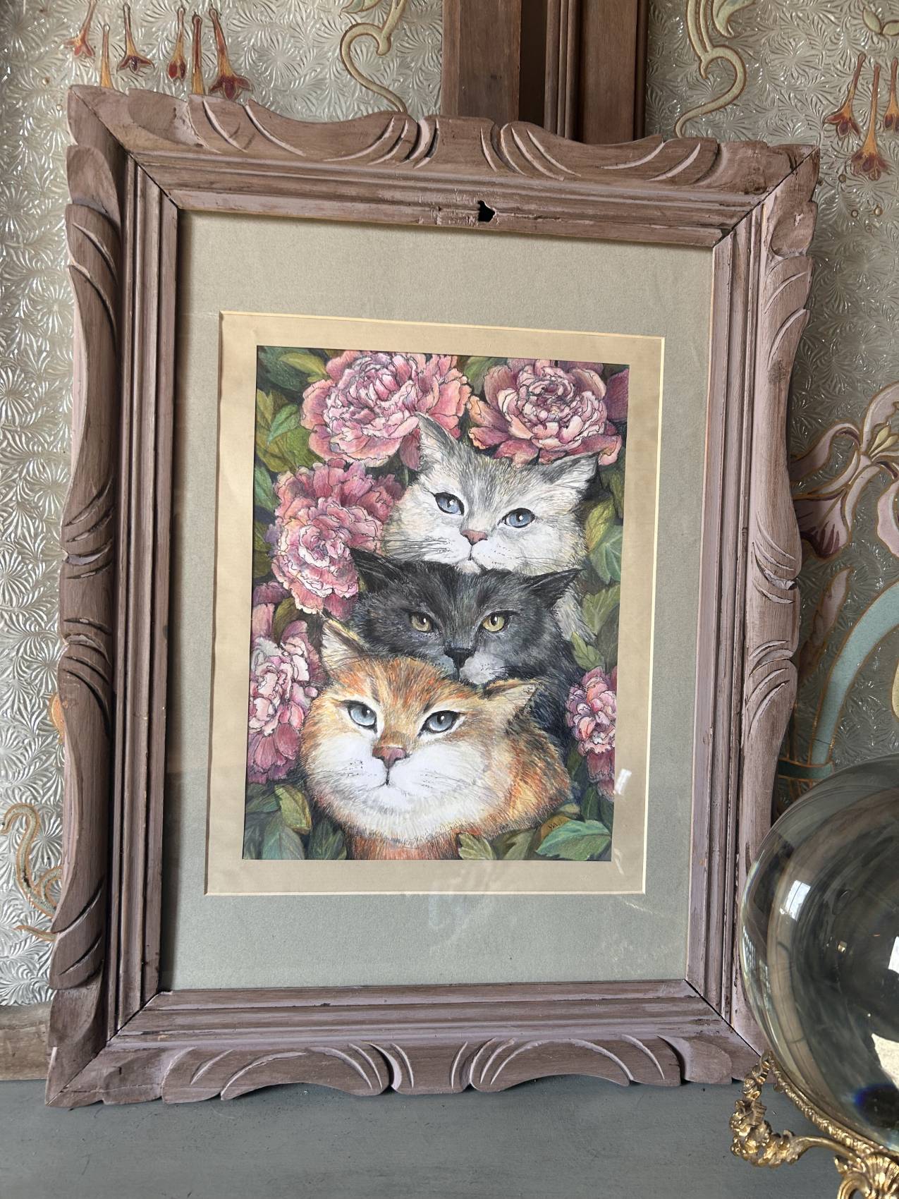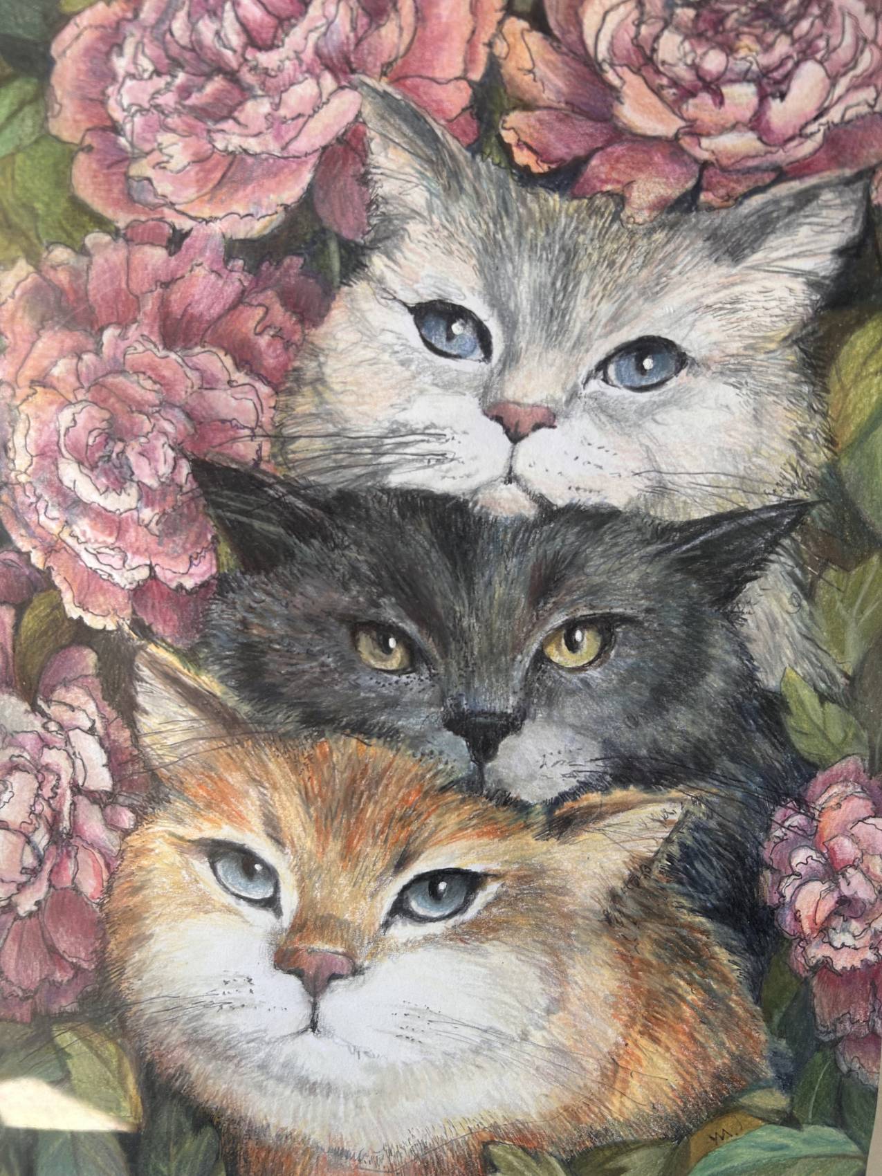 Tableau aquarelle technique mixte “Trois chats aux pivoines” Adopté