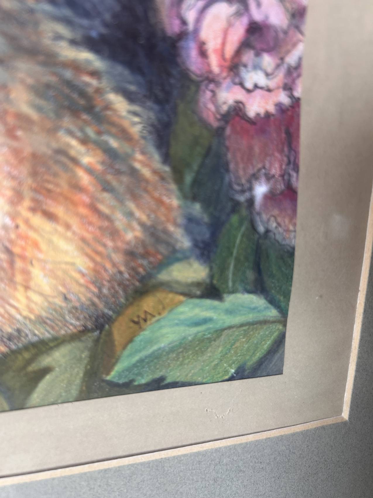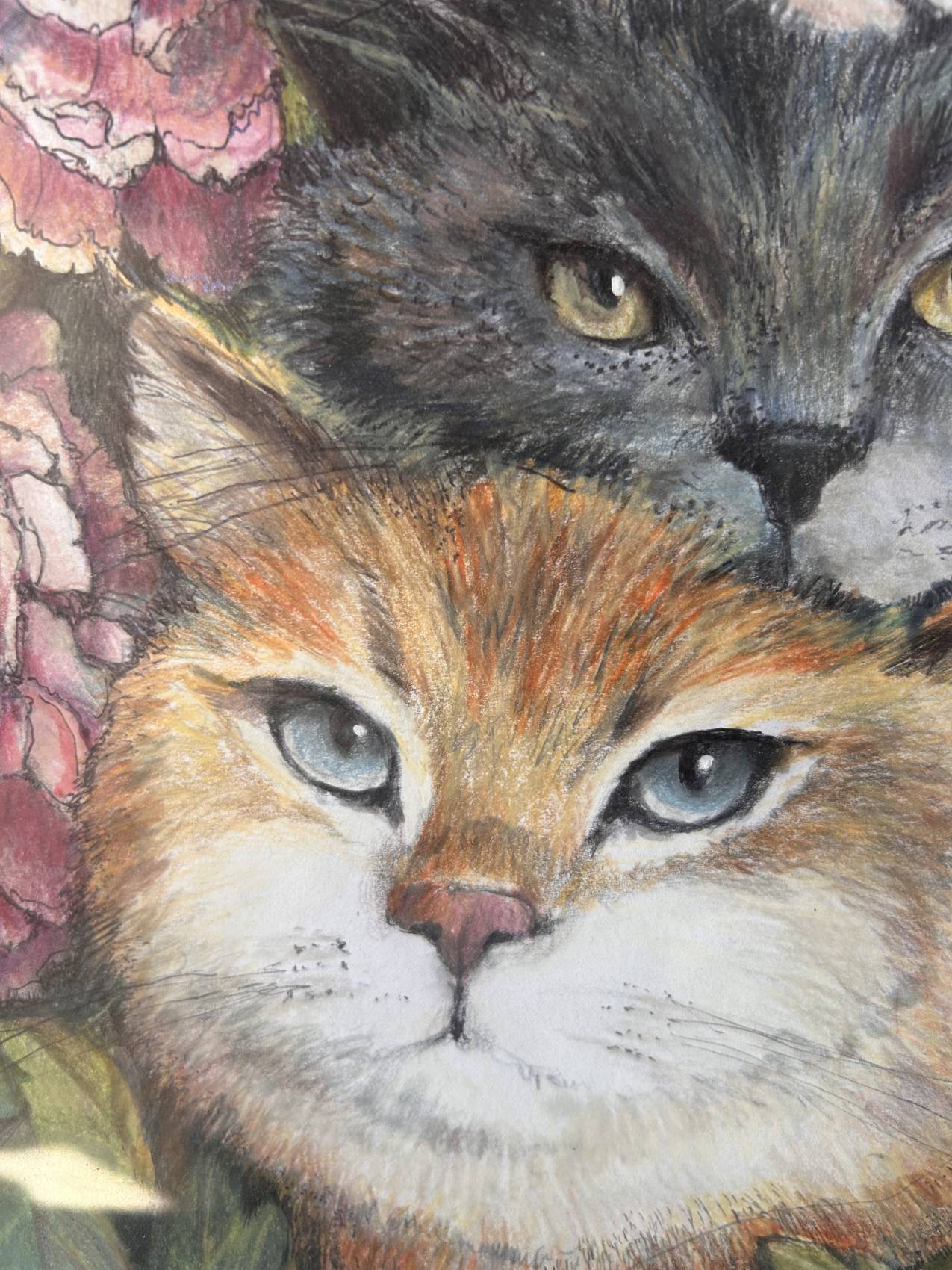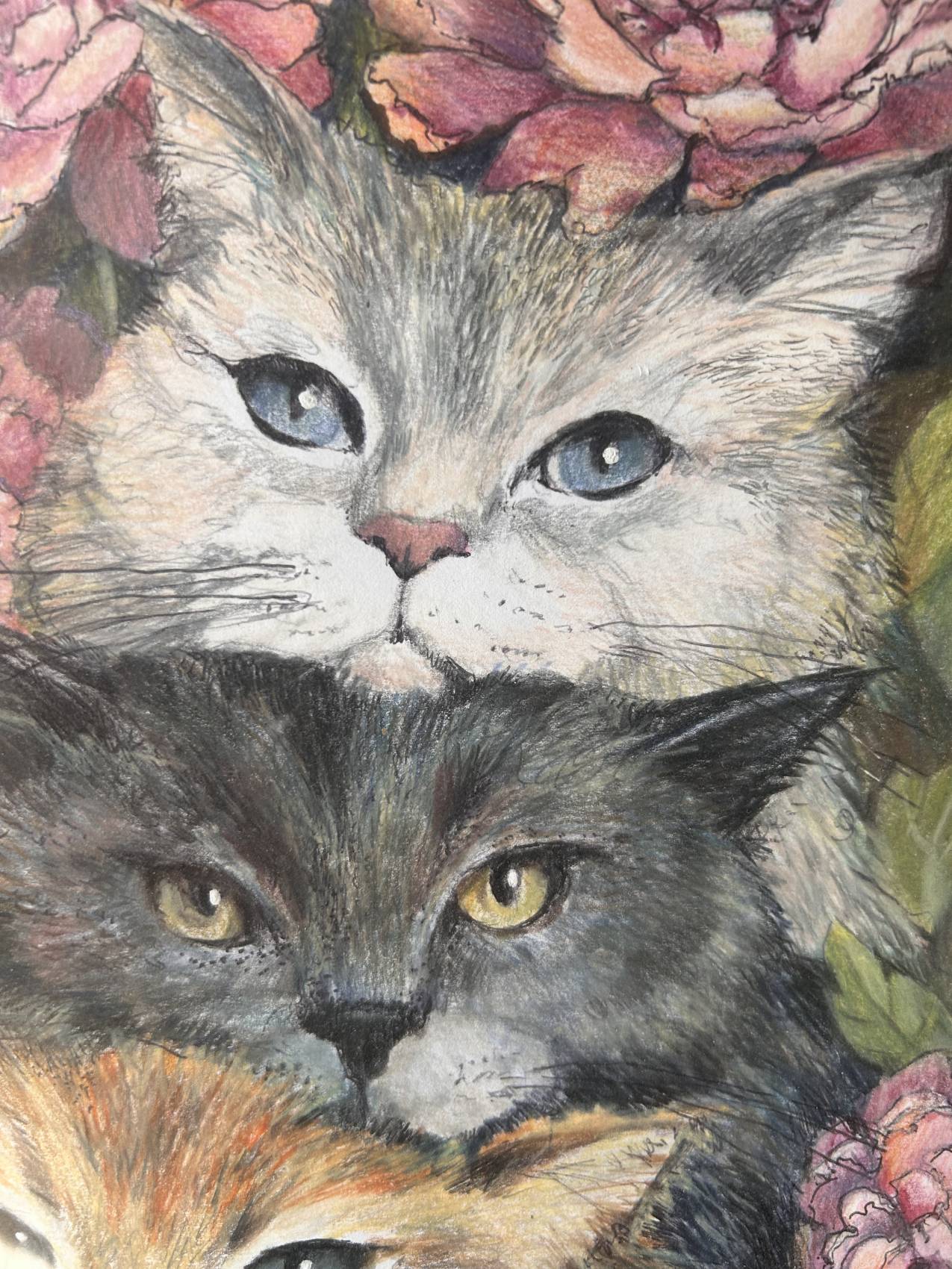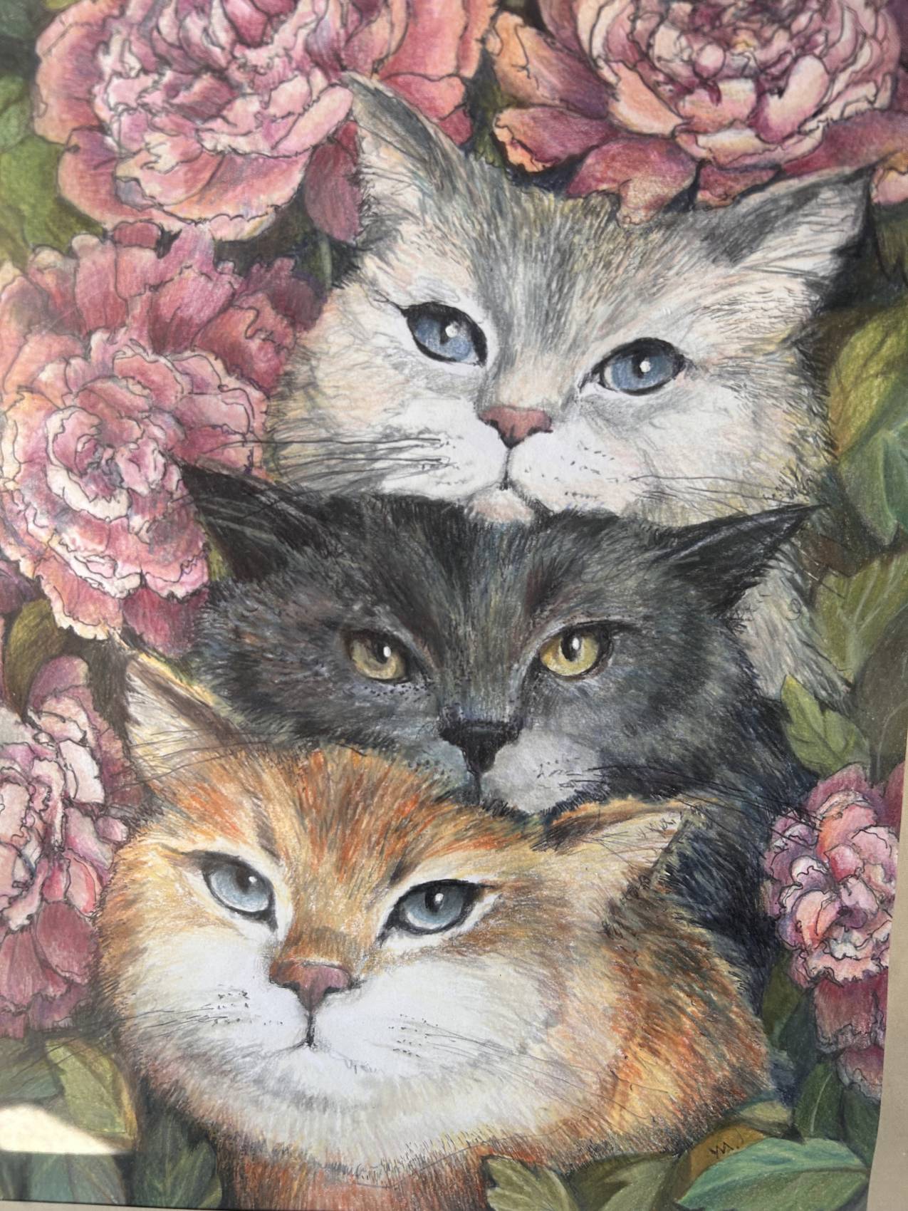 Tableau aquarelle technique mixte “Trois chats aux pivoines” Adopté