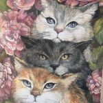 Tableau aquarelle technique mixte “Trois chats aux pivoines” ADOPTÉ