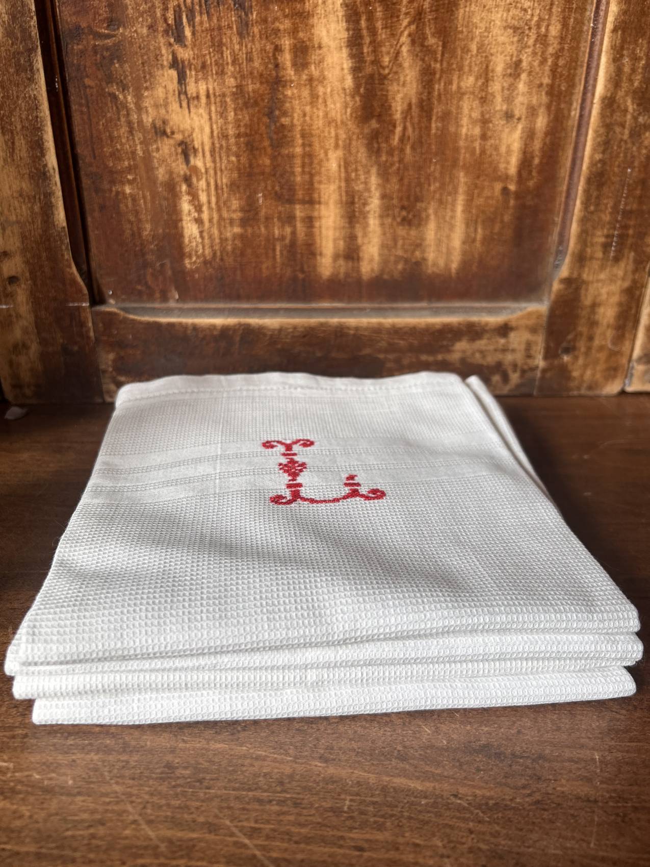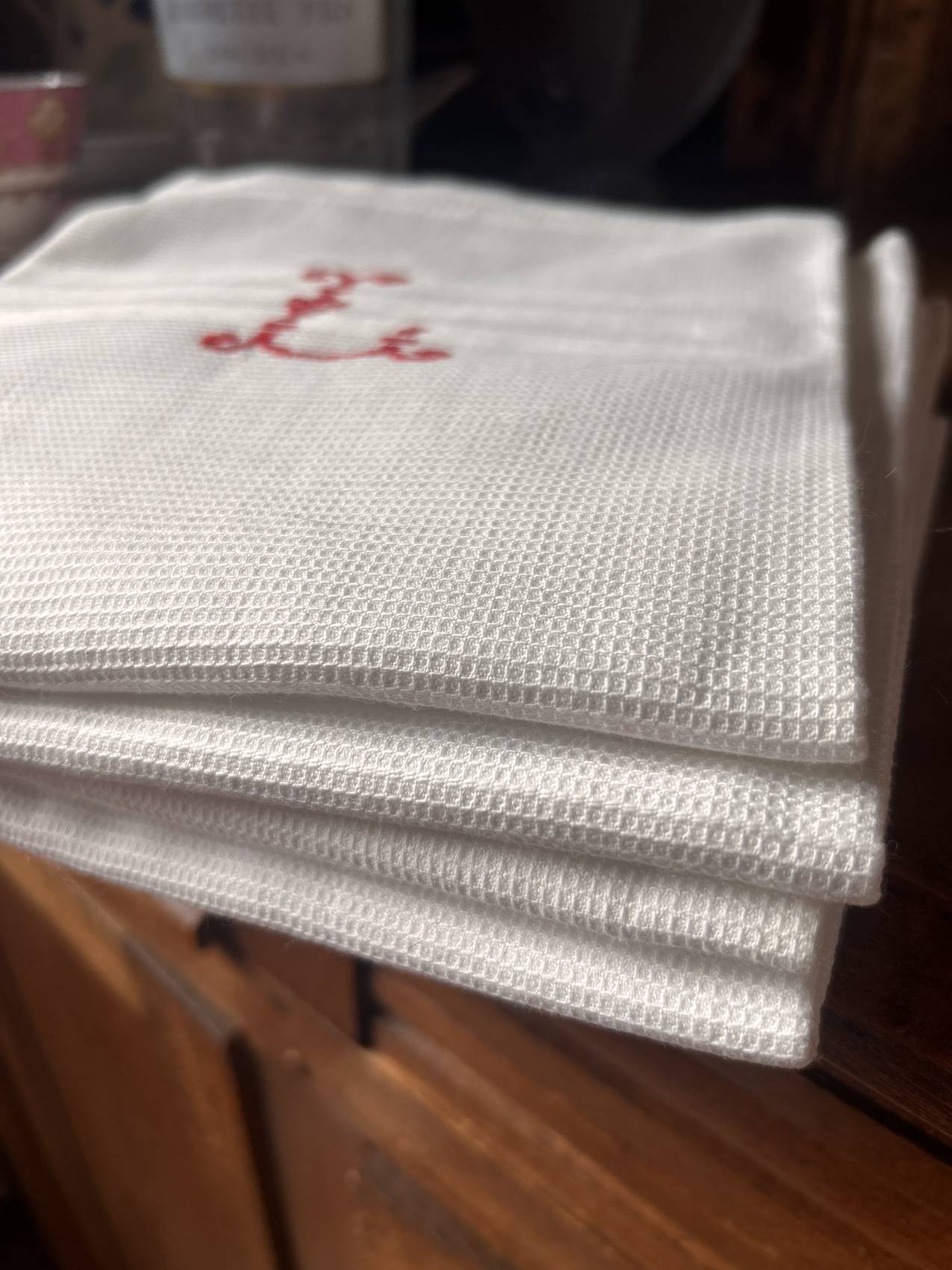 Ce lot de quatre serviettes en coton nid d’abeille est orné d’un monogramme “L” brodé au point de croix.