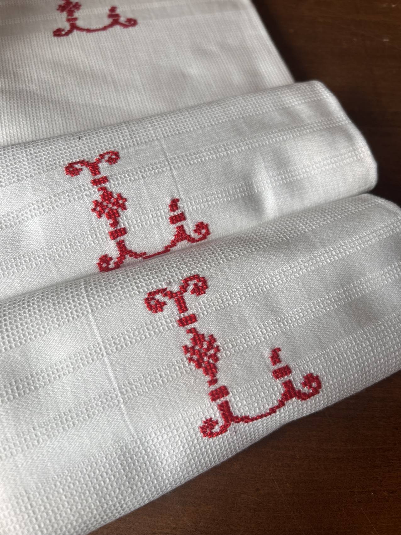 Lot de 3 serviettes anciennes en coton nid d’abeille monogramme L – début 1900 Le charme d’antan