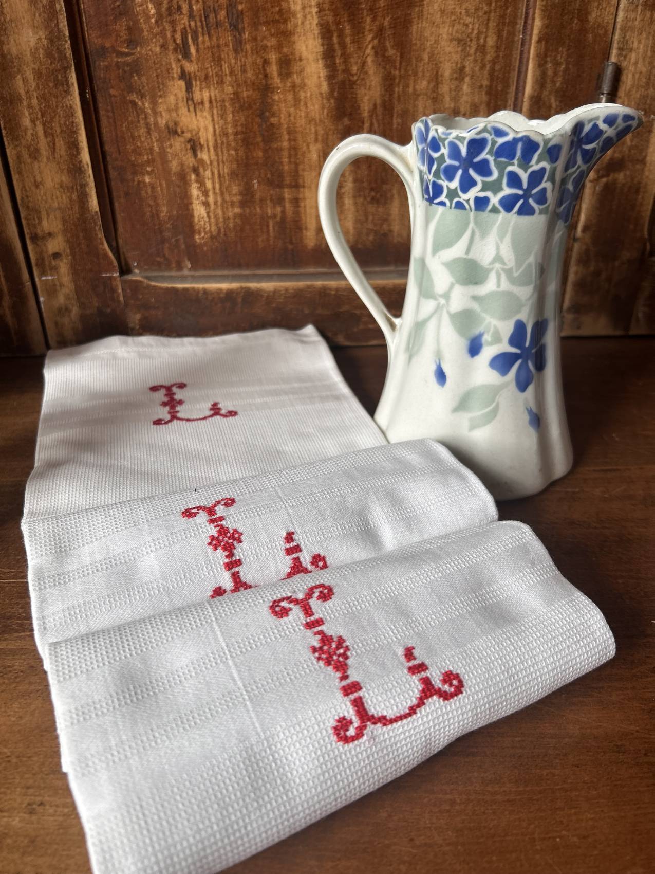 Trio de serviettes anciennes nid d’abeille monogramme LG vert – Un must have