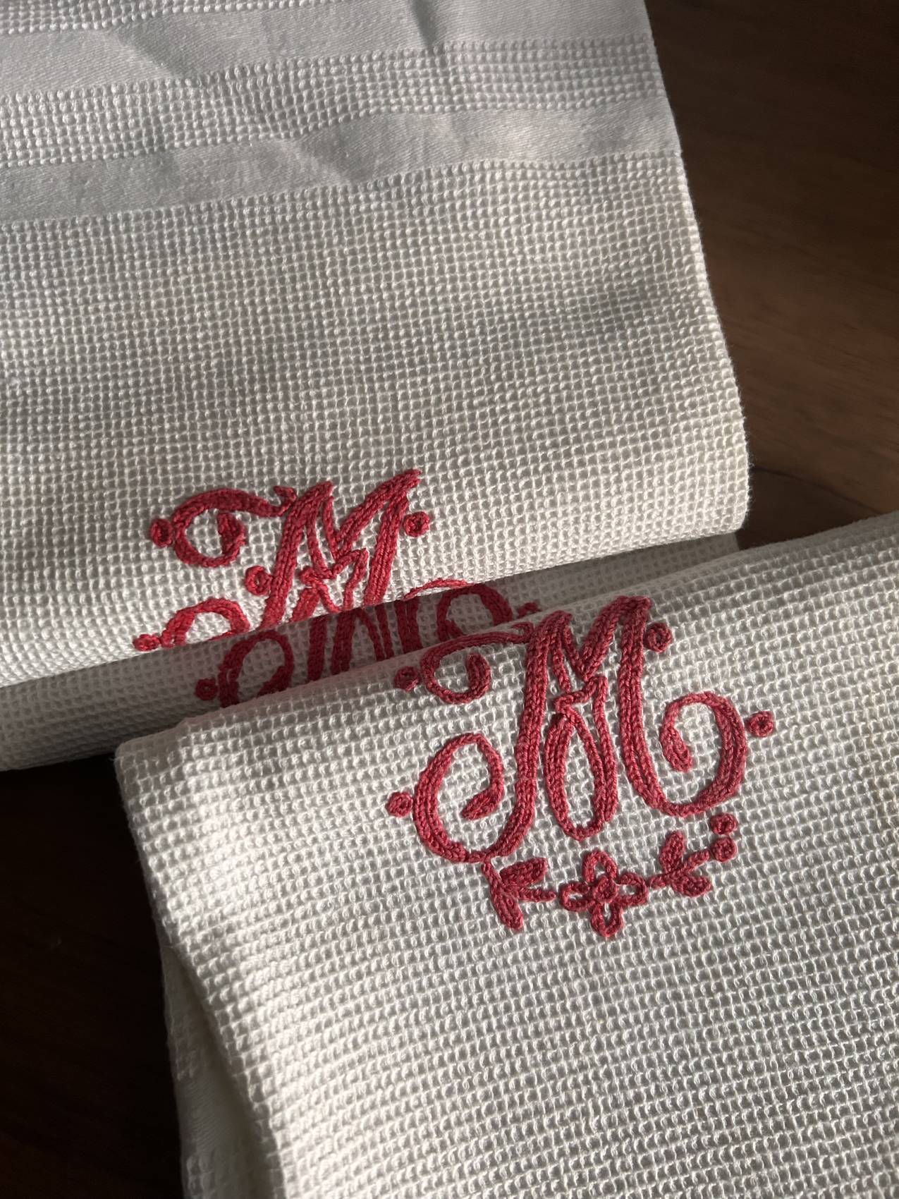 Oui, le monogramme M est brodé entièrement à la main, ce qui leur donne beaucoup de charme et d’authenticité.