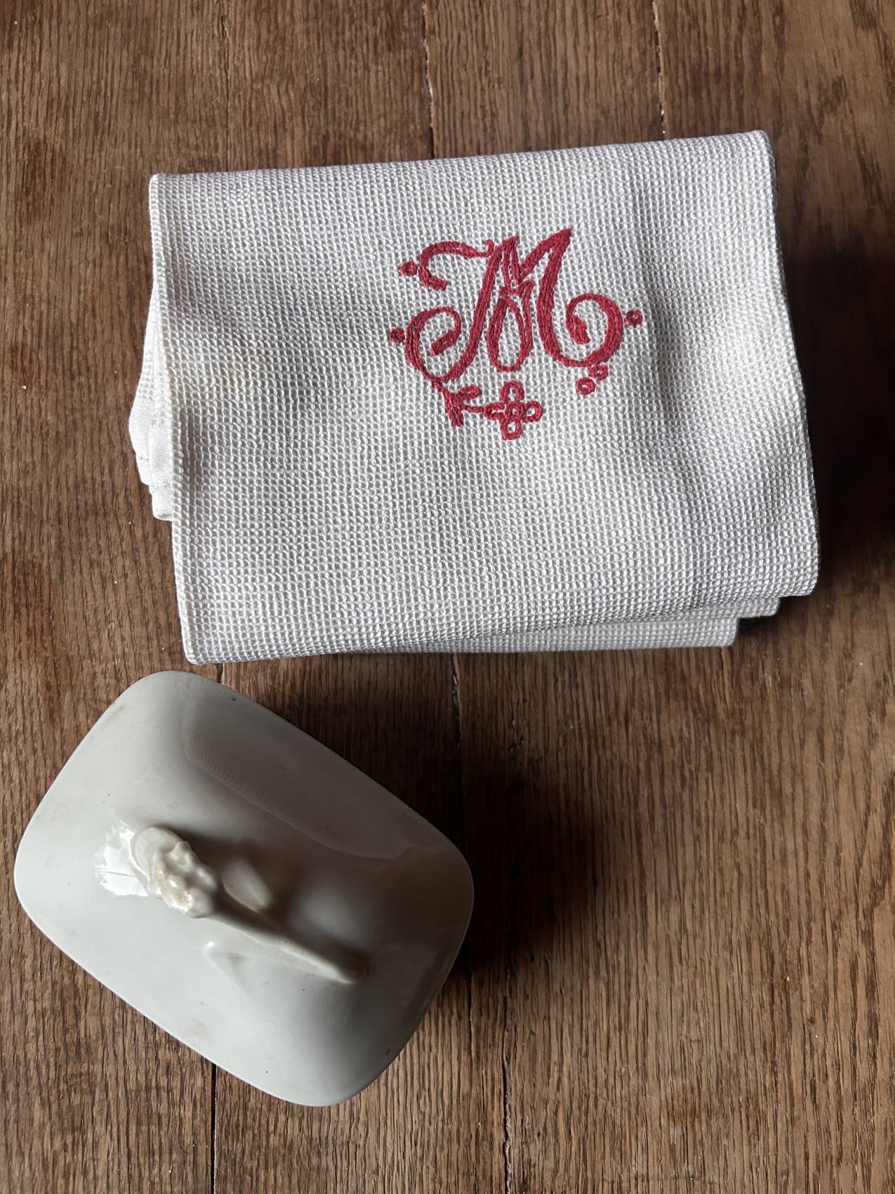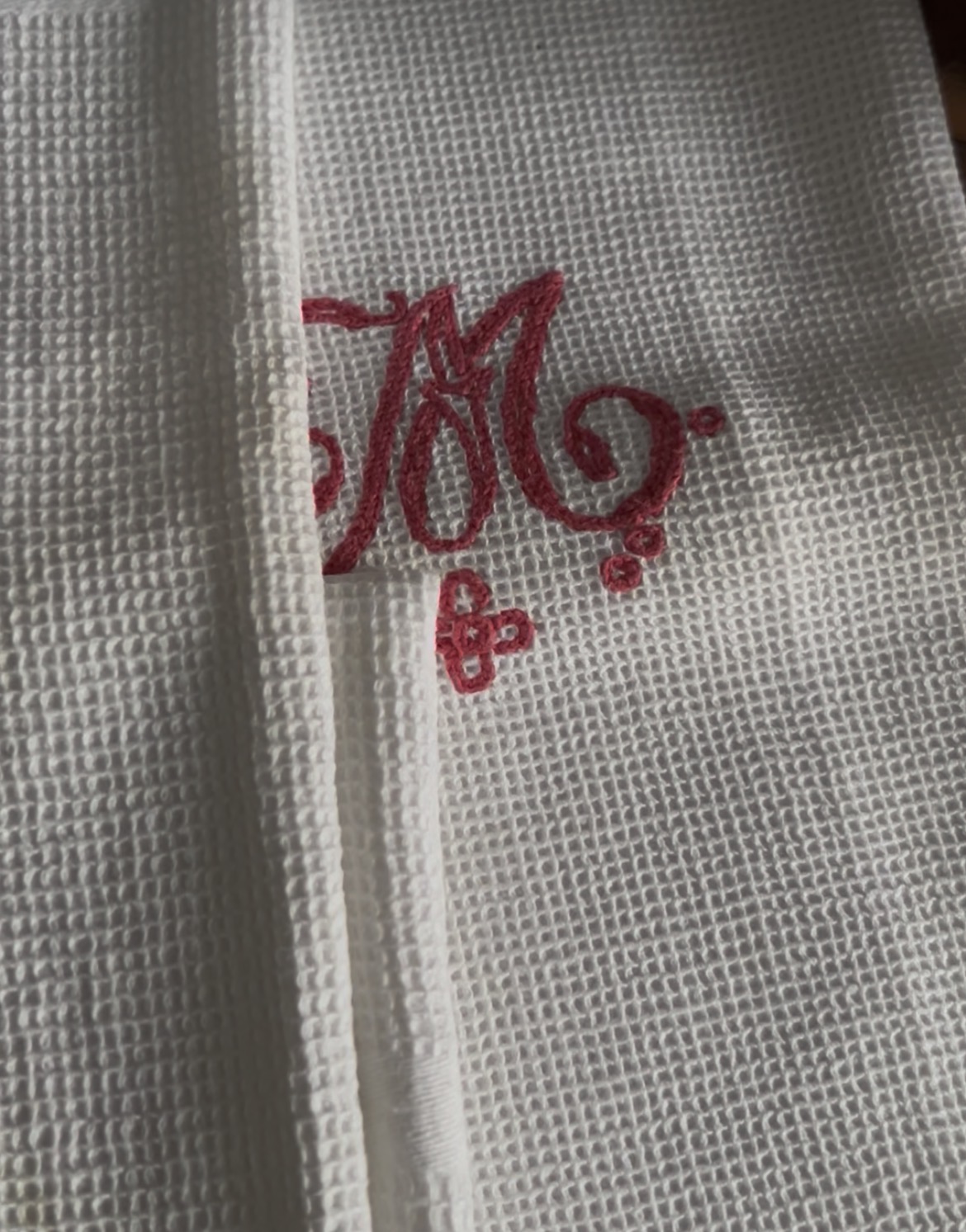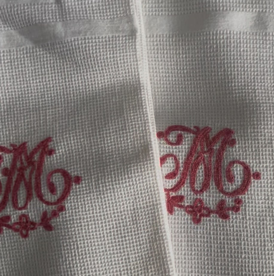 Ensuite, le monogramme M brodé main apporte cette petite émotion qu’on ne retrouve pas dans le neuf. On imagine une armoire ancienne, un trousseau préparé avec soin, une maison vivante. Ce sont des pièces qui racontent quelque chose sans faire de bruit dans une discrétion élégante.
