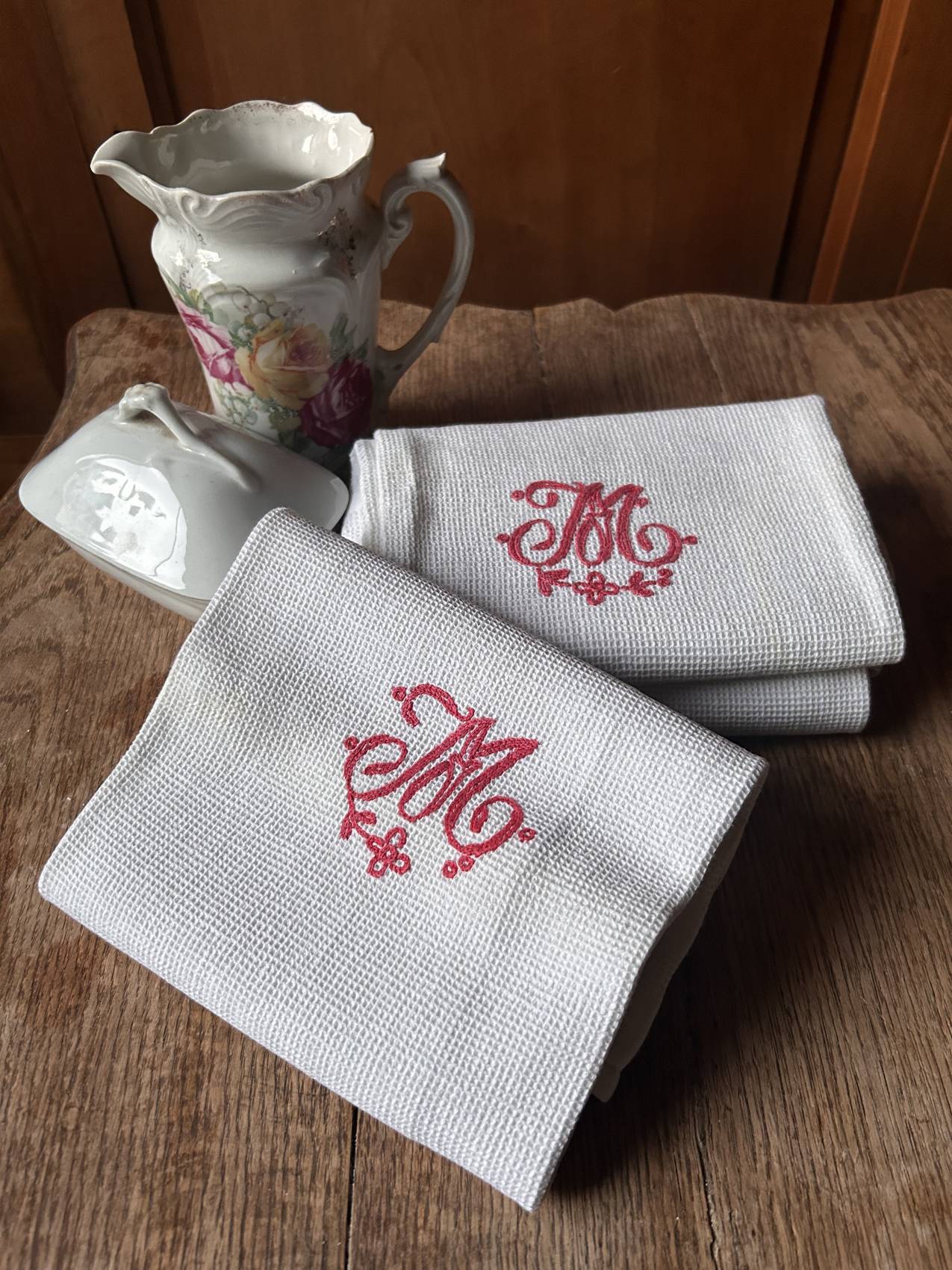 Ce sont de belles pièces anciennes, devenues rares, idéales pour une salle de bain pleine d’âme, une maison de famille, un cadeau délicat ou un trousseau poétique.
