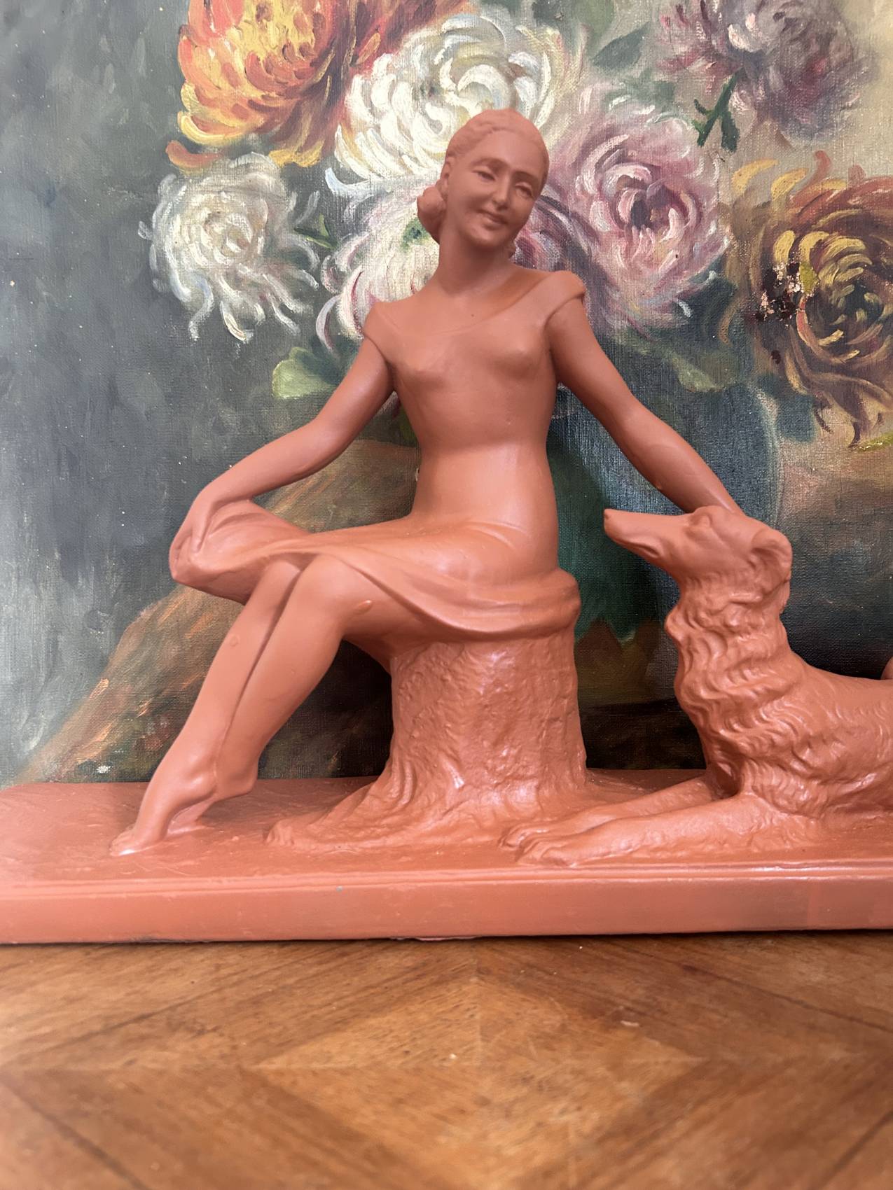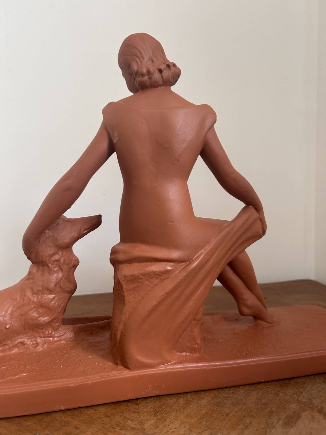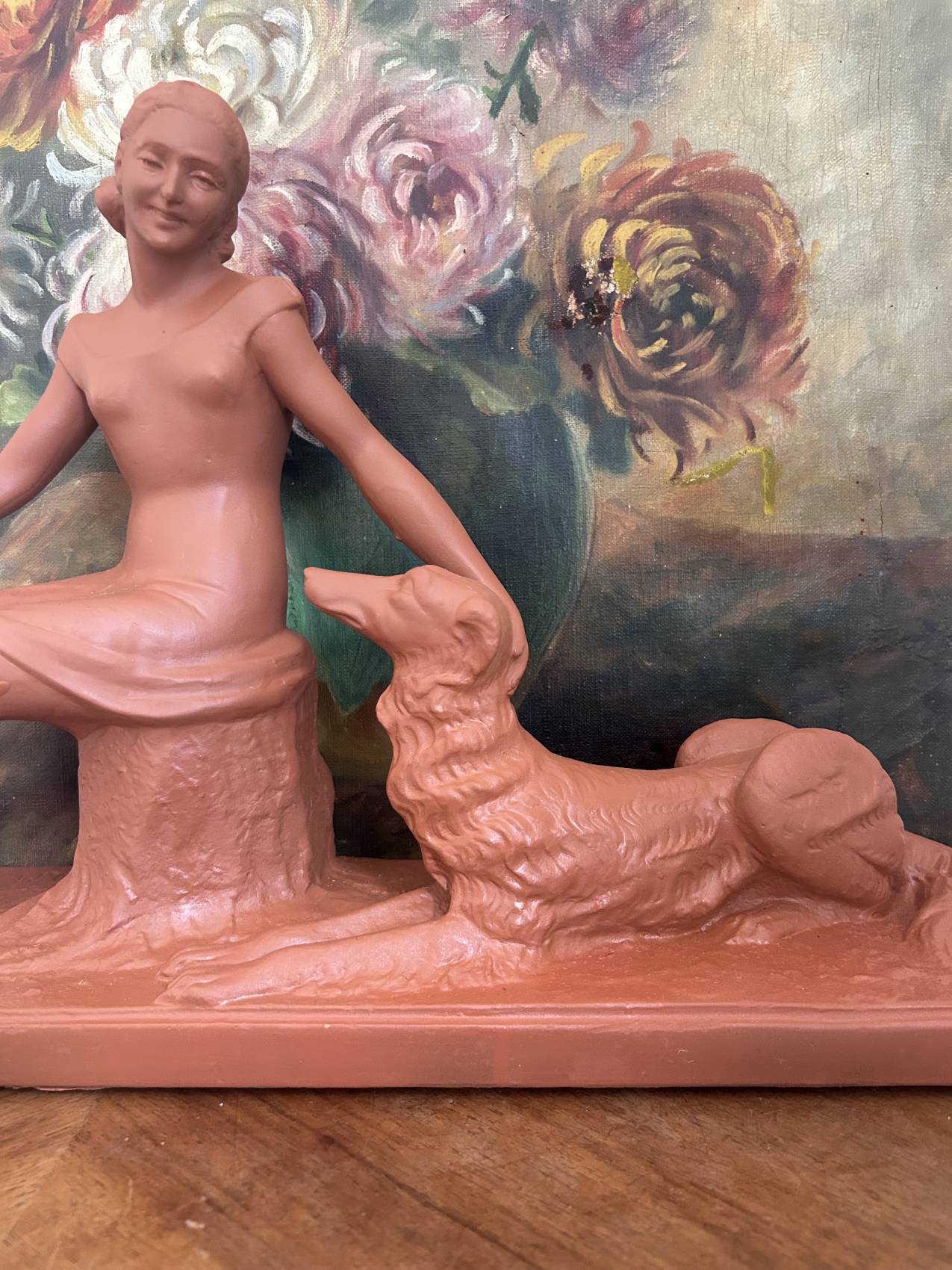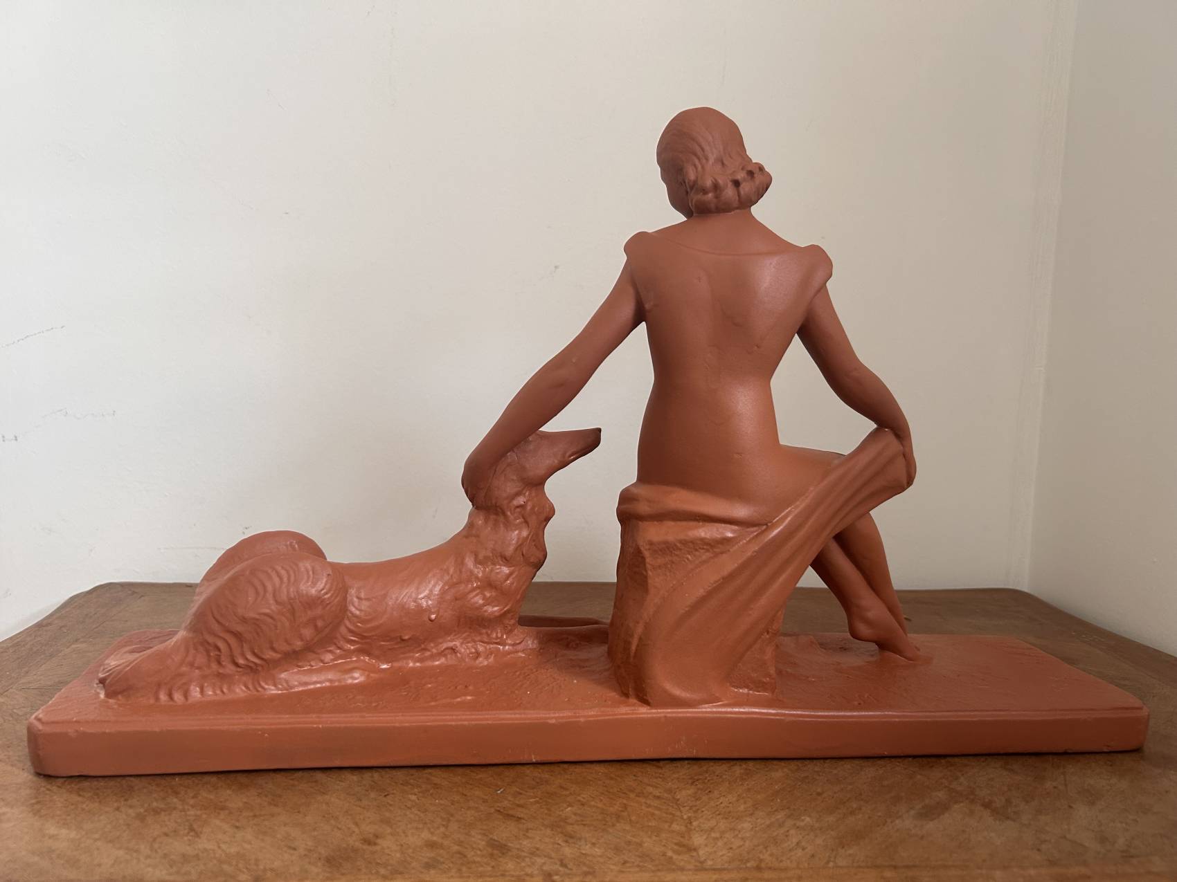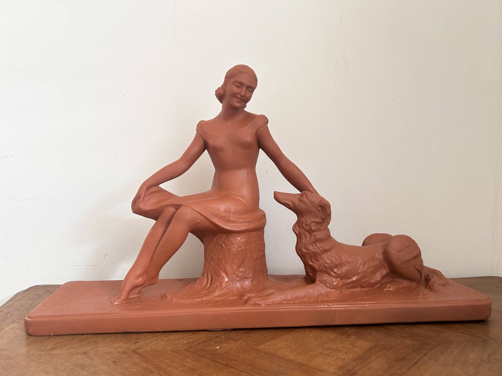 Grande Sculpture art déco ancienne “L’amitié” Femme au chien lévrier