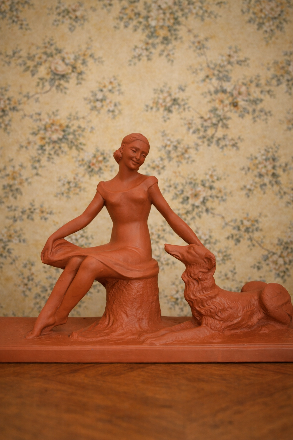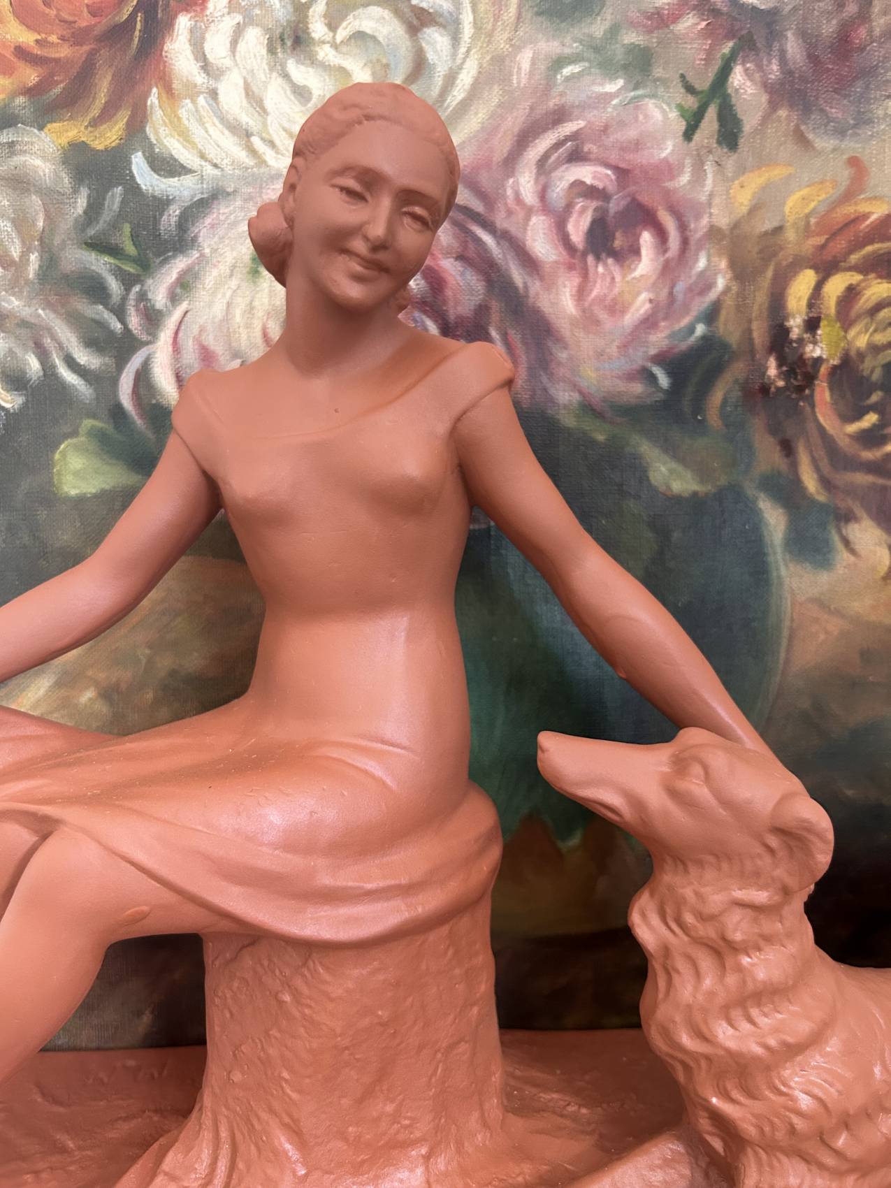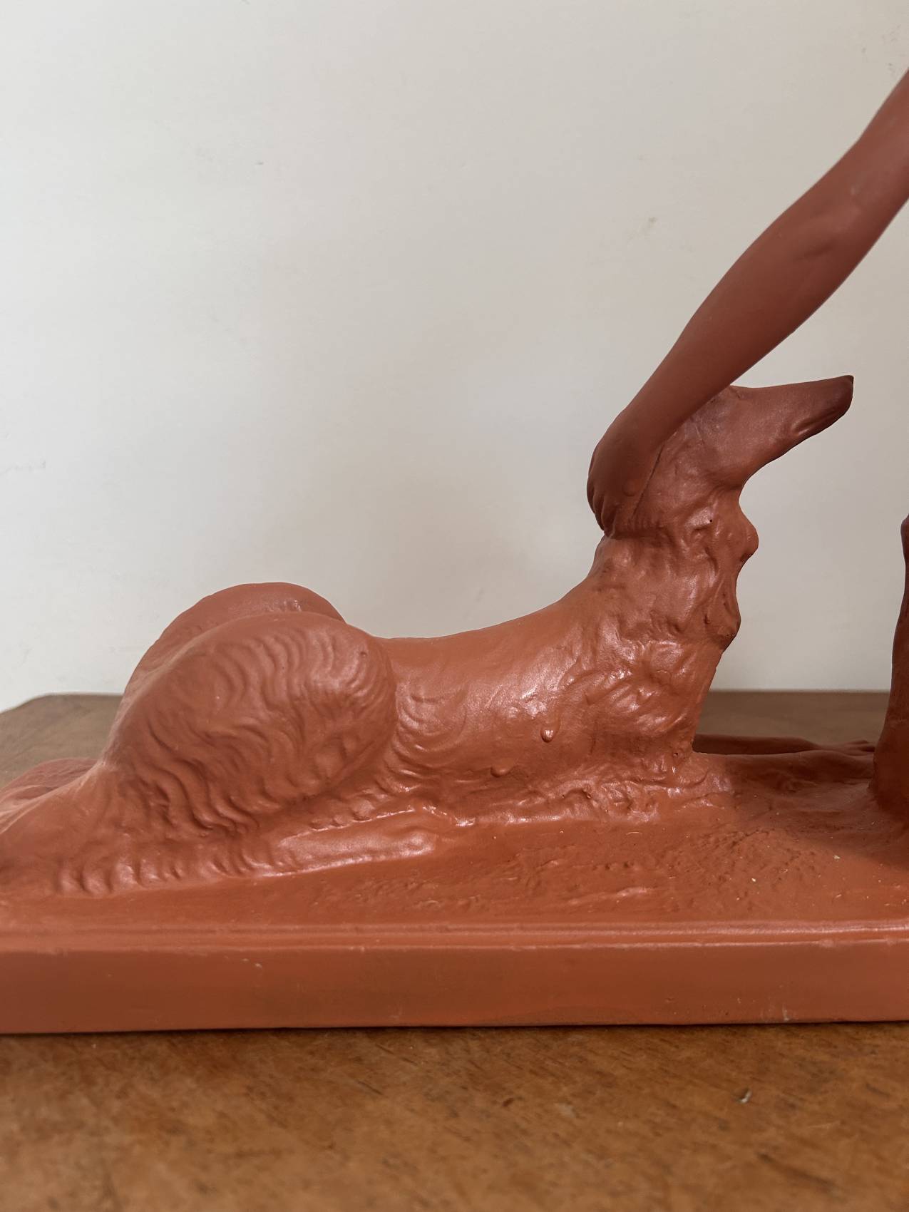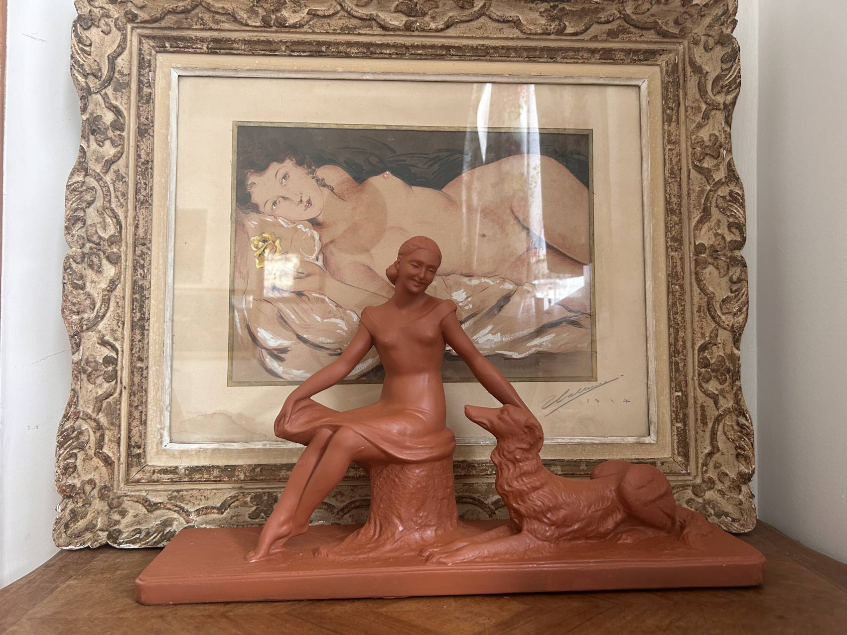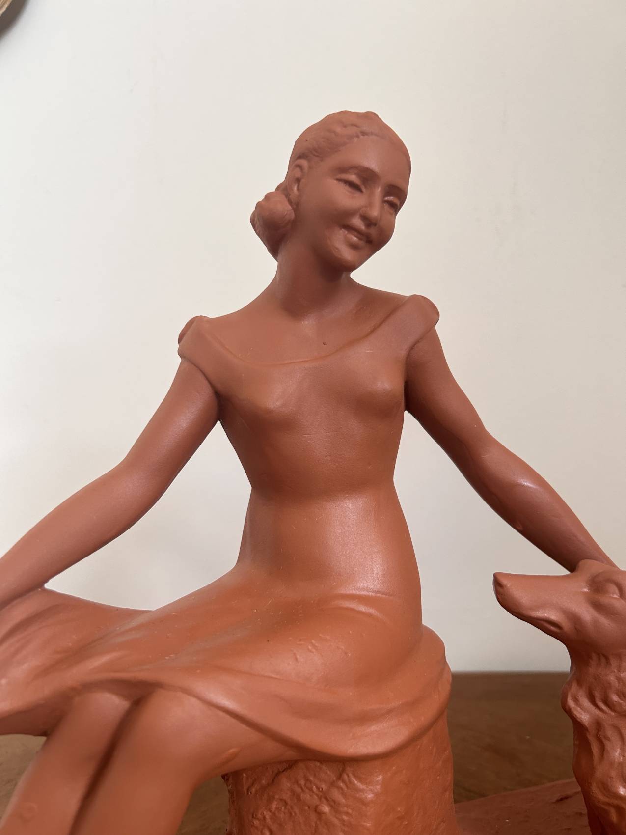 Grande Sculpture art déco ancienne “L’amitié” Femme au chien lévrier