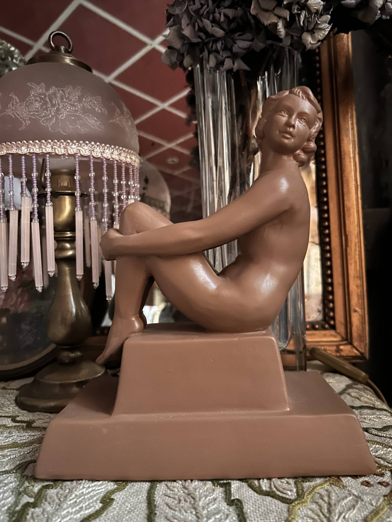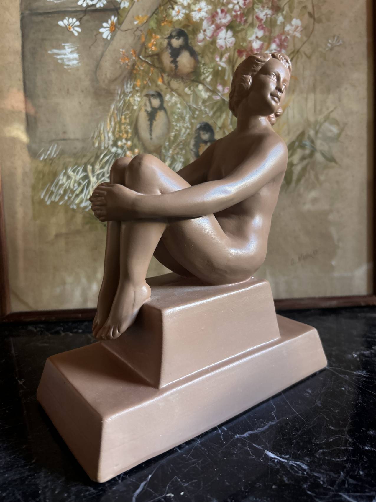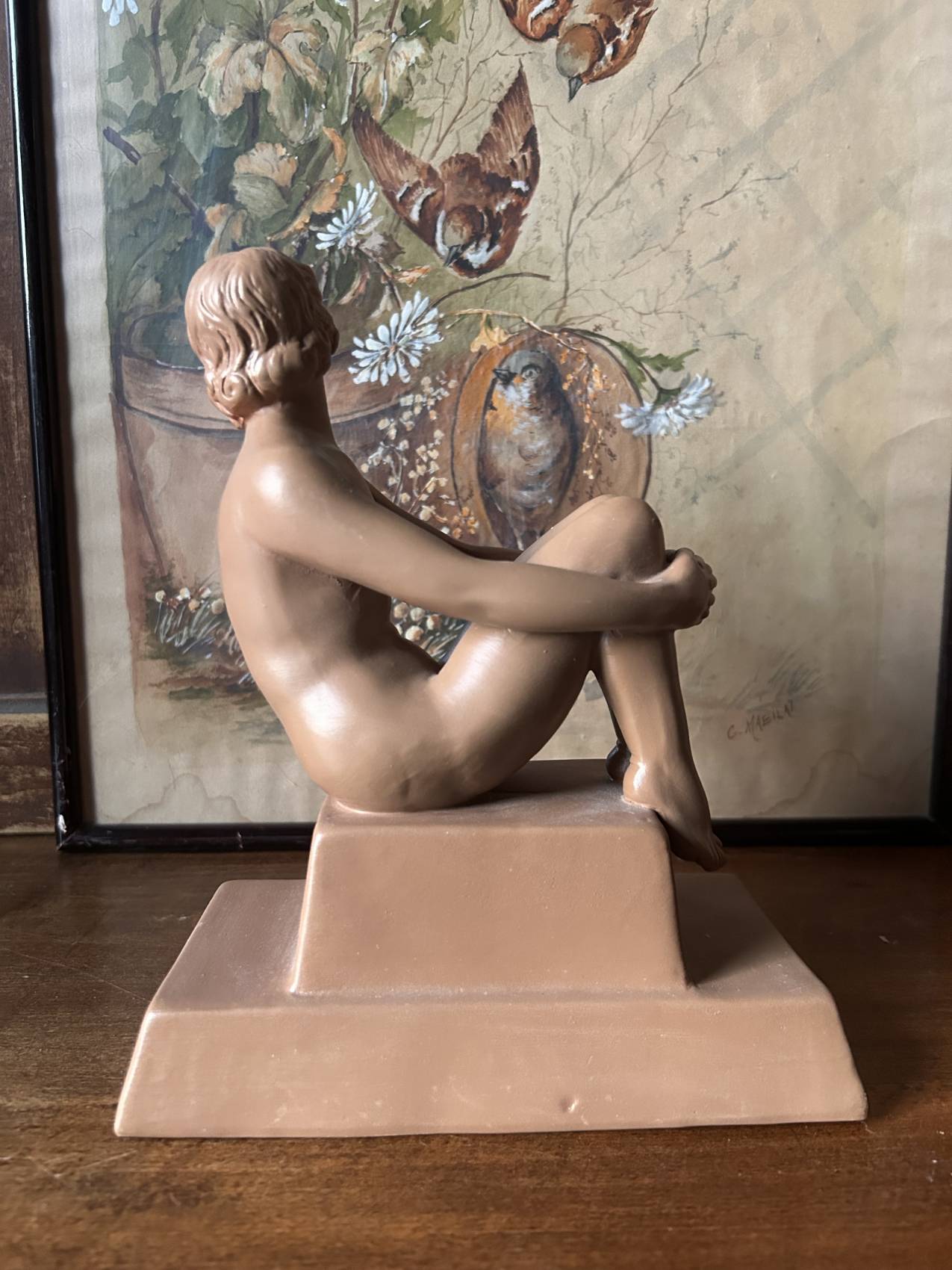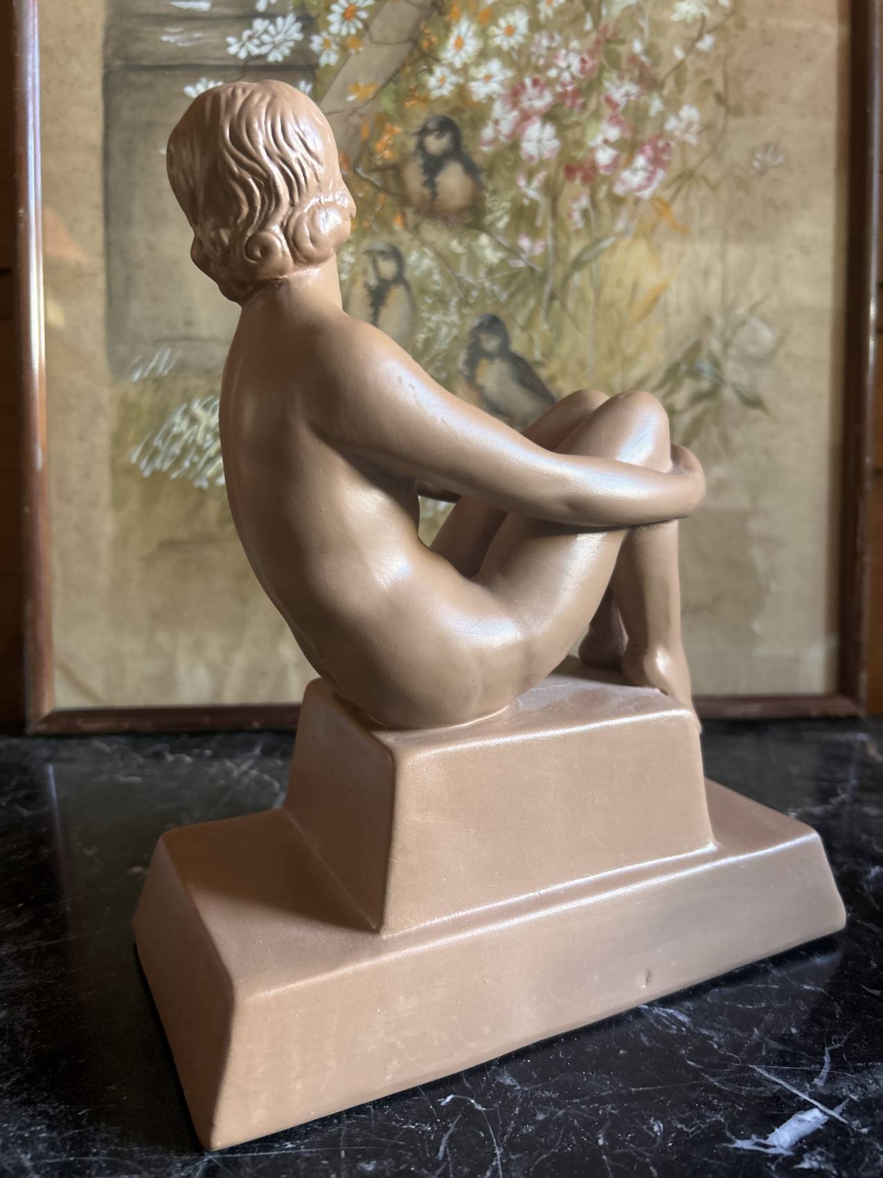 Cette sculpture Art déco représente une femme nue assise, dans une posture douce et naturelle. Les lignes sont épurées. Le corps est stylisé tout est dans l’équilibre. On est pile dans l’esthétique des années 1920-1930.