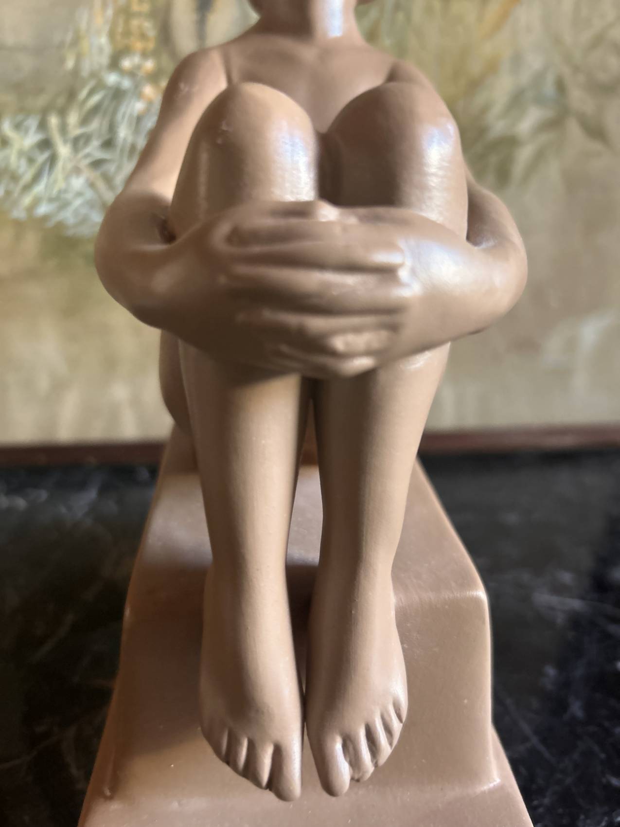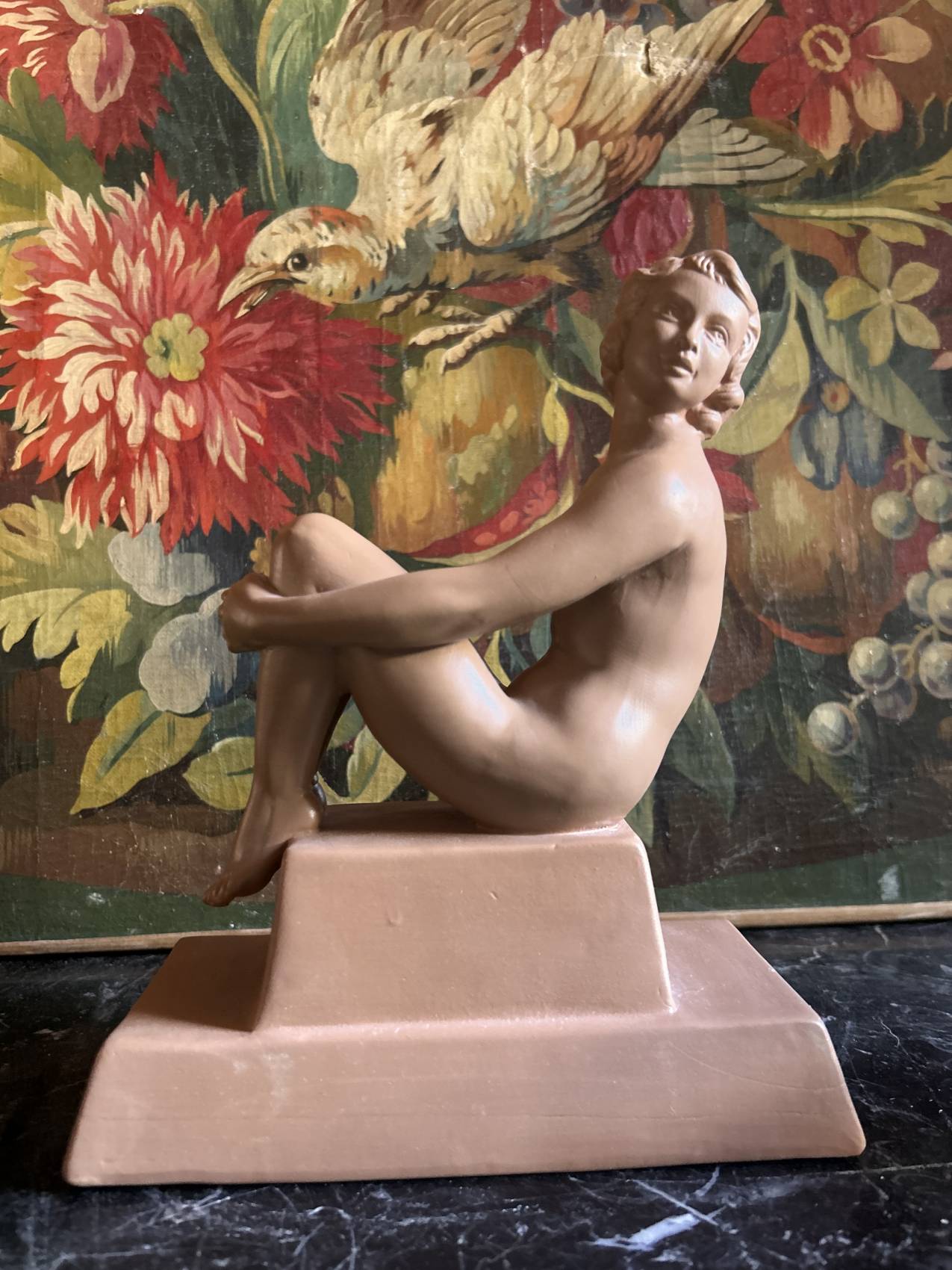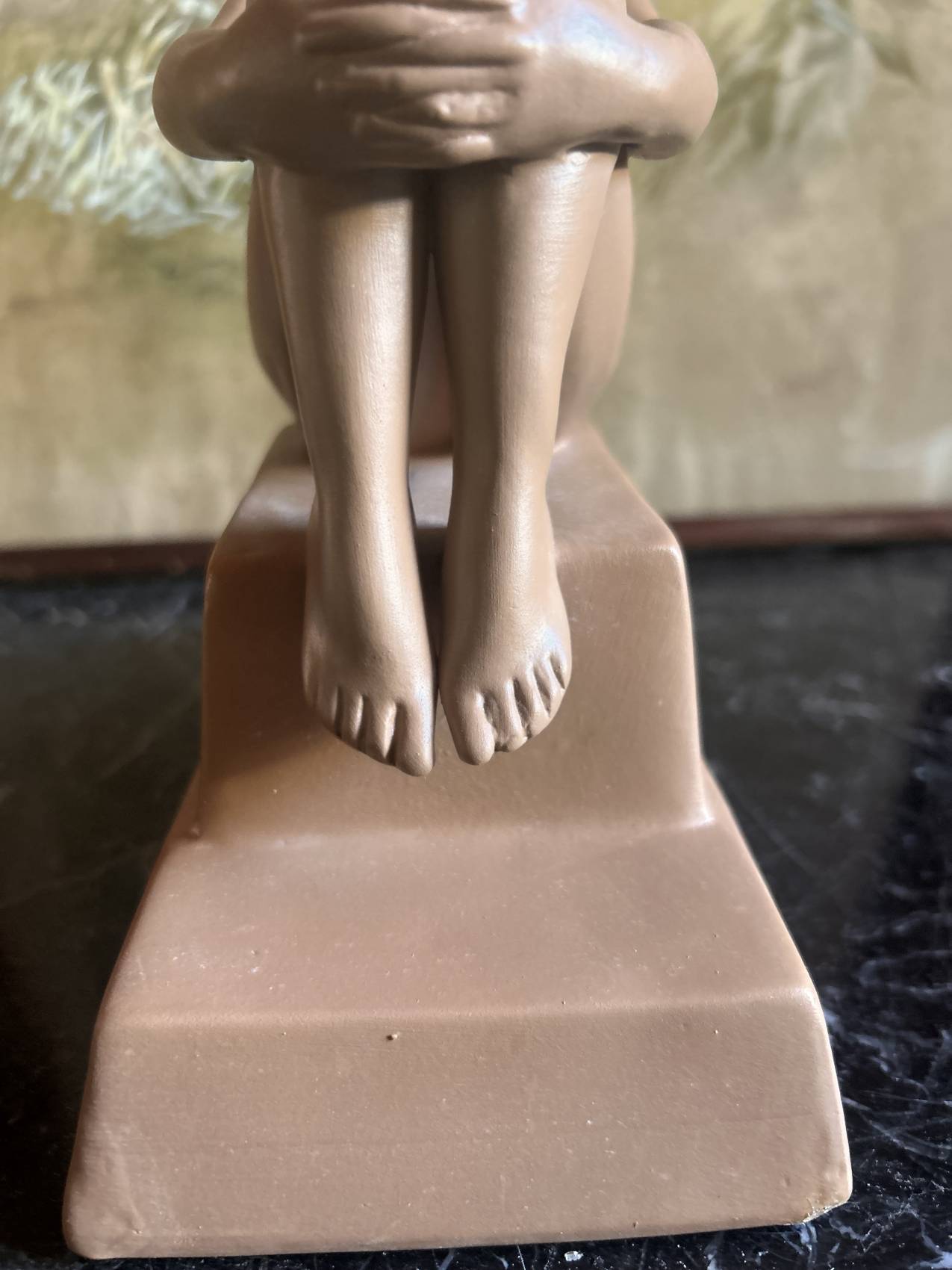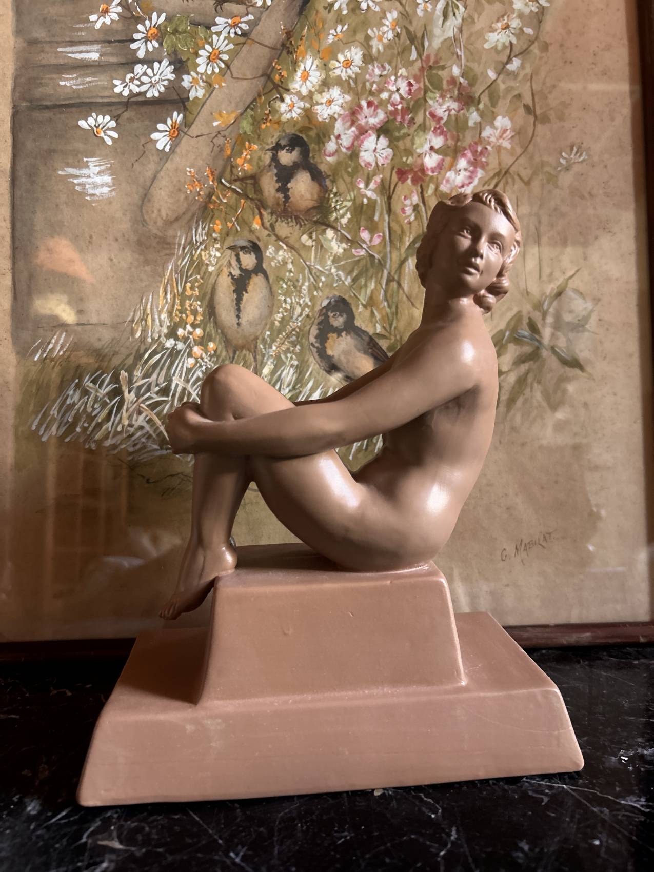 Cette sculpture Art déco représente une femme nue assise, dans une posture douce et naturelle. Les lignes sont épurées. Le corps est stylisé tout est dans l’équilibre. On est pile dans l’esthétique des années 1920-1930.