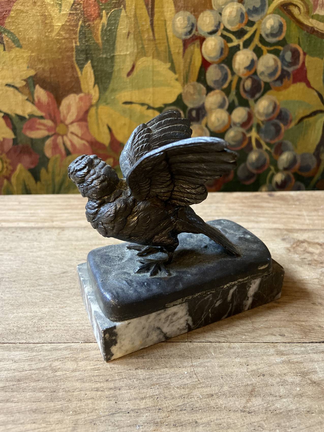 Le choix du régule, alliage souvent utilisé pour les sculptures à l’époque, permet une finition précise et délicate, restituant les textures de l’oiseau, des plumes jusqu’à l’expression du regard. Le socle en marbre ajoute une touche de raffinement et de stabilité, contrastant avec la légèreté apparente de l’oiseau.