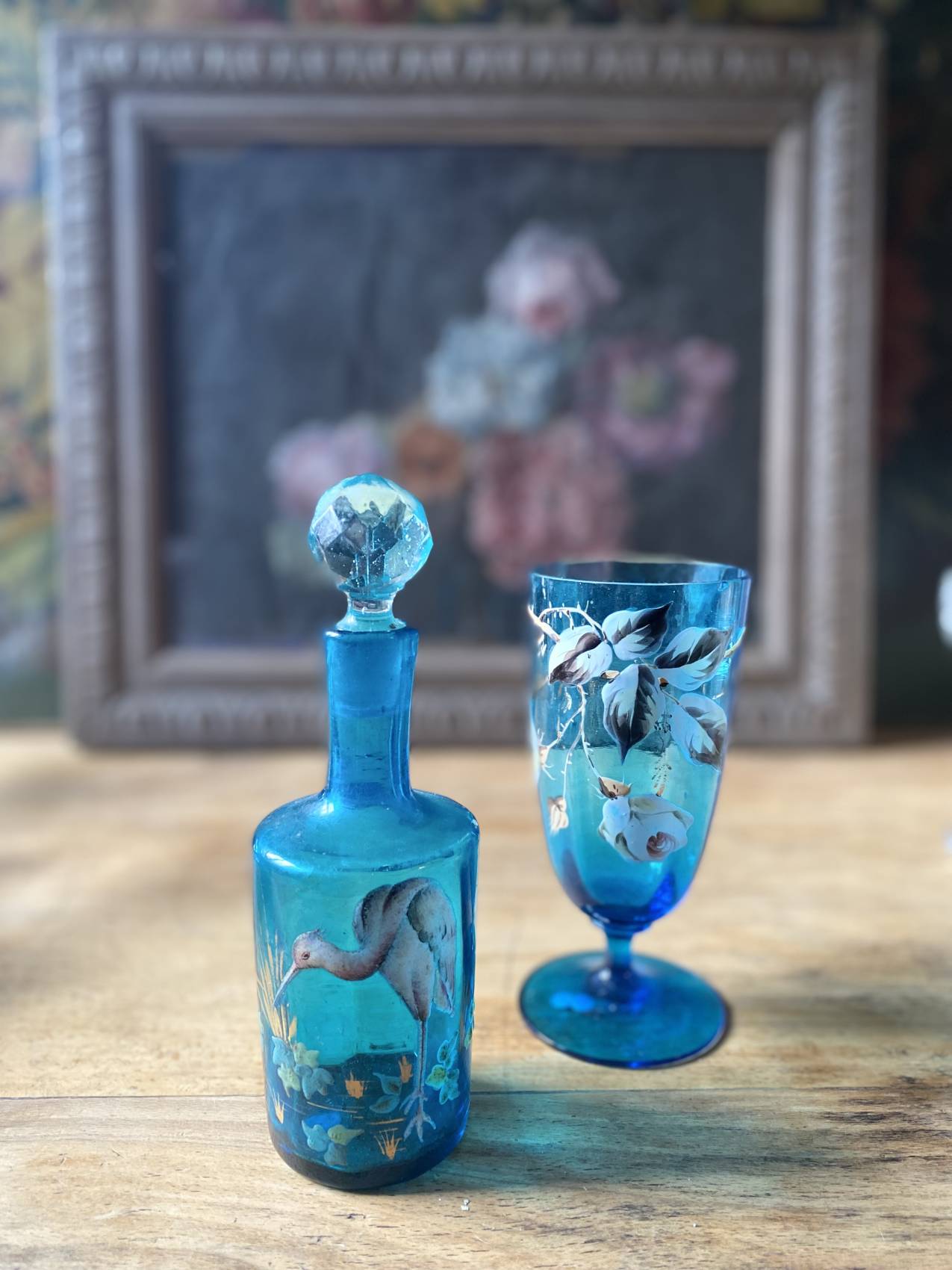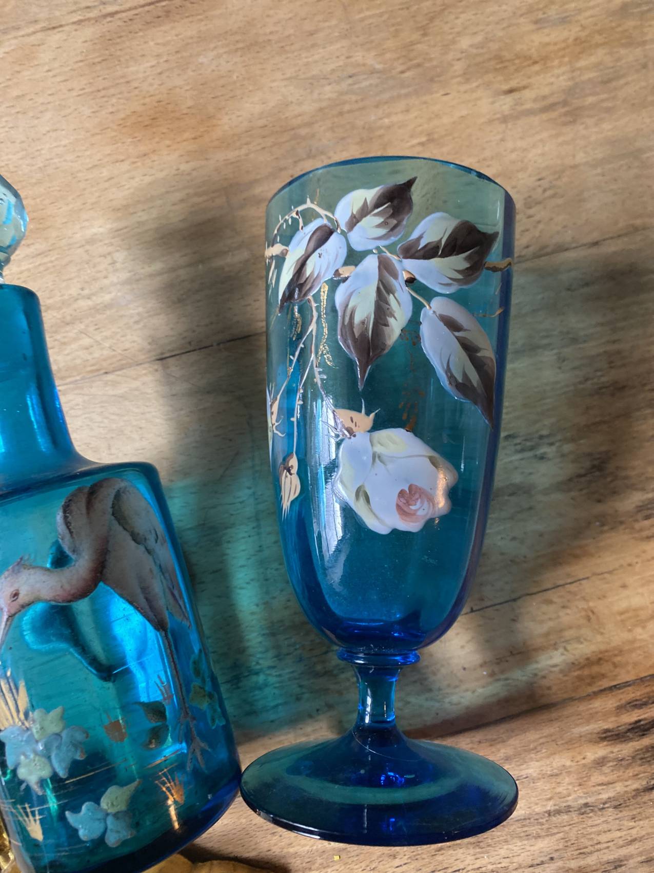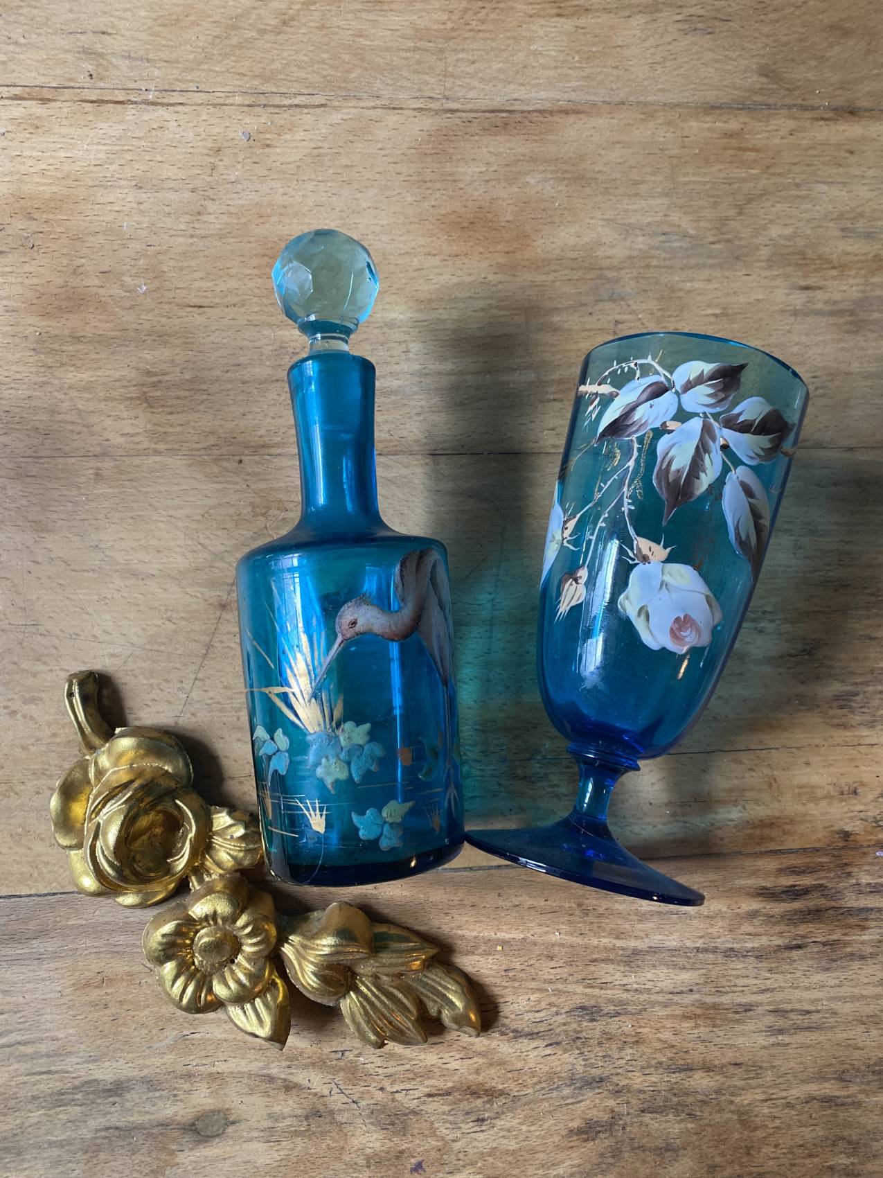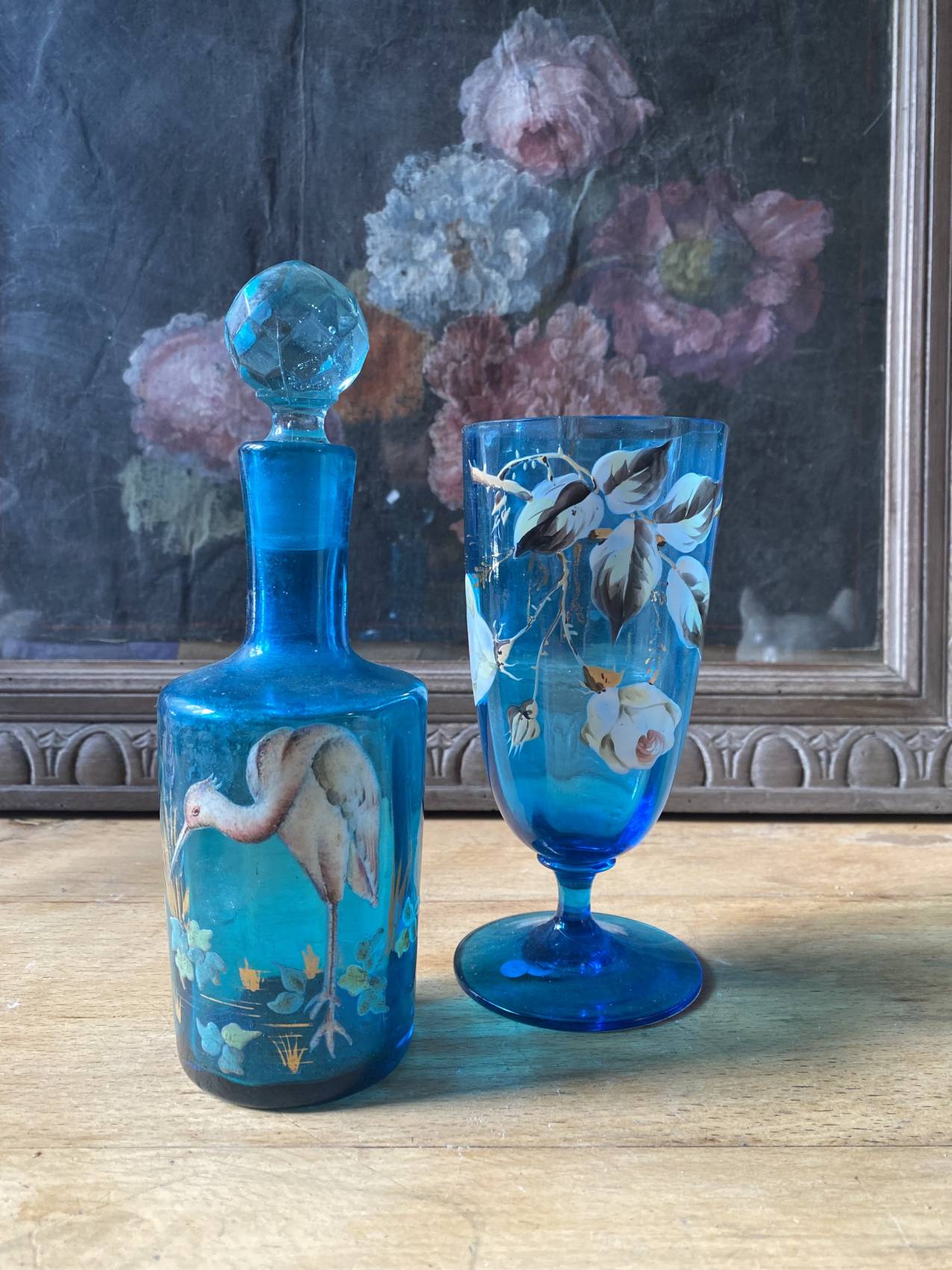Duo carafe et verre en verre bleu – Époque 1900 à motifs émaillés de fleurs et d’oiseaux