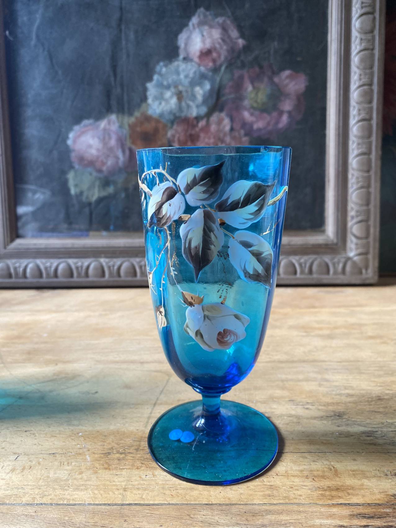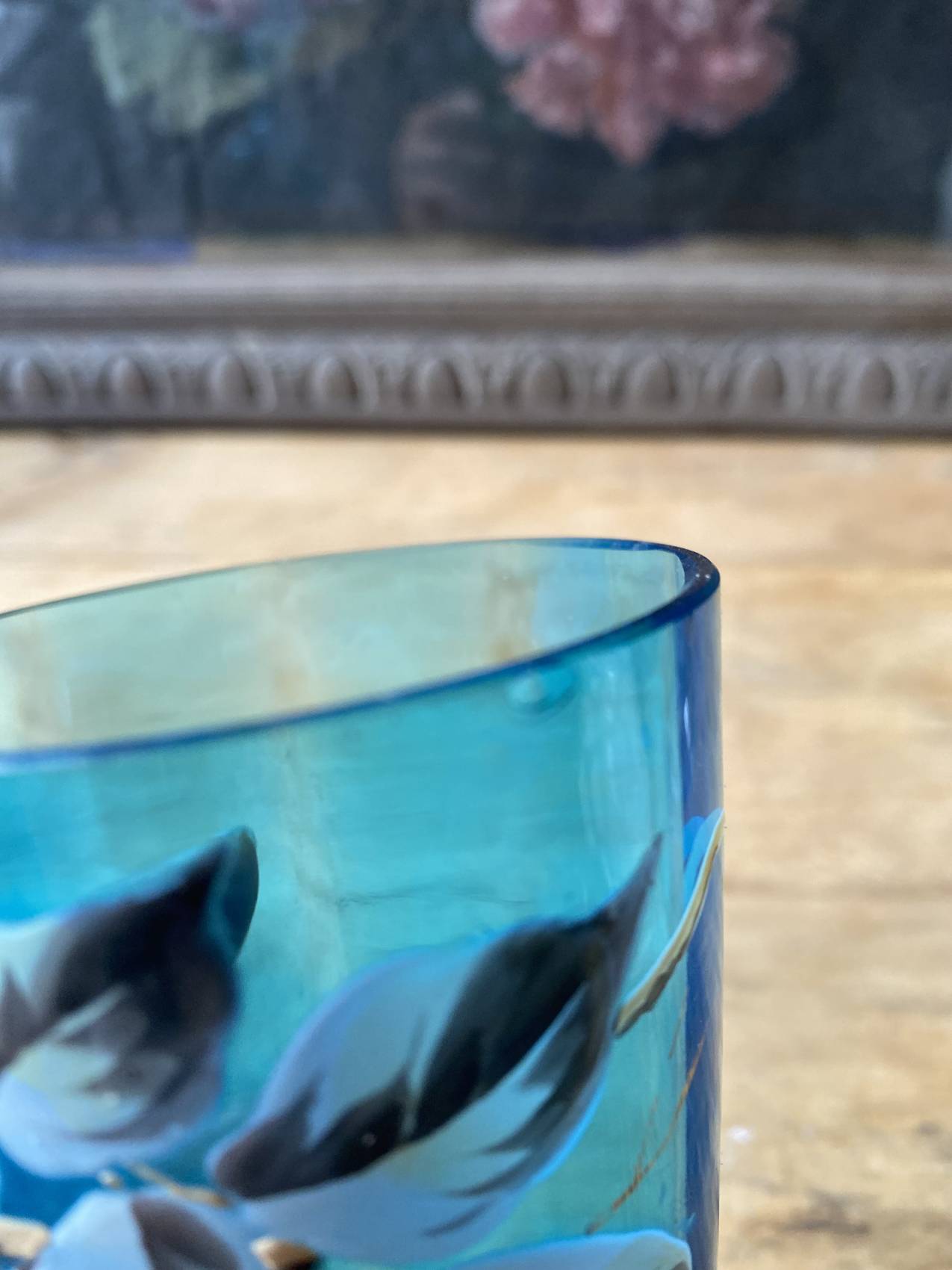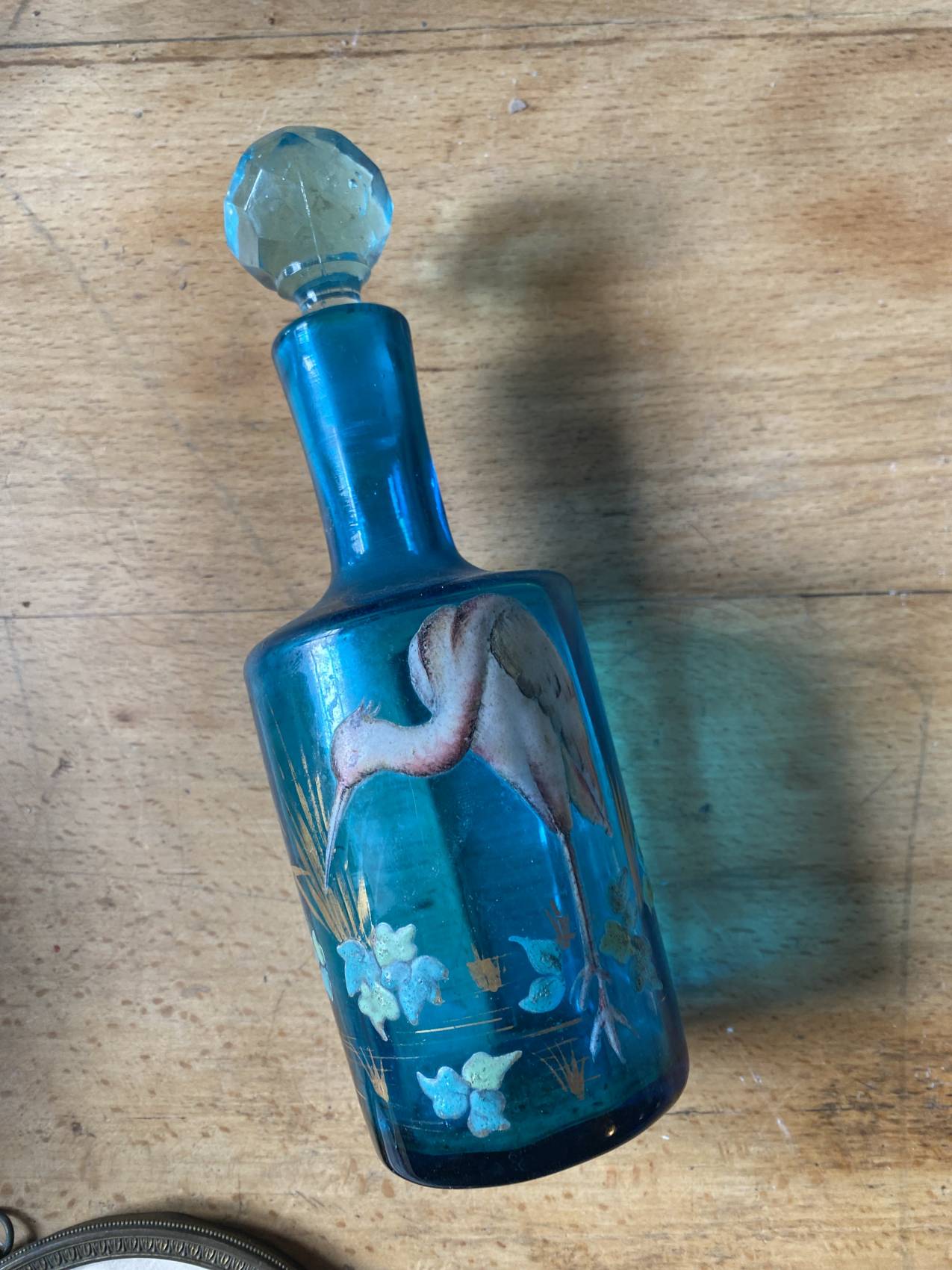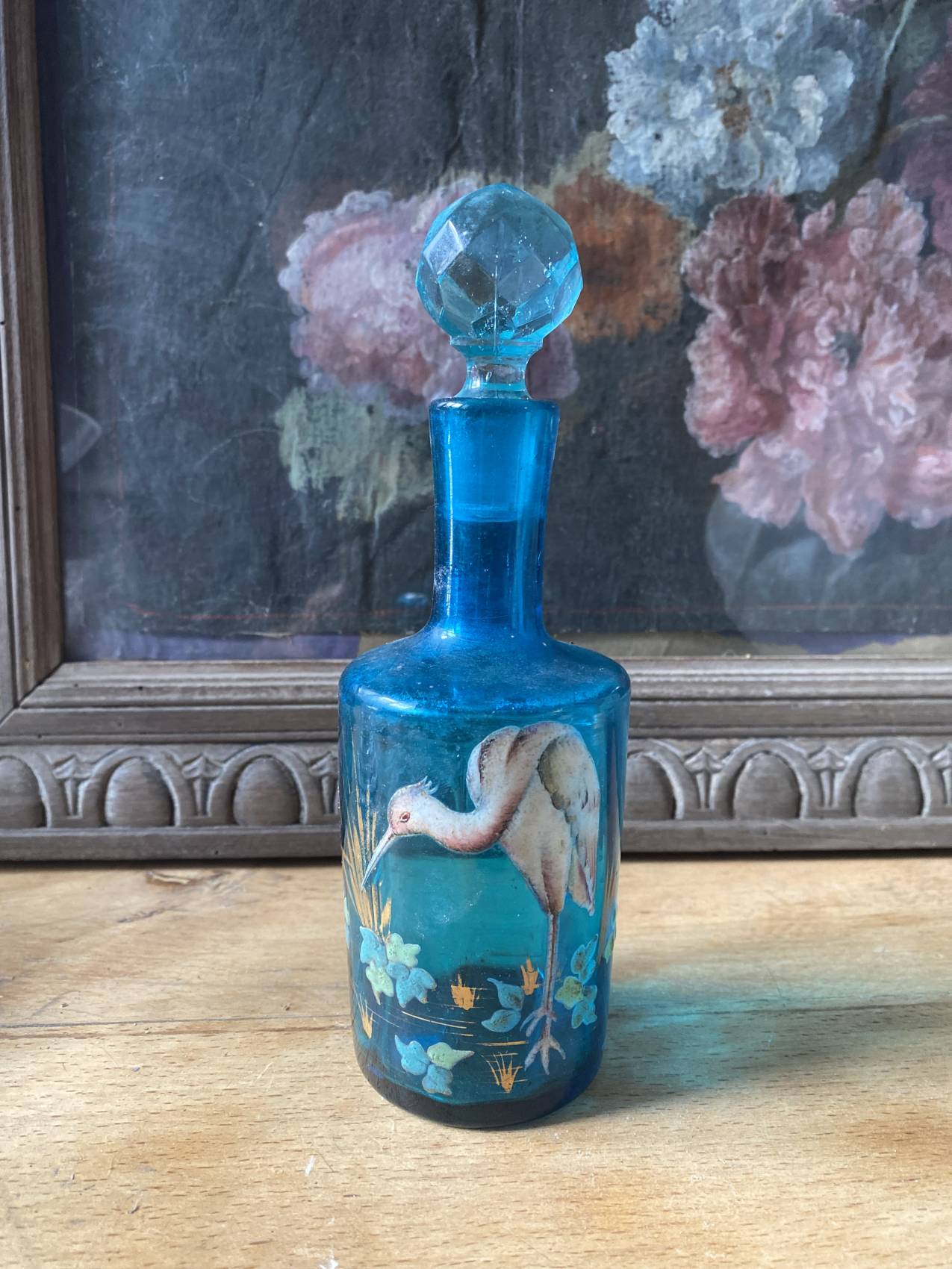 Duo carafe et verre en verre bleu – Époque 1900 à motifs émaillés de fleurs et d’oiseaux