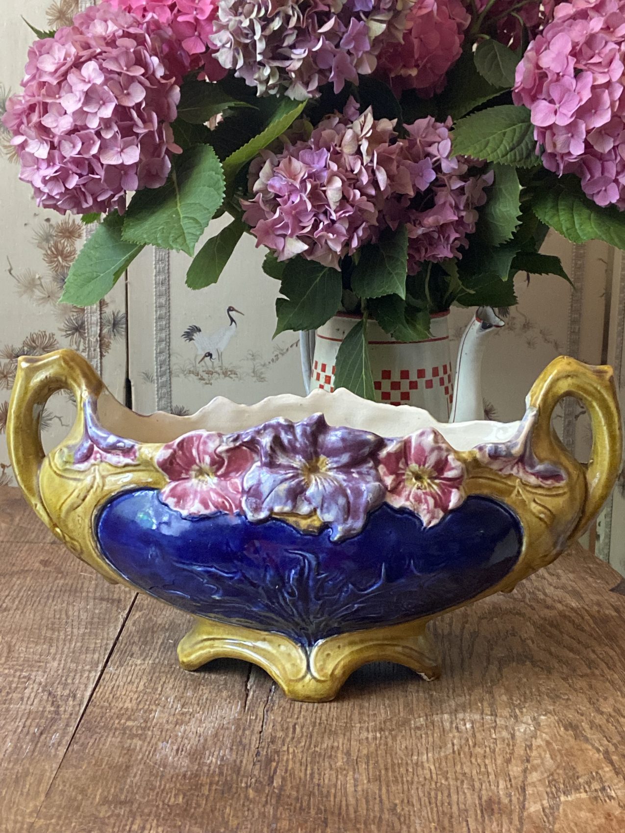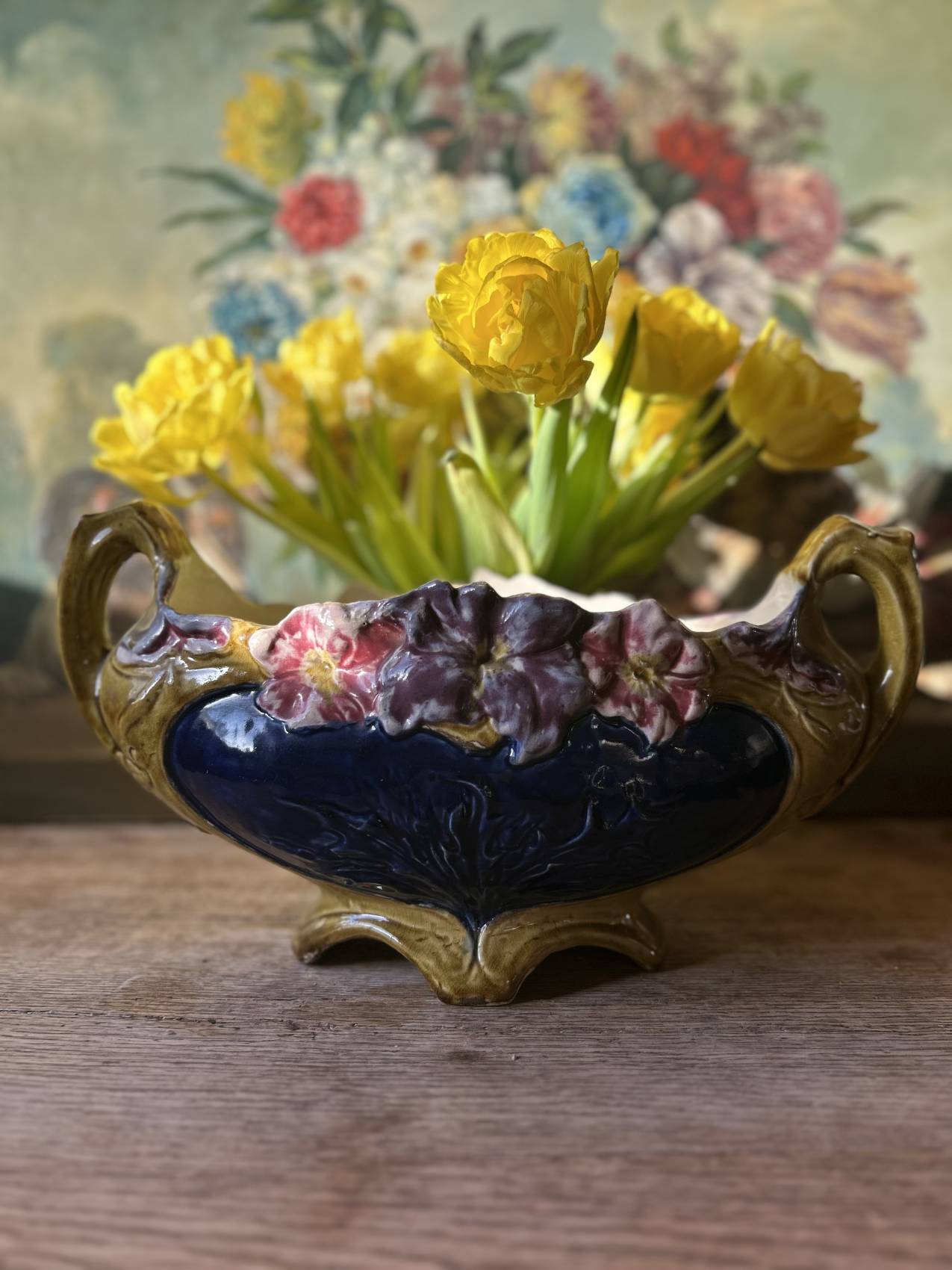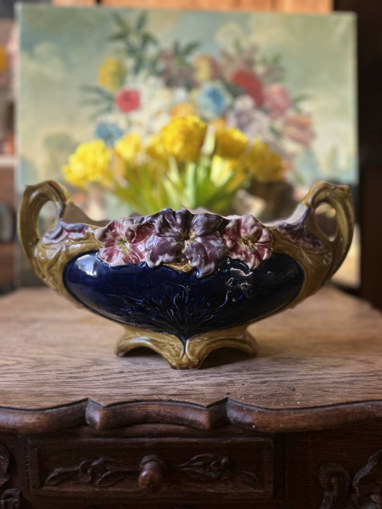 Cette jardinière là, c’est un opéra fleuri à elle seule : les couleurs sont subtiles, les reliefs délicats, et il y a ce charme ancien, presque bucolique, qui donne envie de cueillir des pensées sauvages rien que pour la remplir Et puis la signature Francis Masse, ce n’est pas rien : on est sur une pièce de collection, mais sans snobisme. Juste ce qu’il faut de beauté, sans forcer.