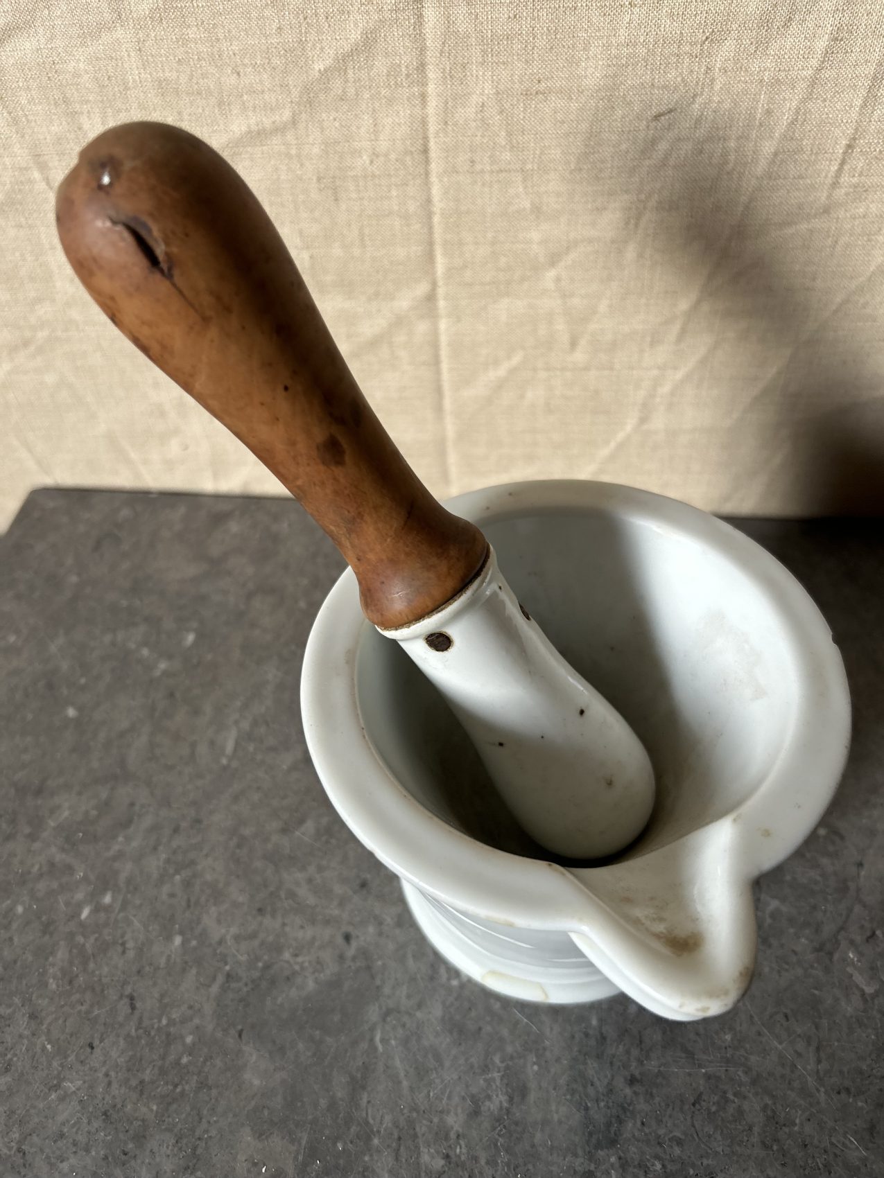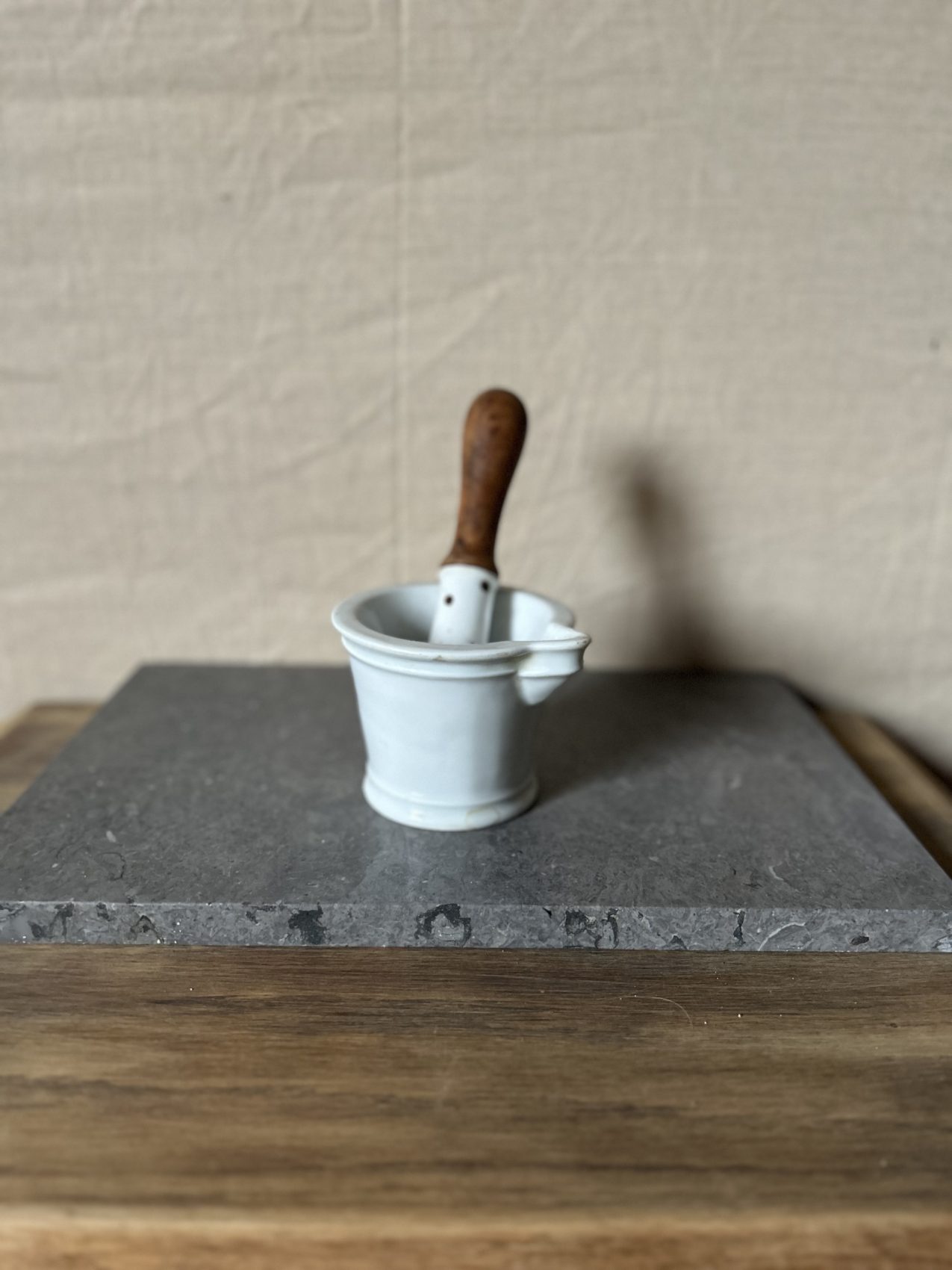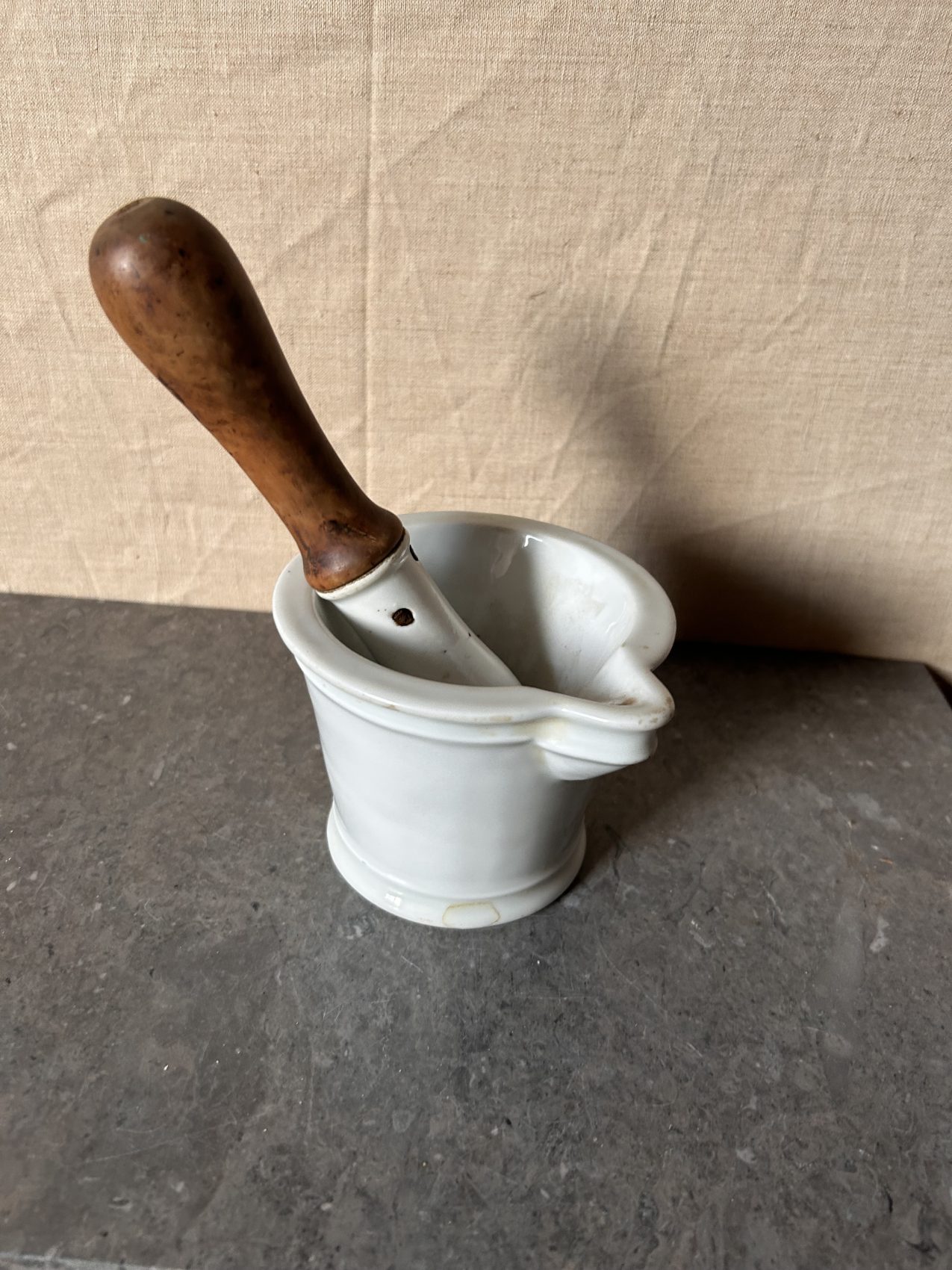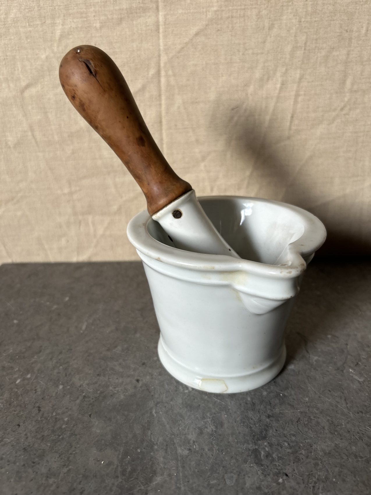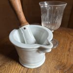 Ce modèle est en porcelaine lourde, avec son manche en bois d’origine, pensé pour absorber les chocs et accompagner les gestes précis du pharmacien.