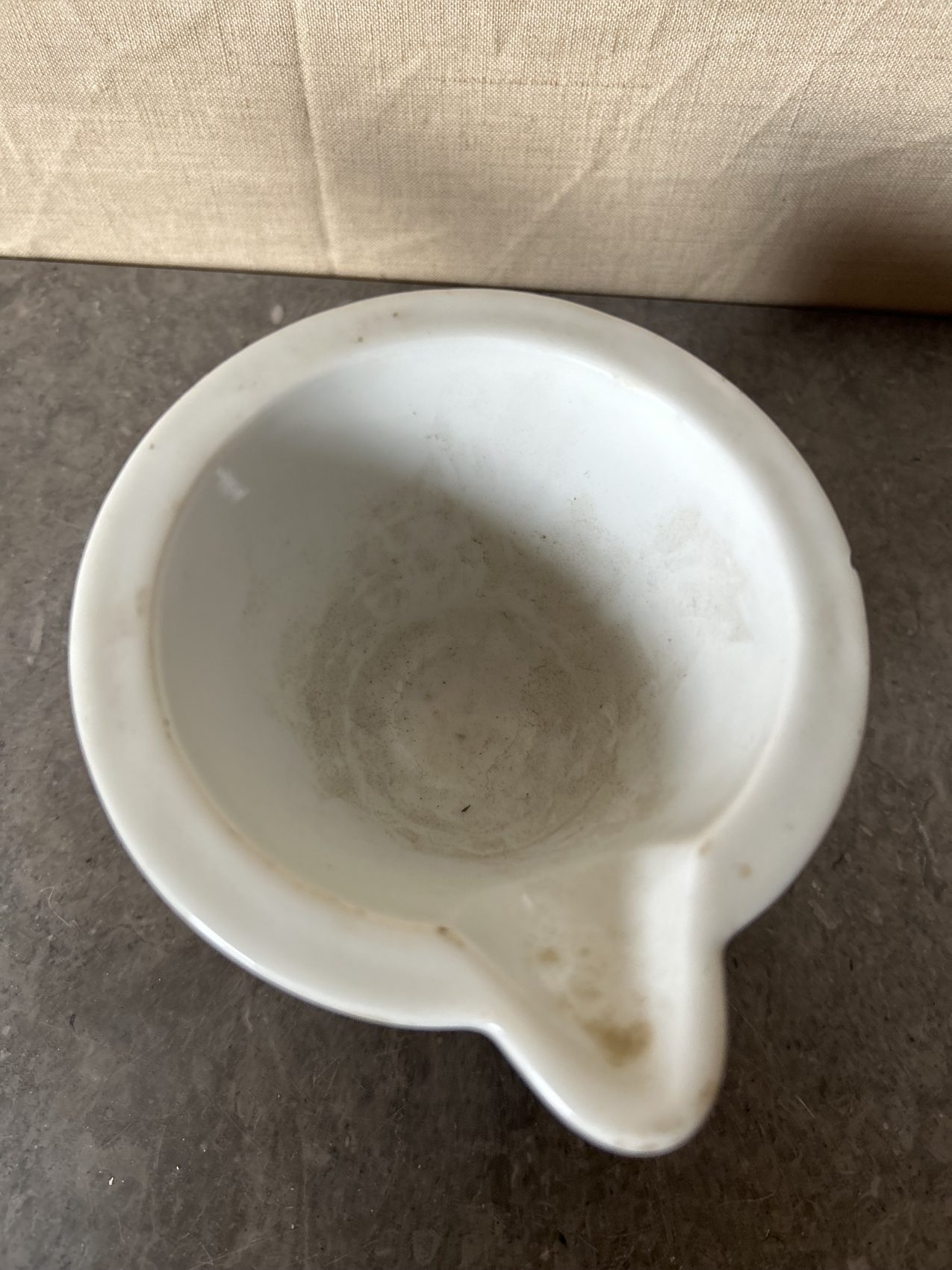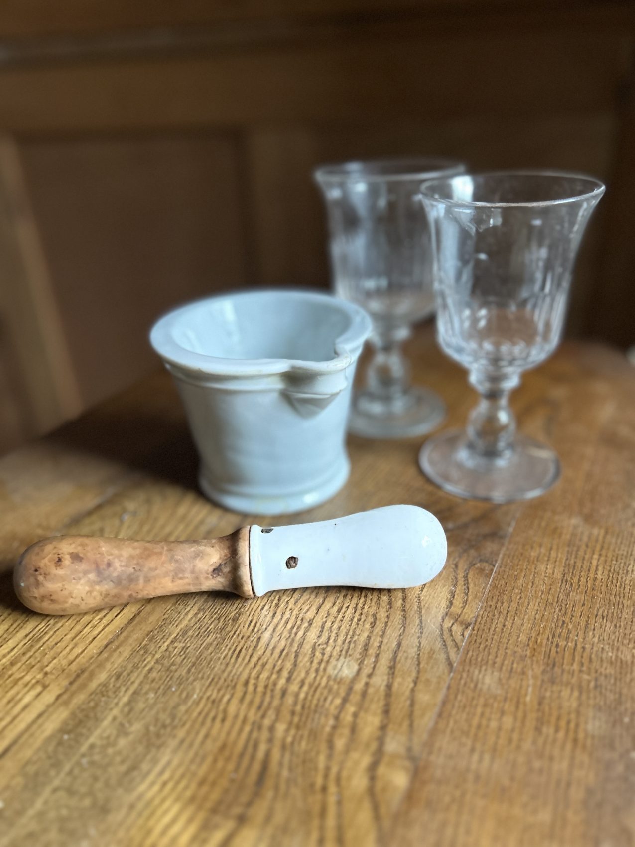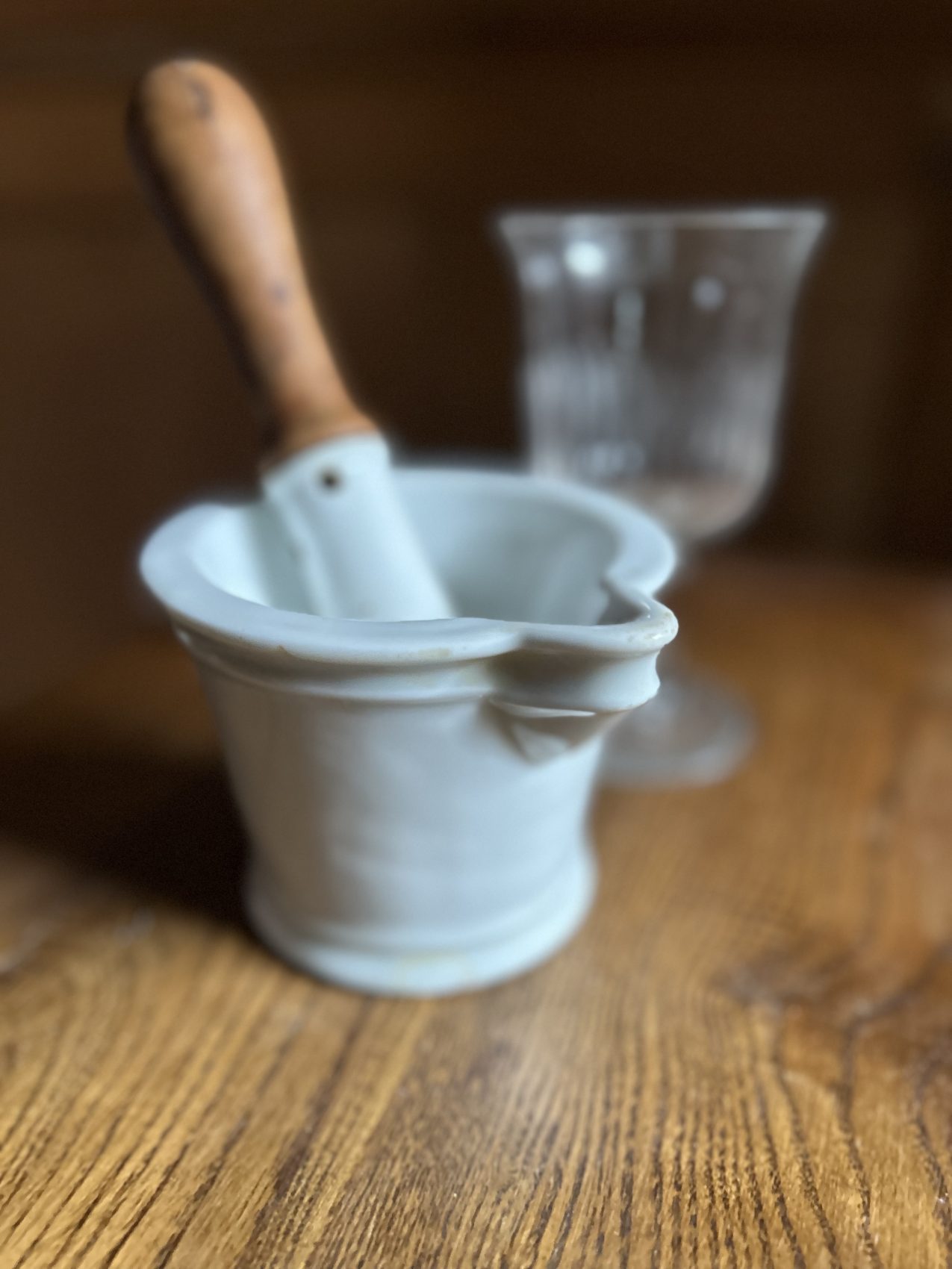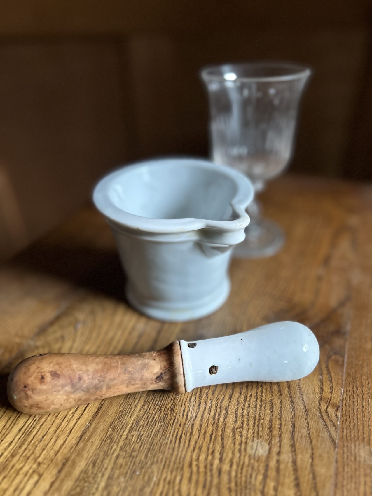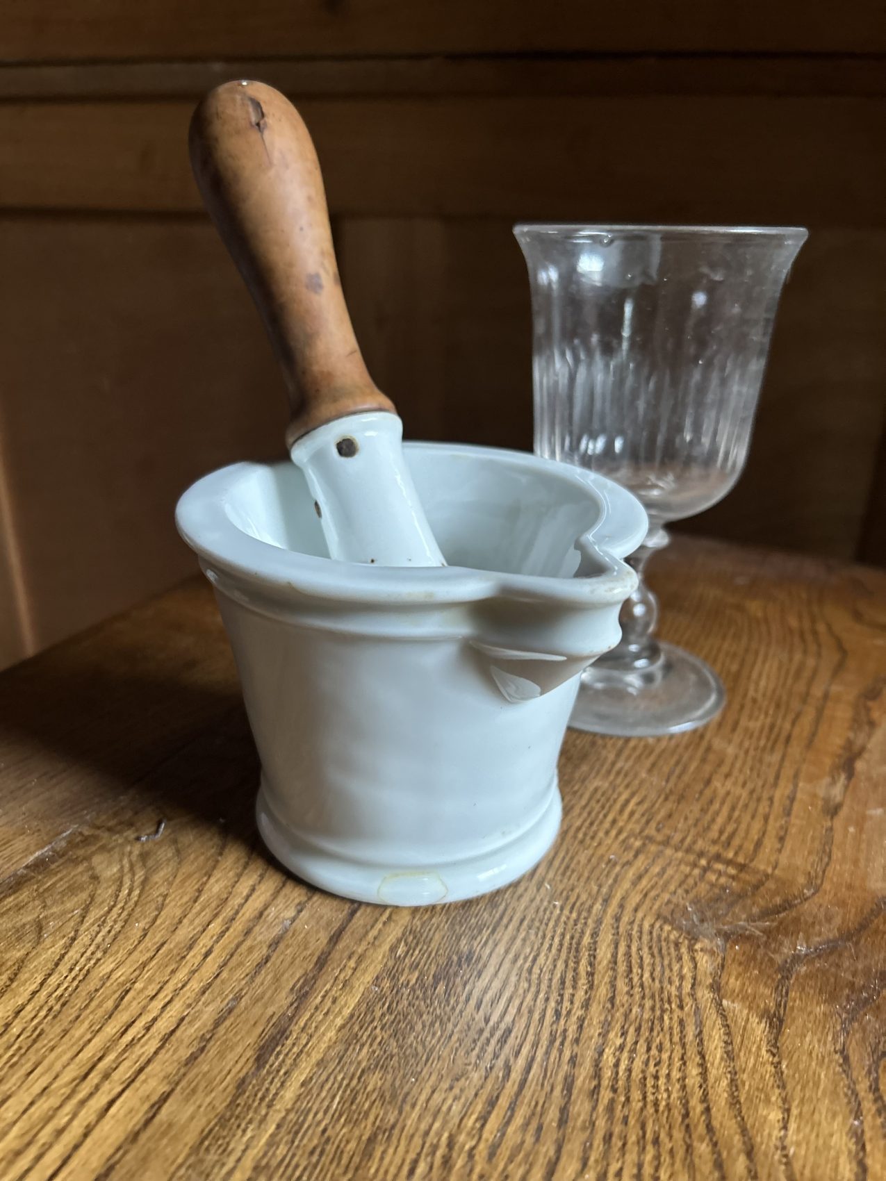 Ce modèle est en porcelaine lourde, avec son manche en bois d’origine, pensé pour absorber les chocs et accompagner les gestes précis du pharmacien.