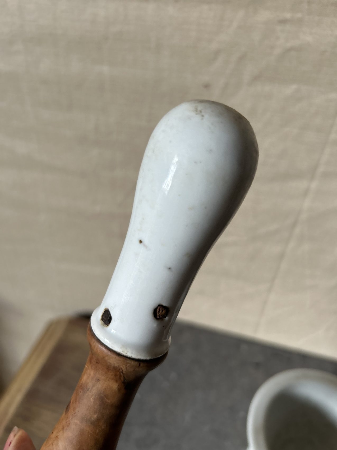 Pilon de pharmacie ancien en porcelaine et manche en bois – Fin XIXe / début XXe siècle