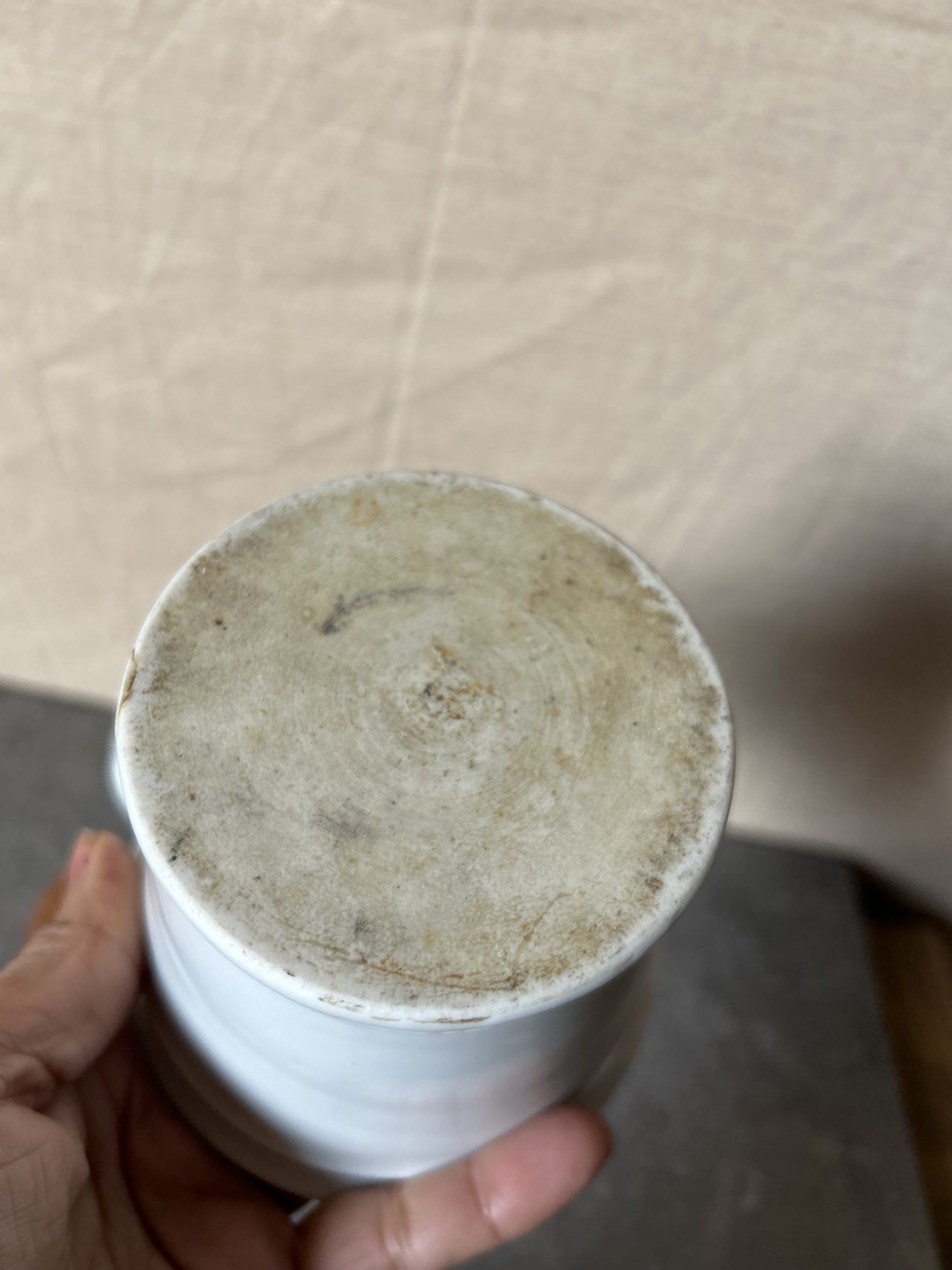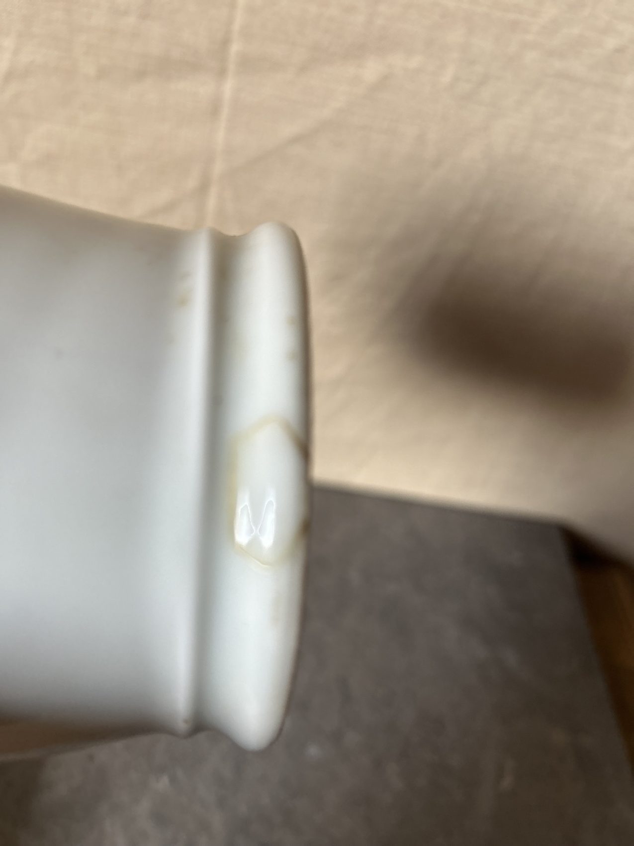La porcelaine est épaisse, bien blanche, le manche en bois a une belle patine naturelle, sans excès. Il a vécu, il a servi, mais il est resté digne.