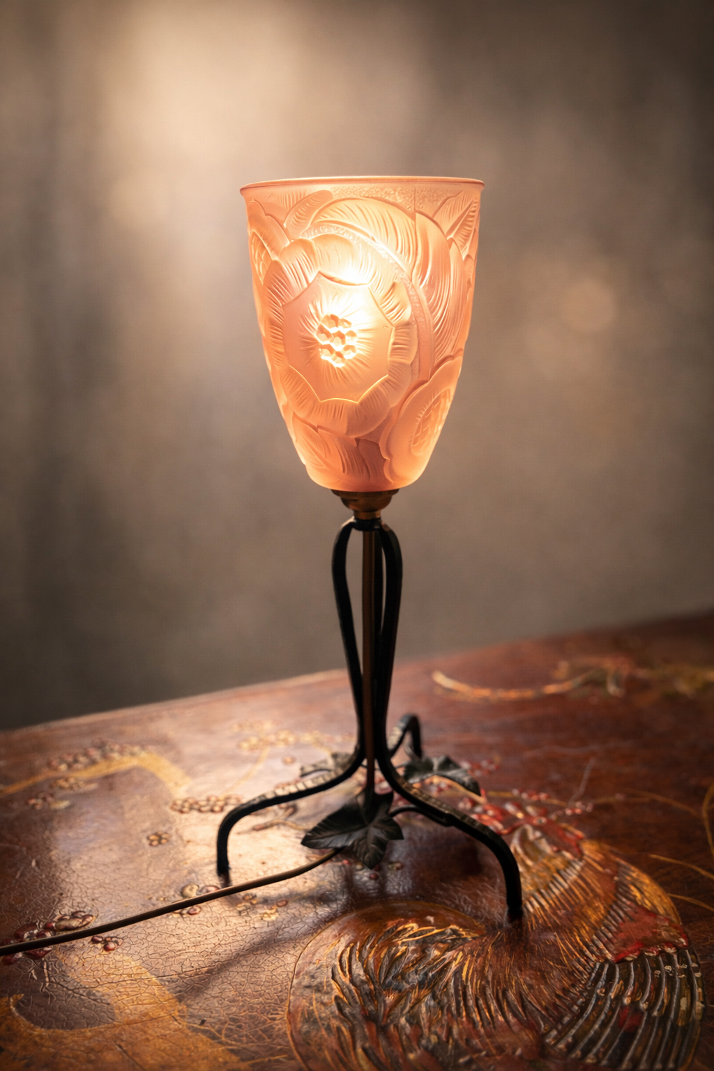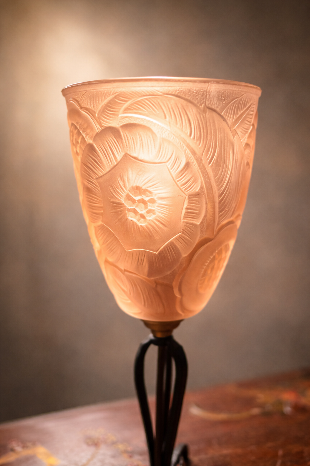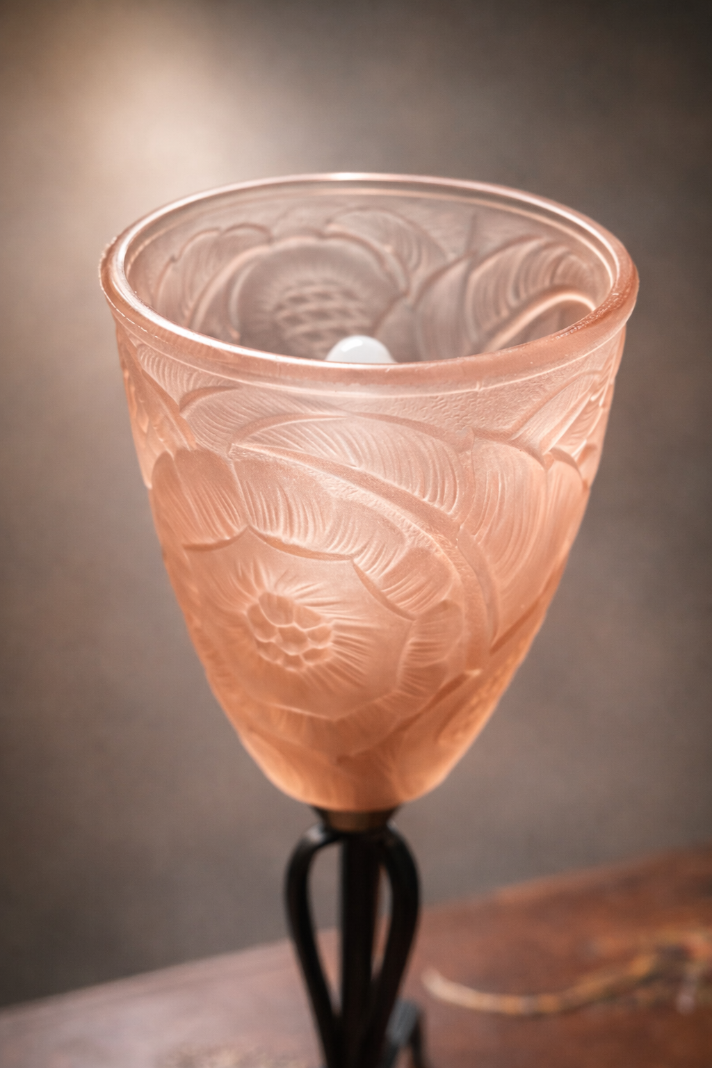 Avec sa tulipe en verre rose aux motifs de fleurs stylisées et son pied en fer forgé typique de l’époque Art Déco, elle a ce petit supplément d’âme qu’on ne trouve plus aujourd’hui.