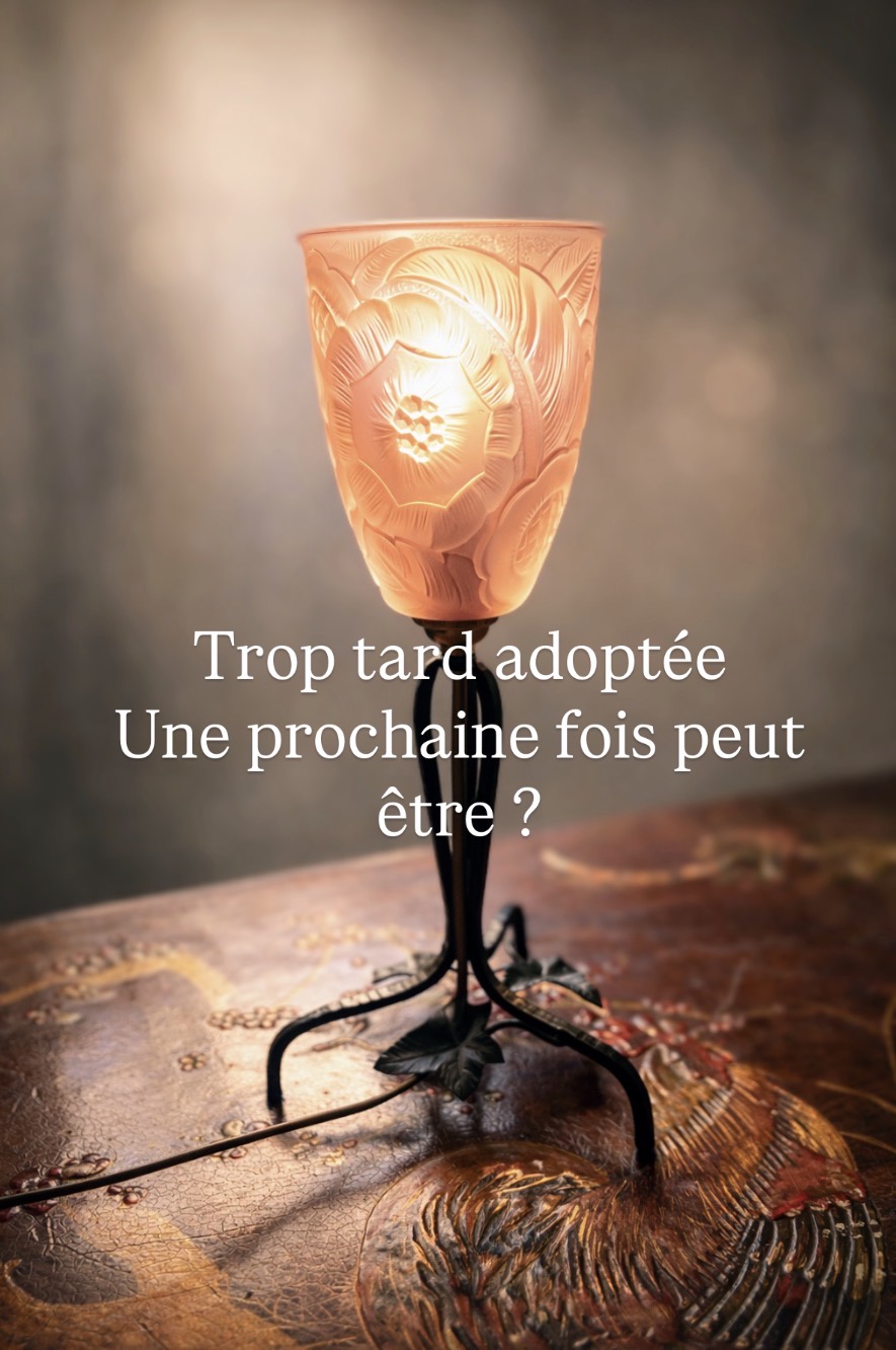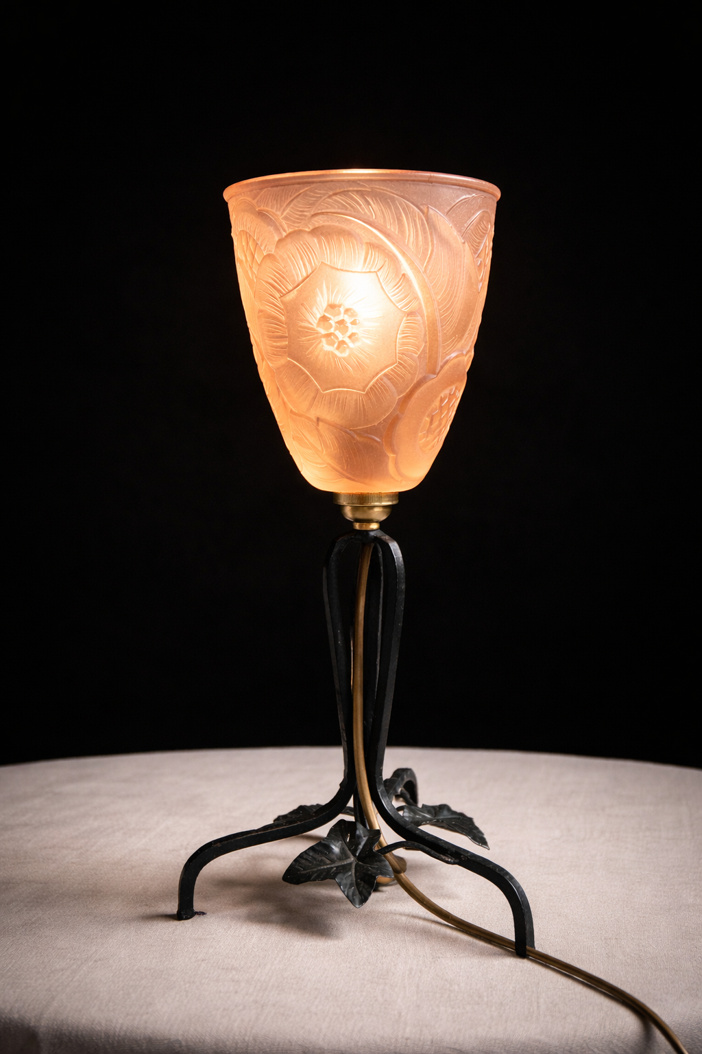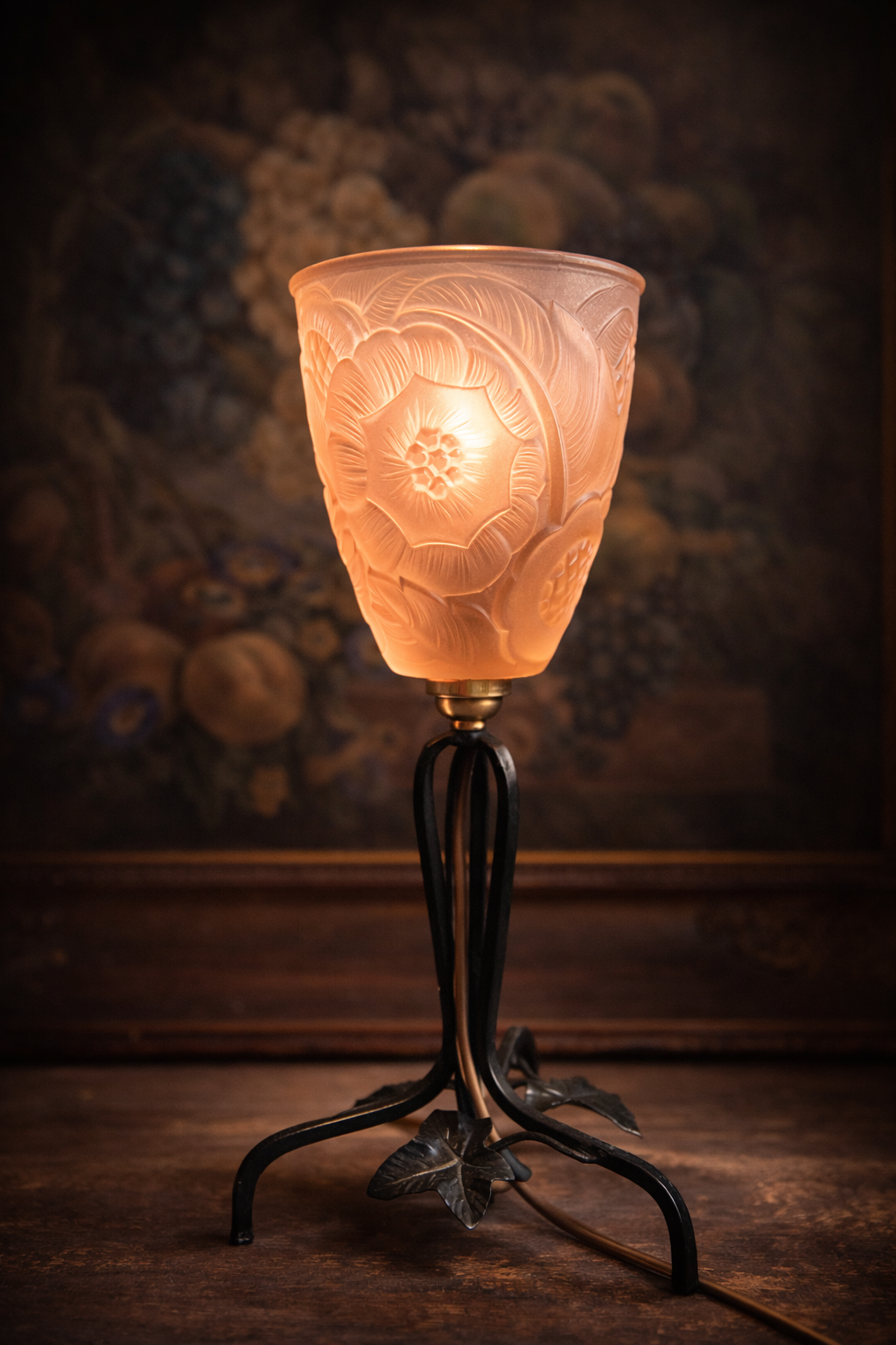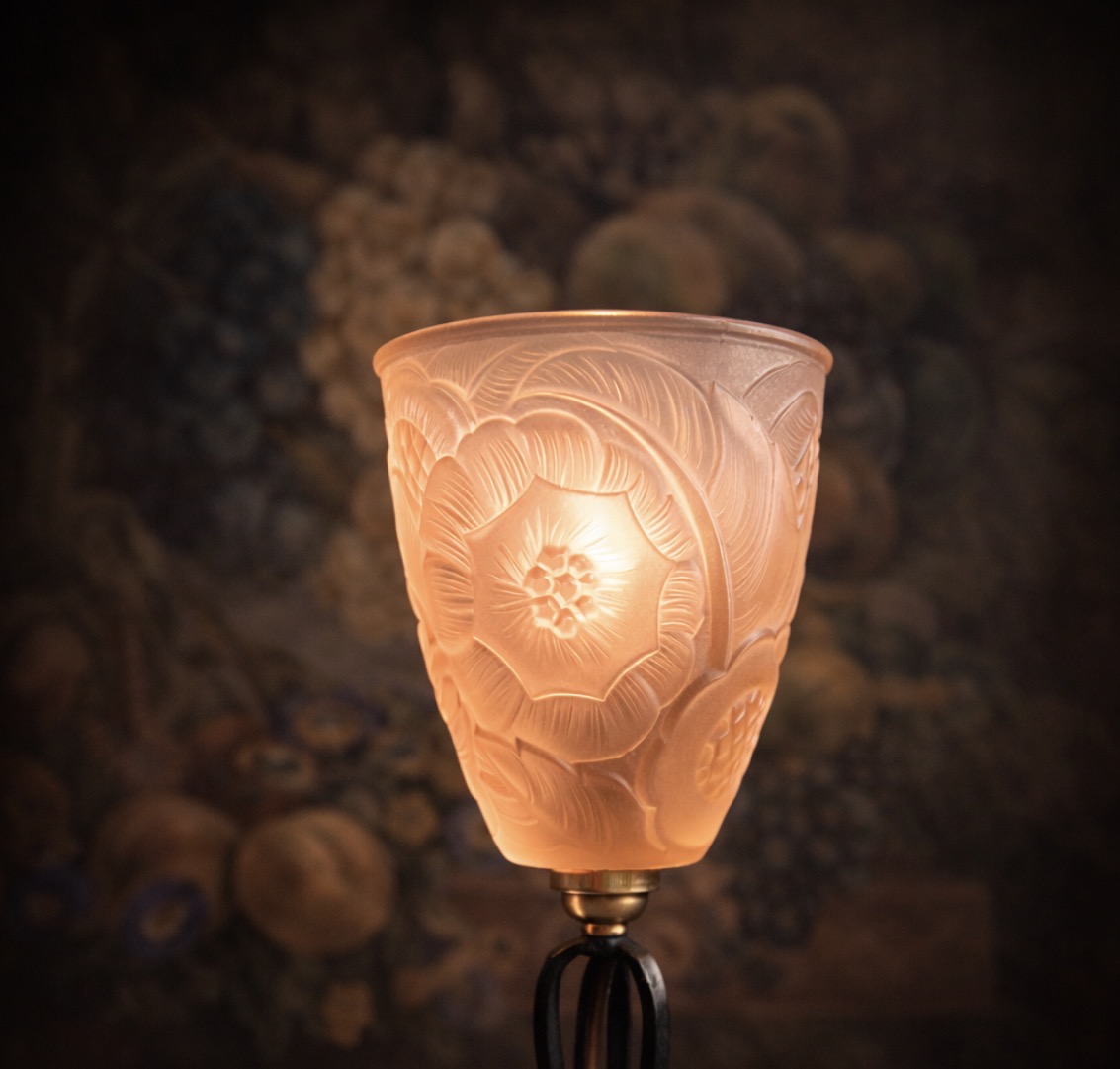 Avec sa tulipe en verre rose aux motifs de fleurs stylisées et son pied en fer forgé typique de l’époque Art Déco, elle a ce petit supplément d’âme qu’on ne trouve plus aujourd’hui.