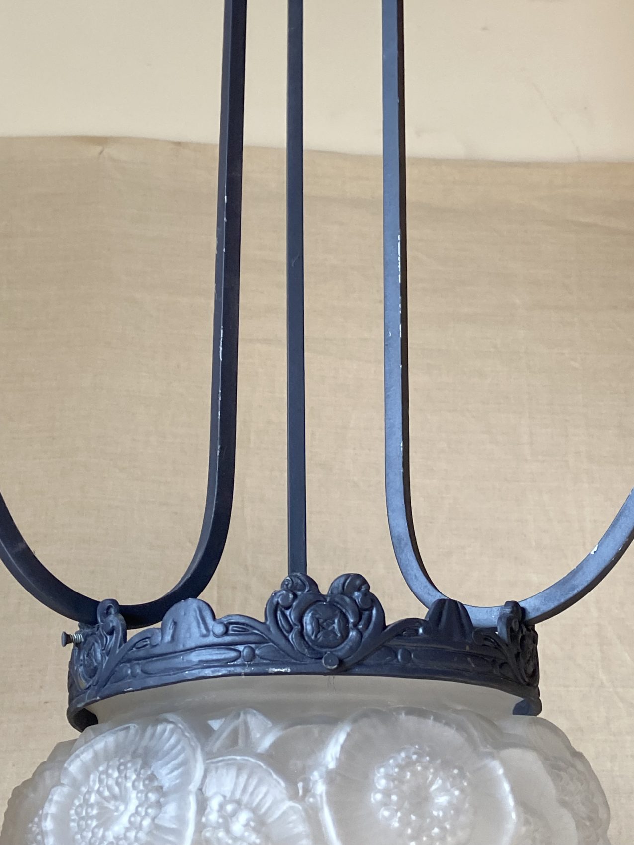 Élégant lustre Art déco à trois bras de lumière, largeur maximale 57 cm, hauteur totale depuis le socle plafond : 82 cm. Globe central et tulipes en parfait état, pièces d’origine qui apportent toute la noblesse de cette époque.