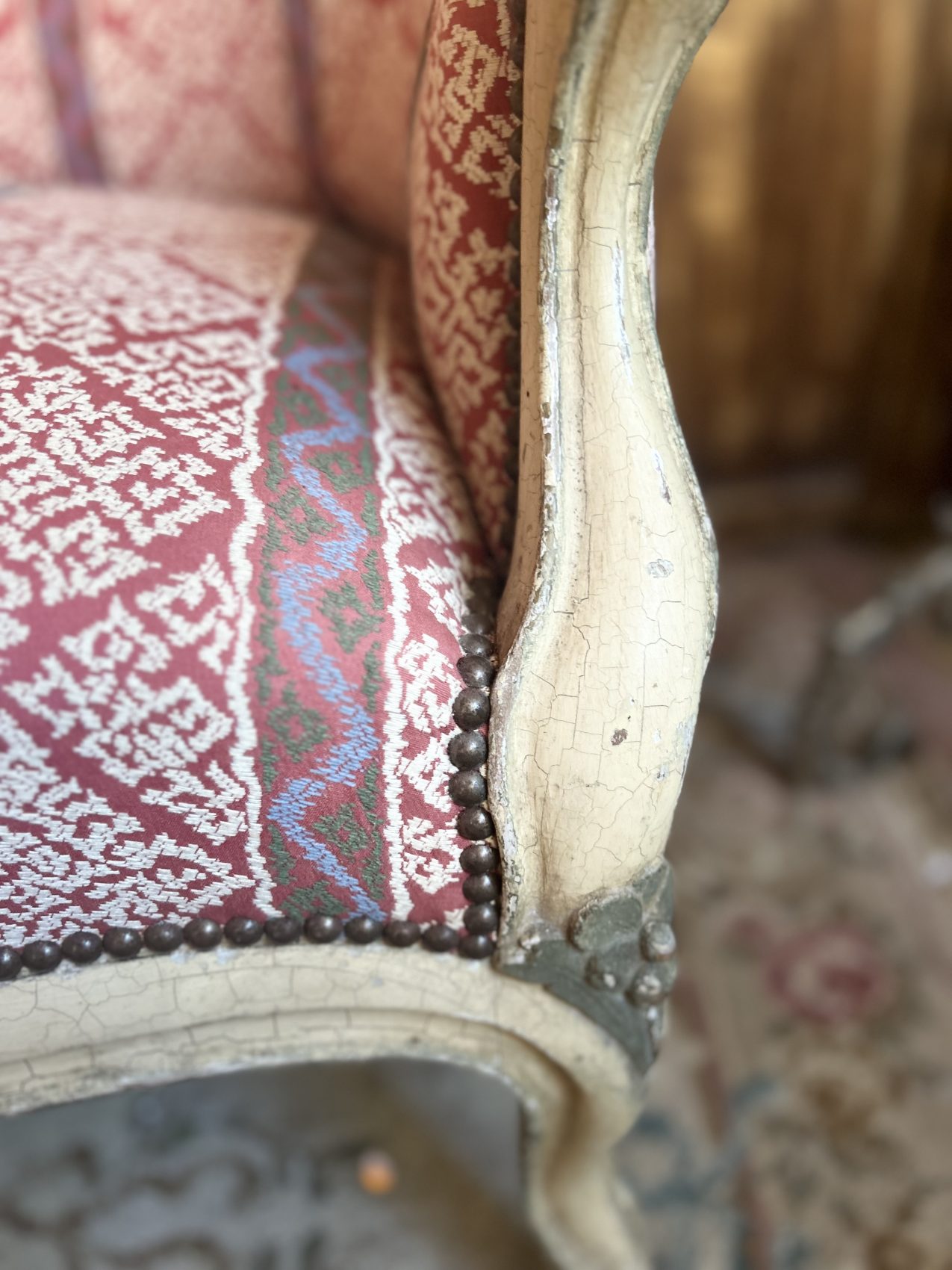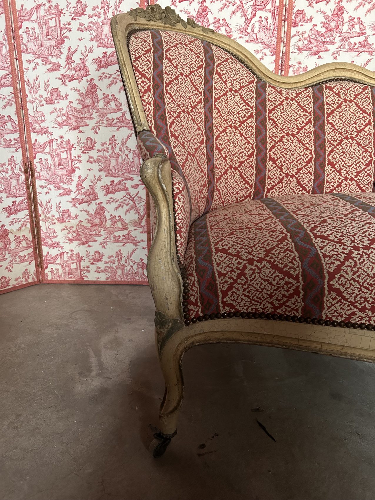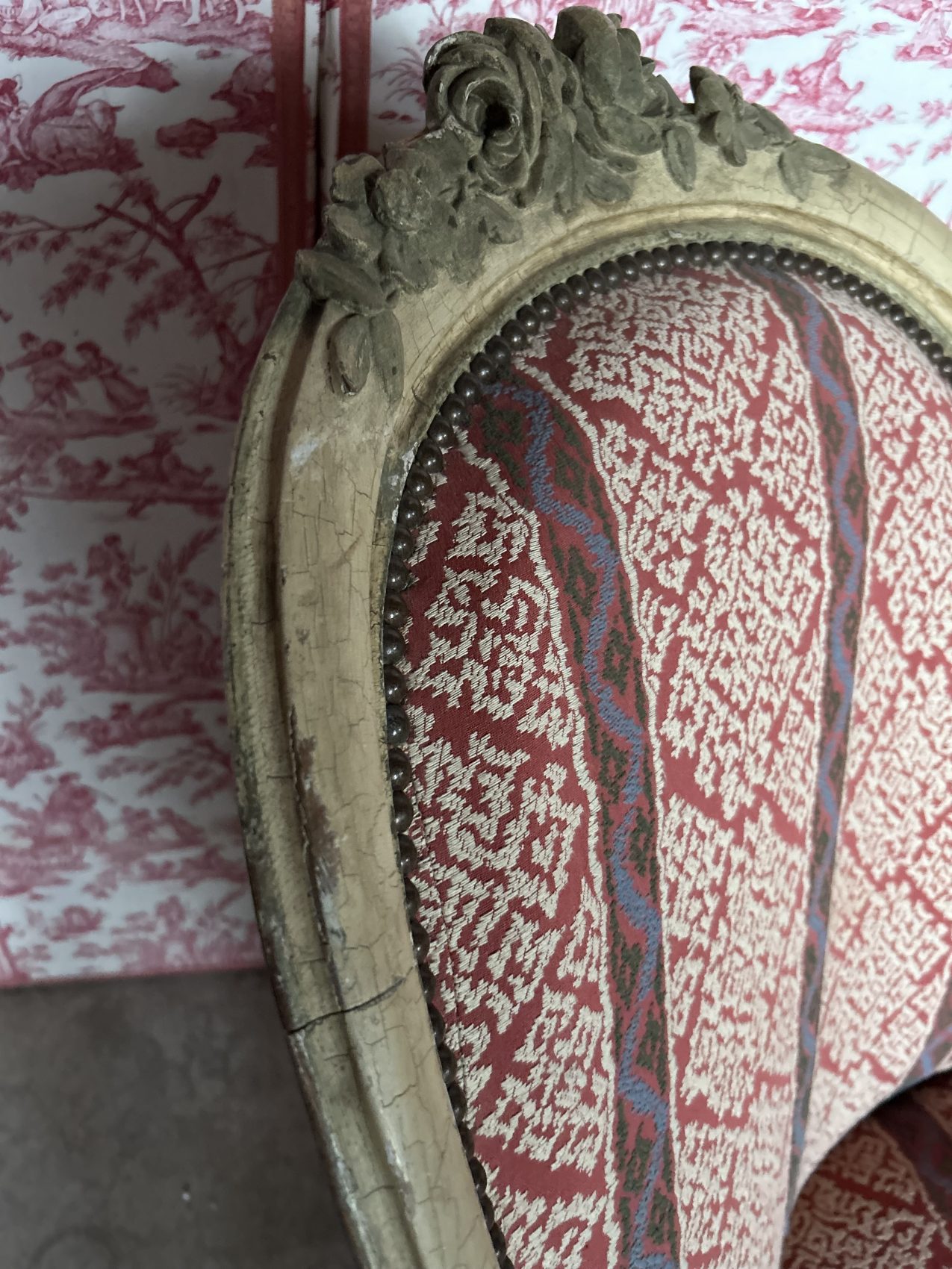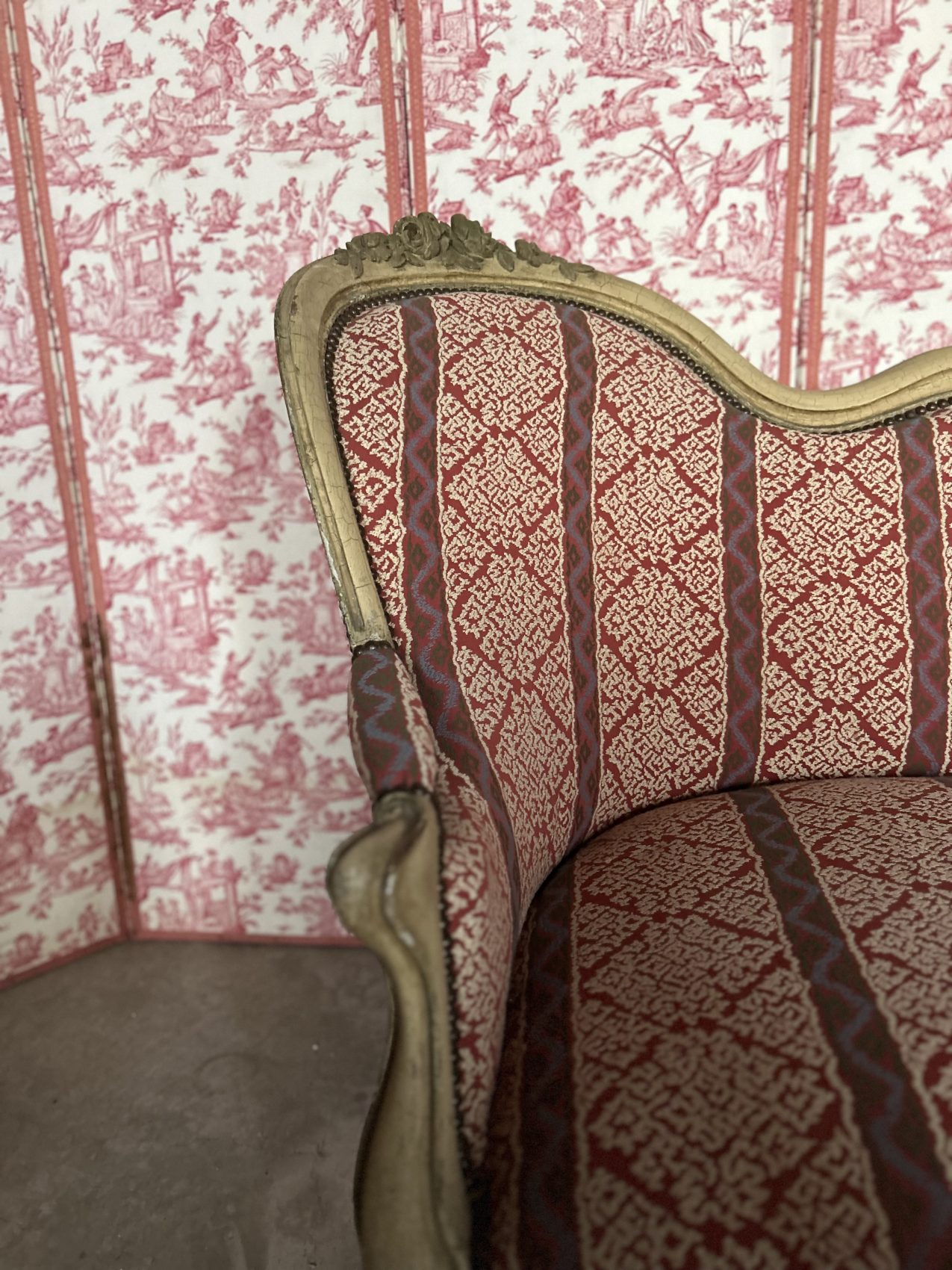 Le bois est patiné blanc, une finition qui met en valeur les sculptures et apporte une douceur visuelle très appréciée, le réfection du tissu et de l’assise date elle du XXe siècle.