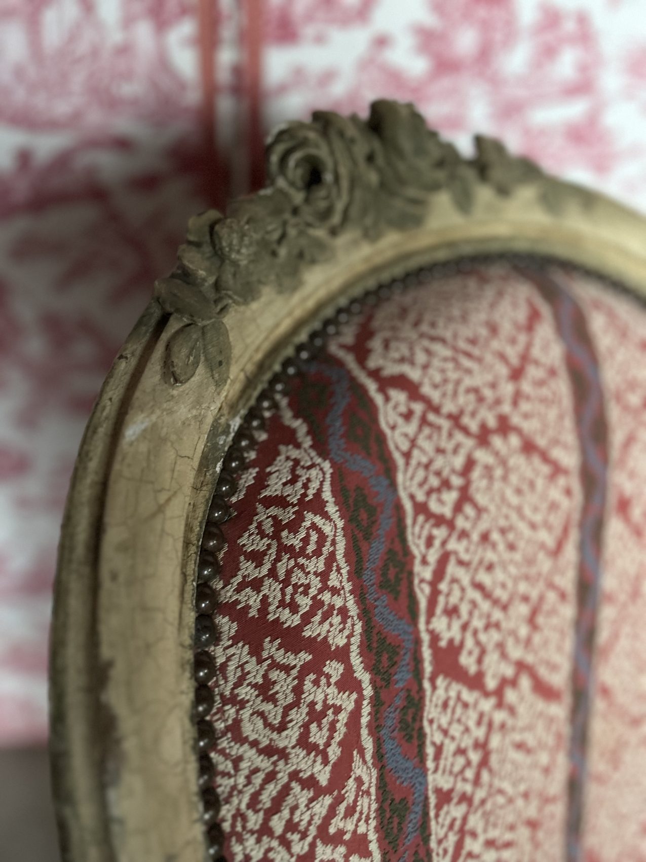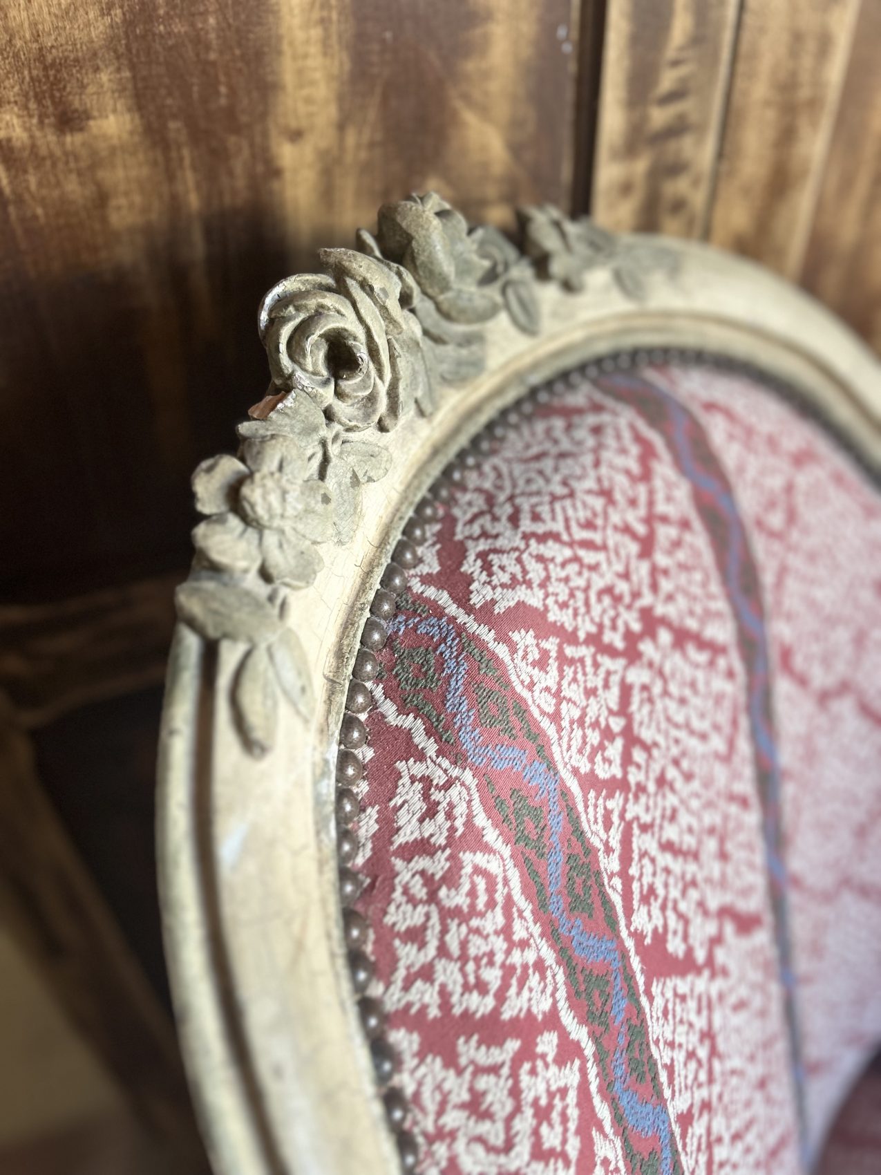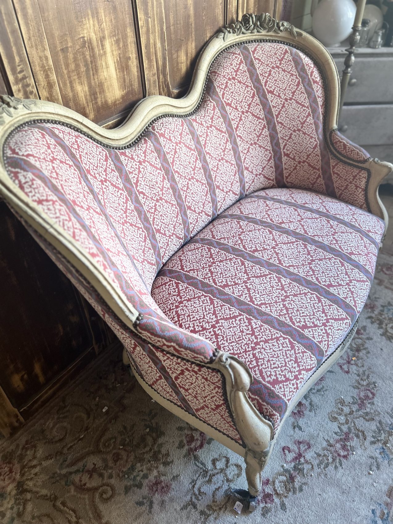 Le bois est patiné blanc, une finition qui met en valeur les sculptures et apporte une douceur visuelle très appréciée, le réfection du tissu et de l’assise date elle du XXe siècle.